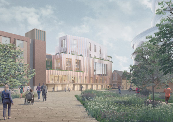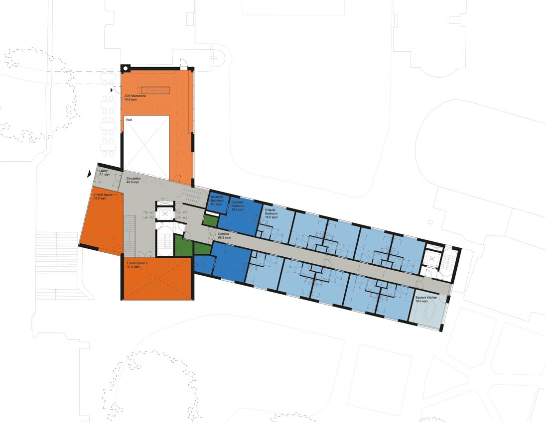 The proposal is based on two simple intersecting gabled forms — echoing the defining existing forms of the College — with key social and informal study spaces located at the intersection of the two main forms. Double and triple-height spaces link the ground floor spaces up to the upper levels. Three ground floor passageways and a covered walkway create vital links between previously separated Quads and address decades-old circulation issues in this area of the College.