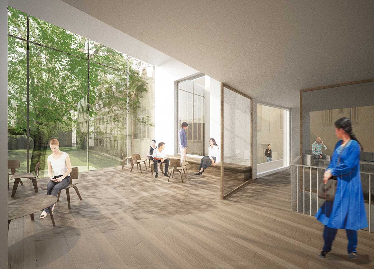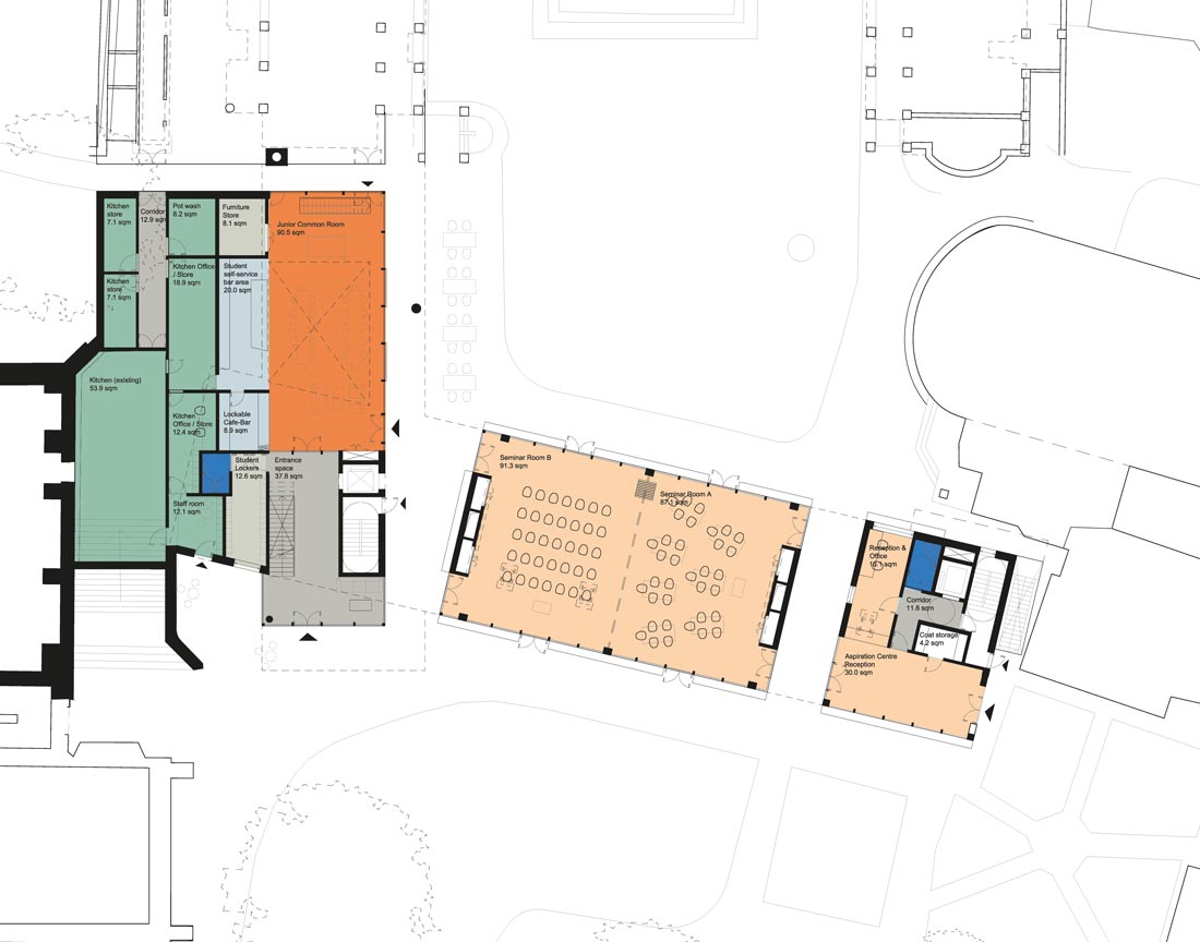 A key element of the project was the Undergraduate Centre, designed to strengthen the mixed undergraduate community by providing spaces for them to socialise, work and engage with each other. The other was an Aspiration Centre, envisaged as an inviting and open focal point with two large seminar rooms for visiting young people considering studying at Oxford and attending summer schools.