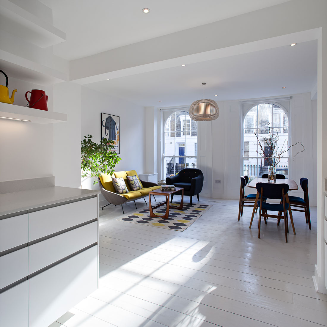 This was a radical transformation of a small shabby flat with some down-at-heel garages to the rear into a stylish home suitable for two professionals sharing, all while meeting the demands of its conservation area setting.