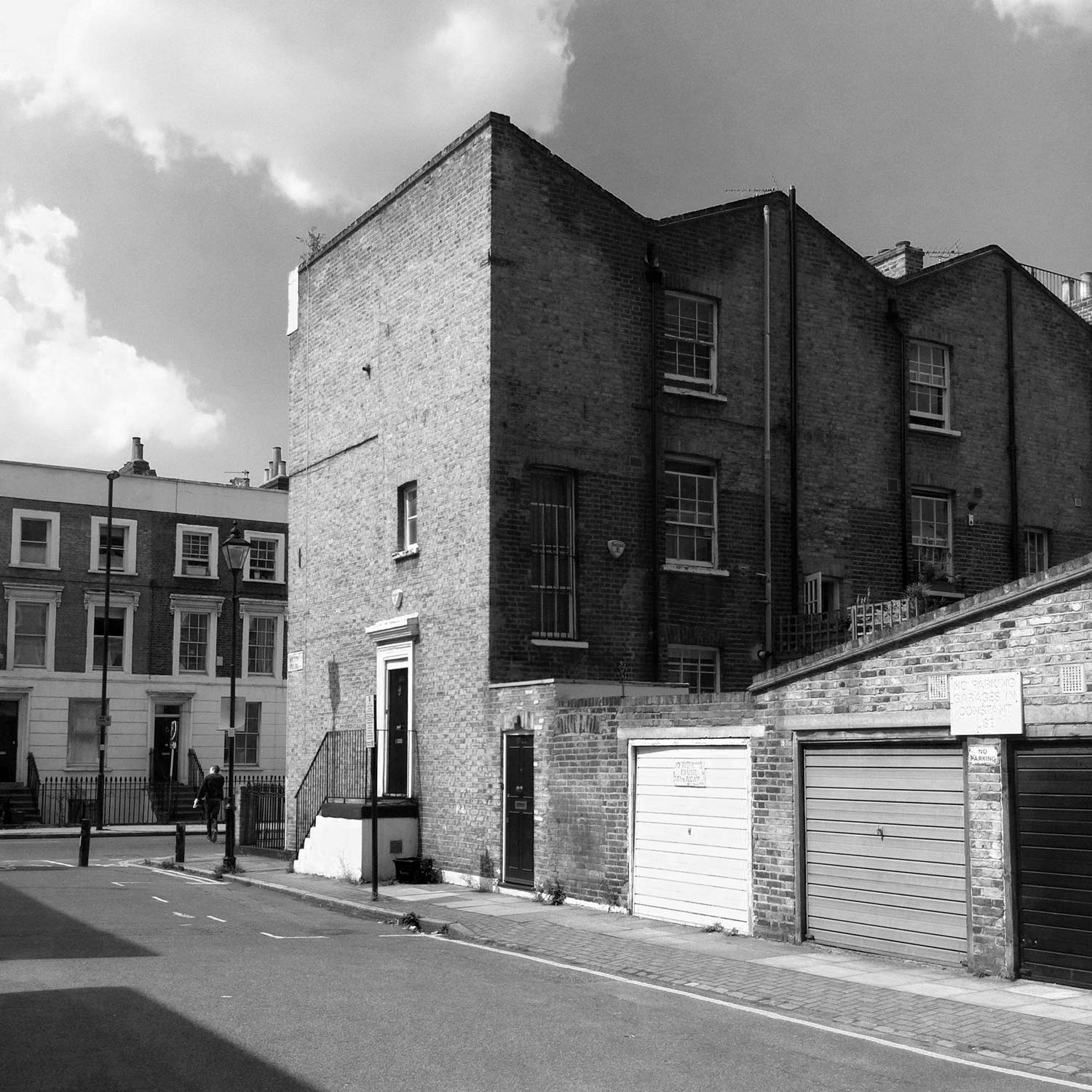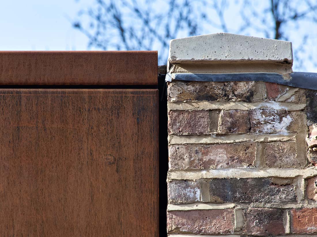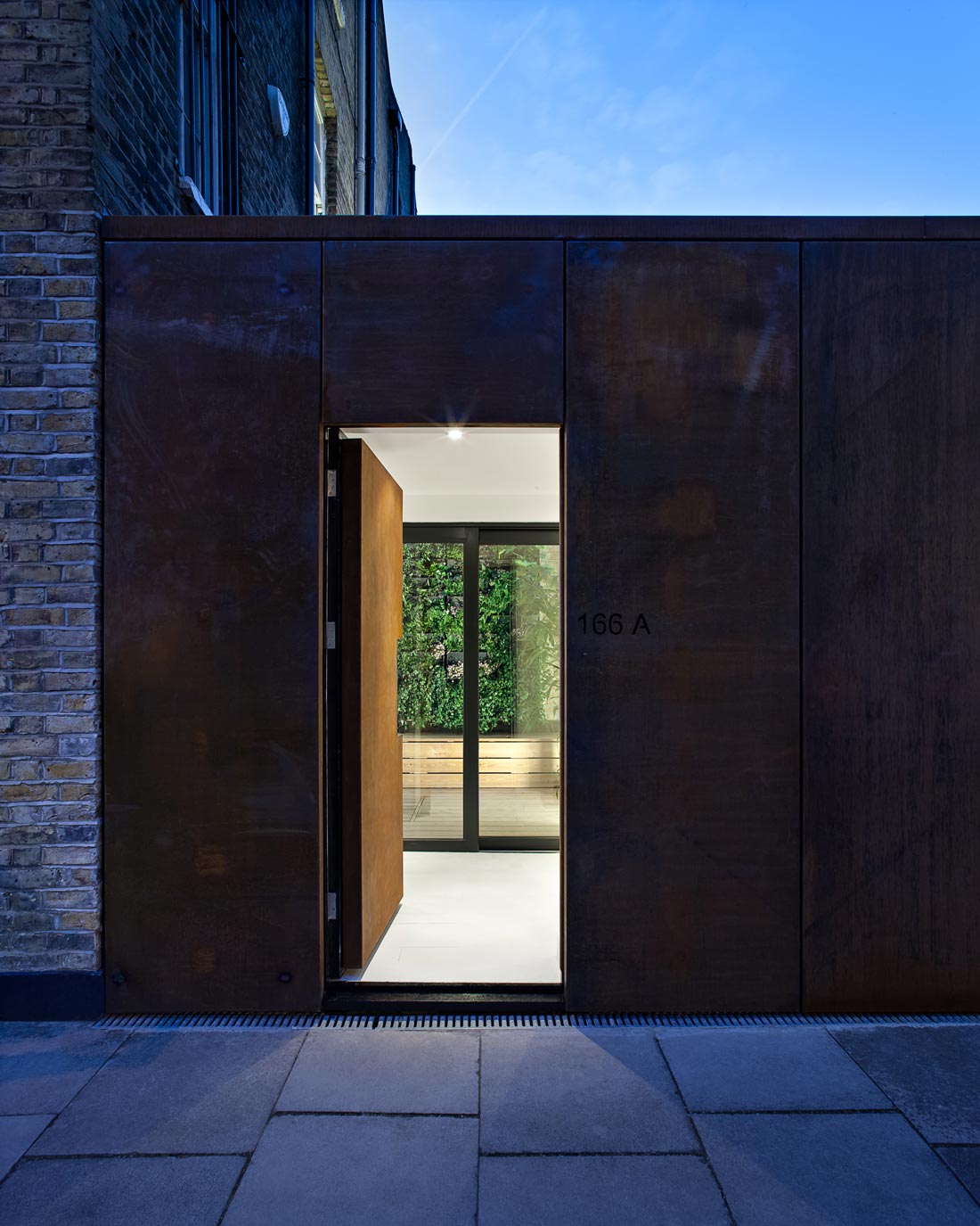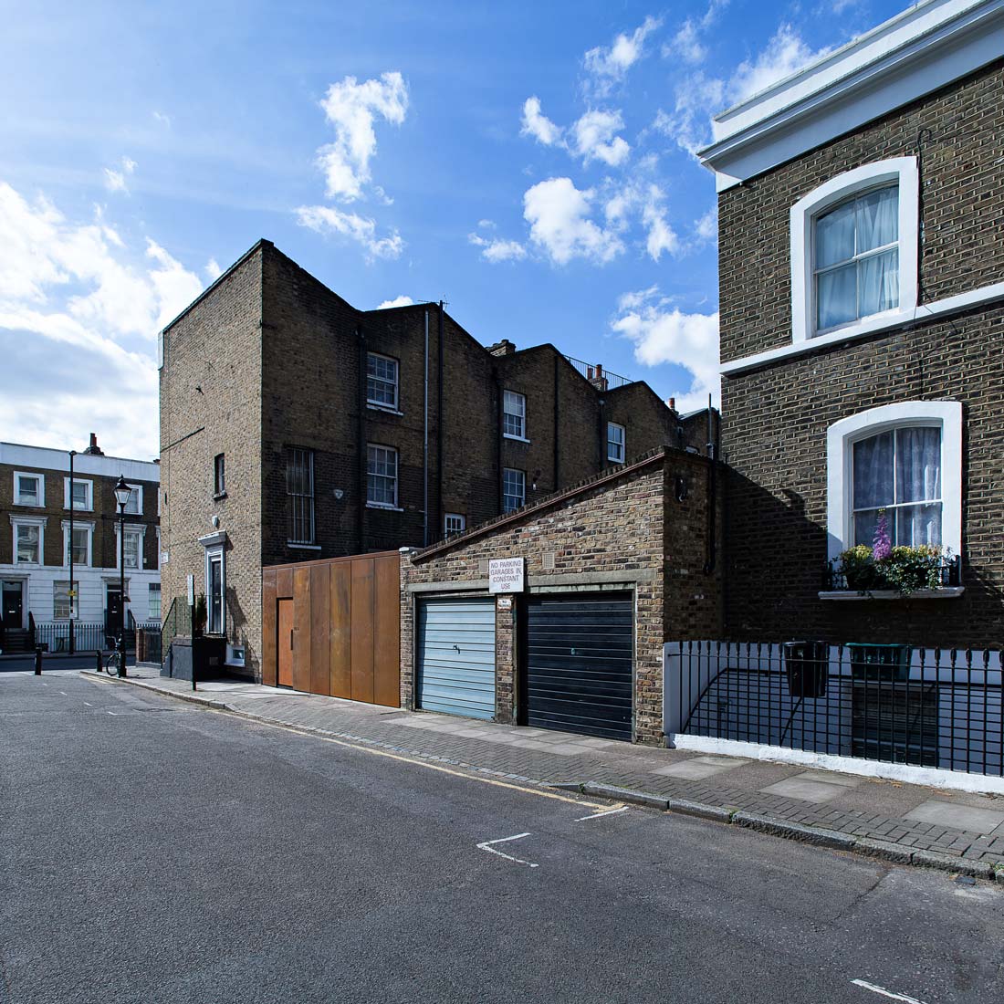 Surrounded by listed Georgian buildings, the Cor-ten steel façade feels contemporary yet complementary to the warm brick tones of the neighbouring properties and the materiality of the remaining garages.