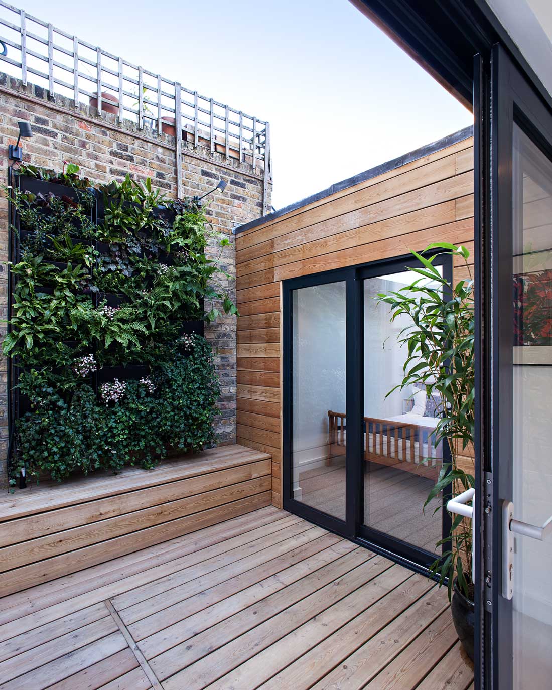 A new entrance lobby, bedroom suite and kitchen all face onto a larch-lined courtyard, accessed via sliding doors. Vertical planting on the south-facing wall of the protected courtyard provides an attractive, peaceful oasis in this busy urban location.