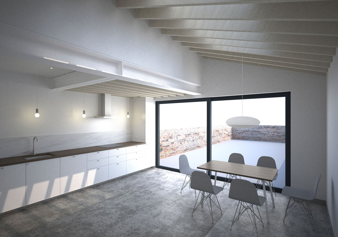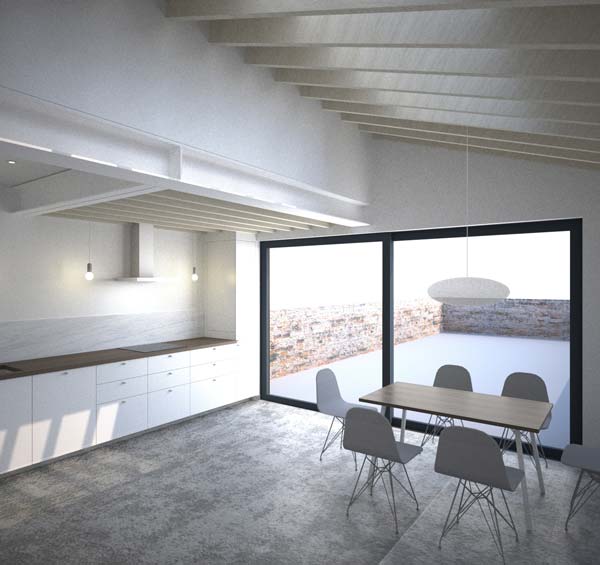 The roof profile of the new extension creates a roof terrace for the flat above, and rooflights in the pitched roof flood the ground floor space with natural light.