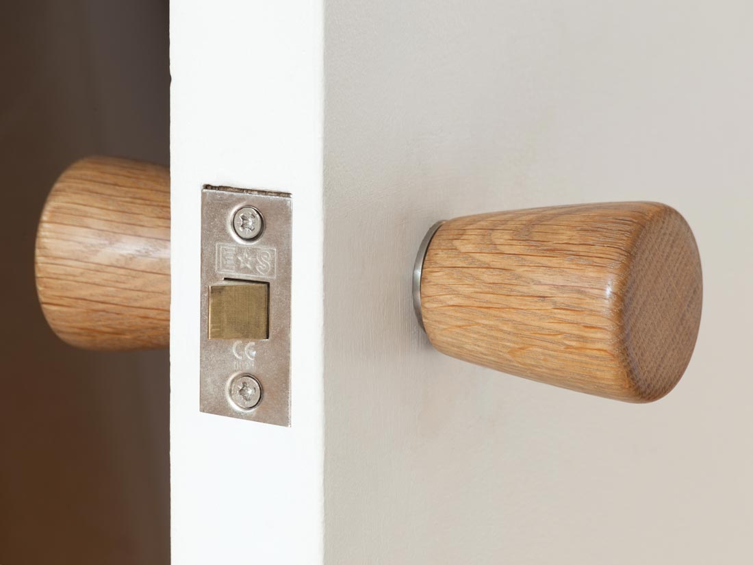 The hallway is reconfigured for extra generosity and lined with storage, with pocketed sliding doors to allow spaces to be configured as necessary. Bespoke turned oak door knobs were designed especially for this project.