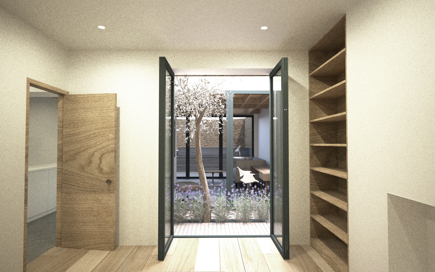 The new extension replaces an existing side-return extension and adds an additional 21m² to form an open-plan dining and living space by the garden. A new 5m² central courtyard brings light into the kitchen and enables a new second bedroom, making the flat suitable for a young family or for a home work space. A second bathroom and much more storage along the corridor makes the flat far more practical to live in.