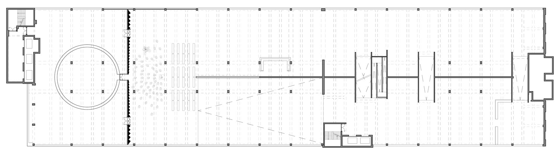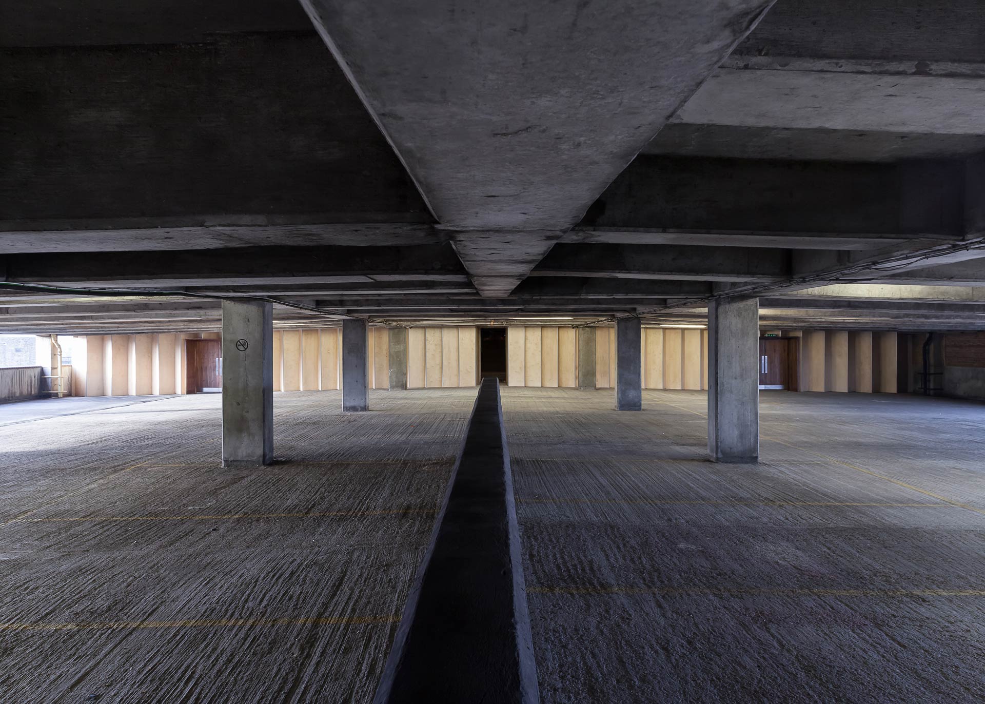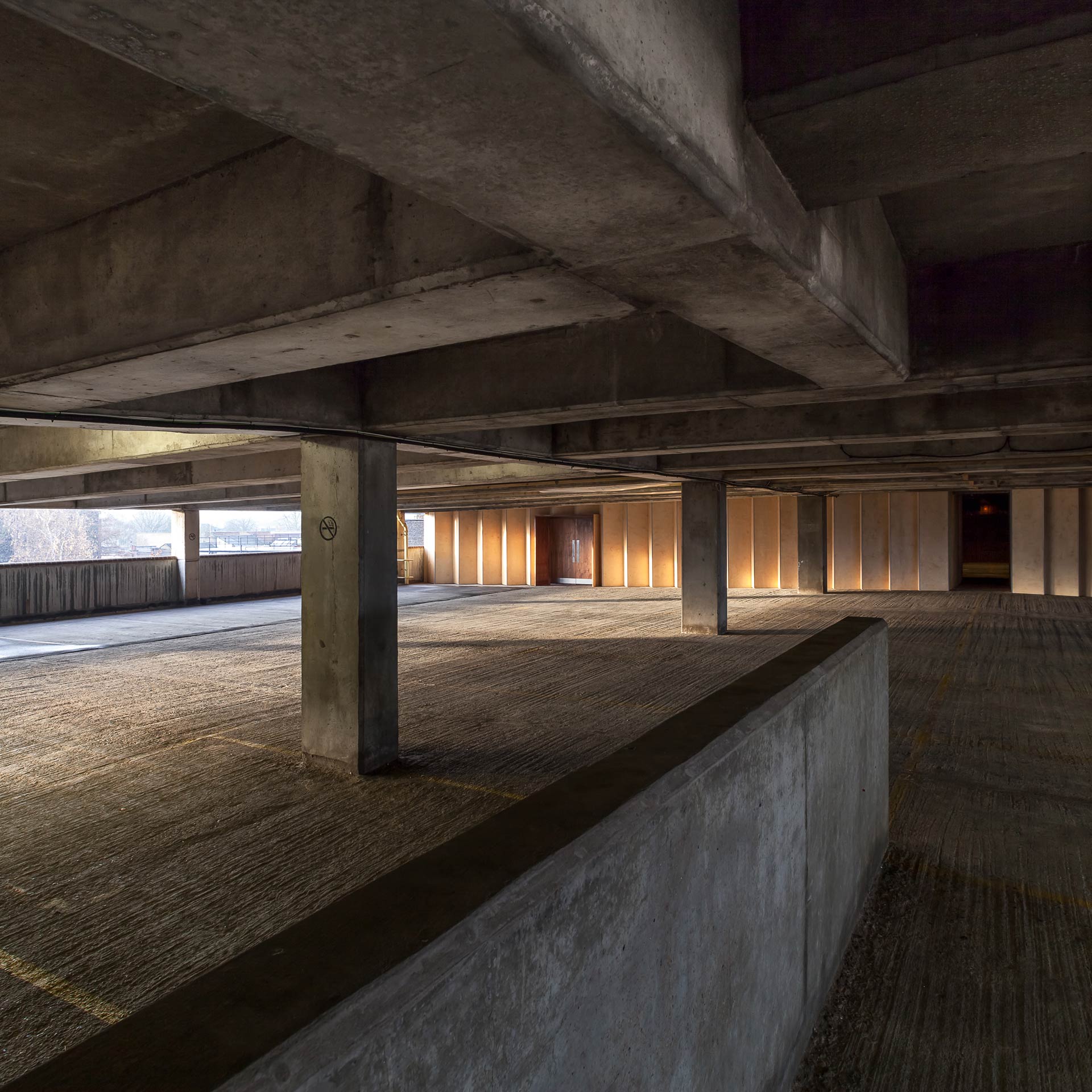 Shallow valleys in the centre of the wall gradually unfold across the width of the car park into much larger, deeper bays at the outer areas. The curtain-like form plugs into the raw dimensions and character of the original covered car park, spanning its full 33 metres.