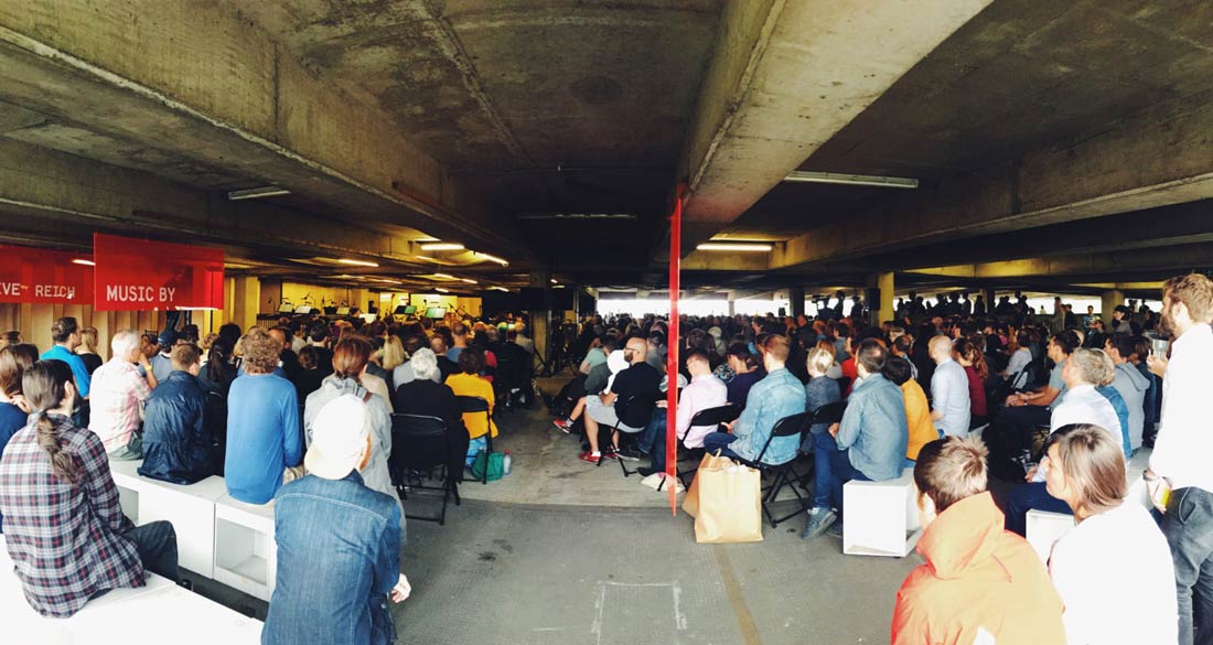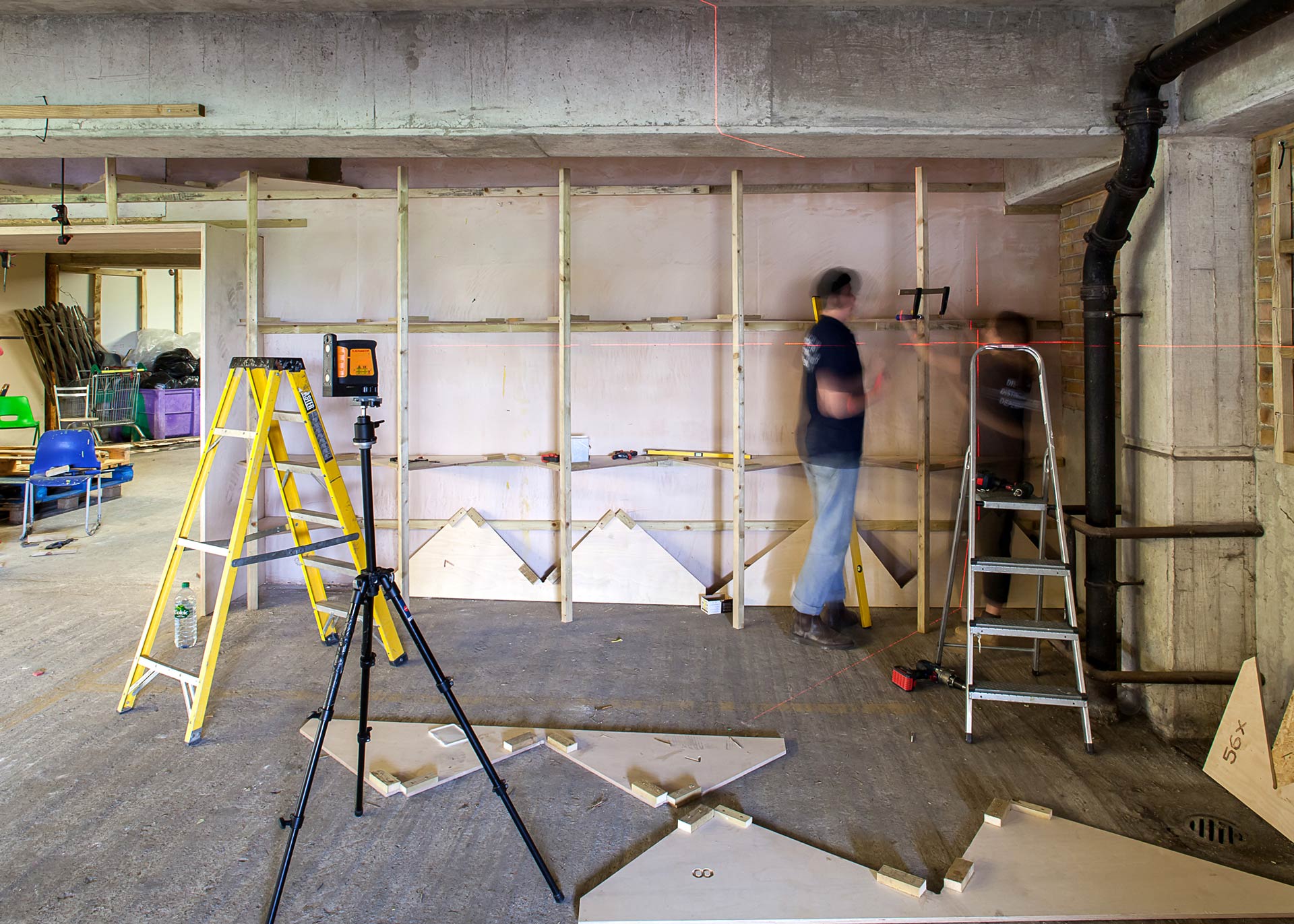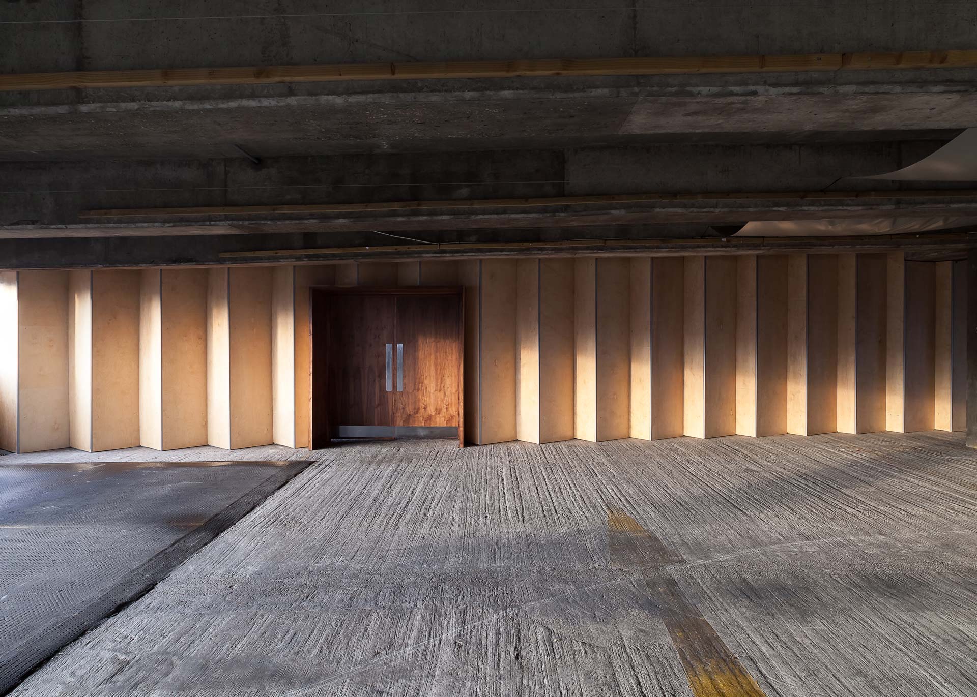 Concert Wall is a concertinaed plywood screen which provides an acoustic and visual backdrop for live performances in an event space in the Peckham multi-storey car park. The project was developed with resident orchestra Multi-Storey and acousticians in order to ensure performers and large audiences could better hear and enjoy live music onsite.