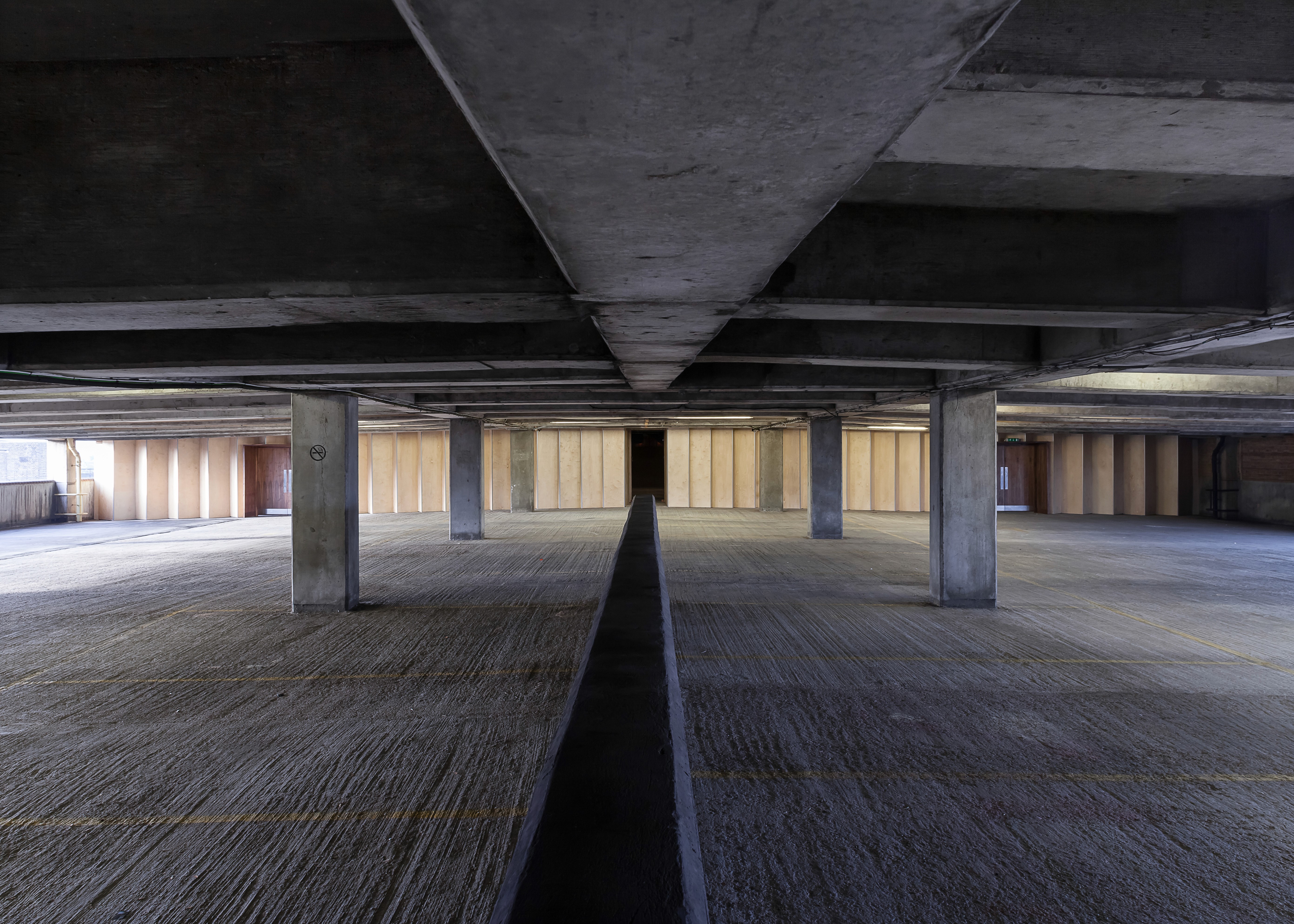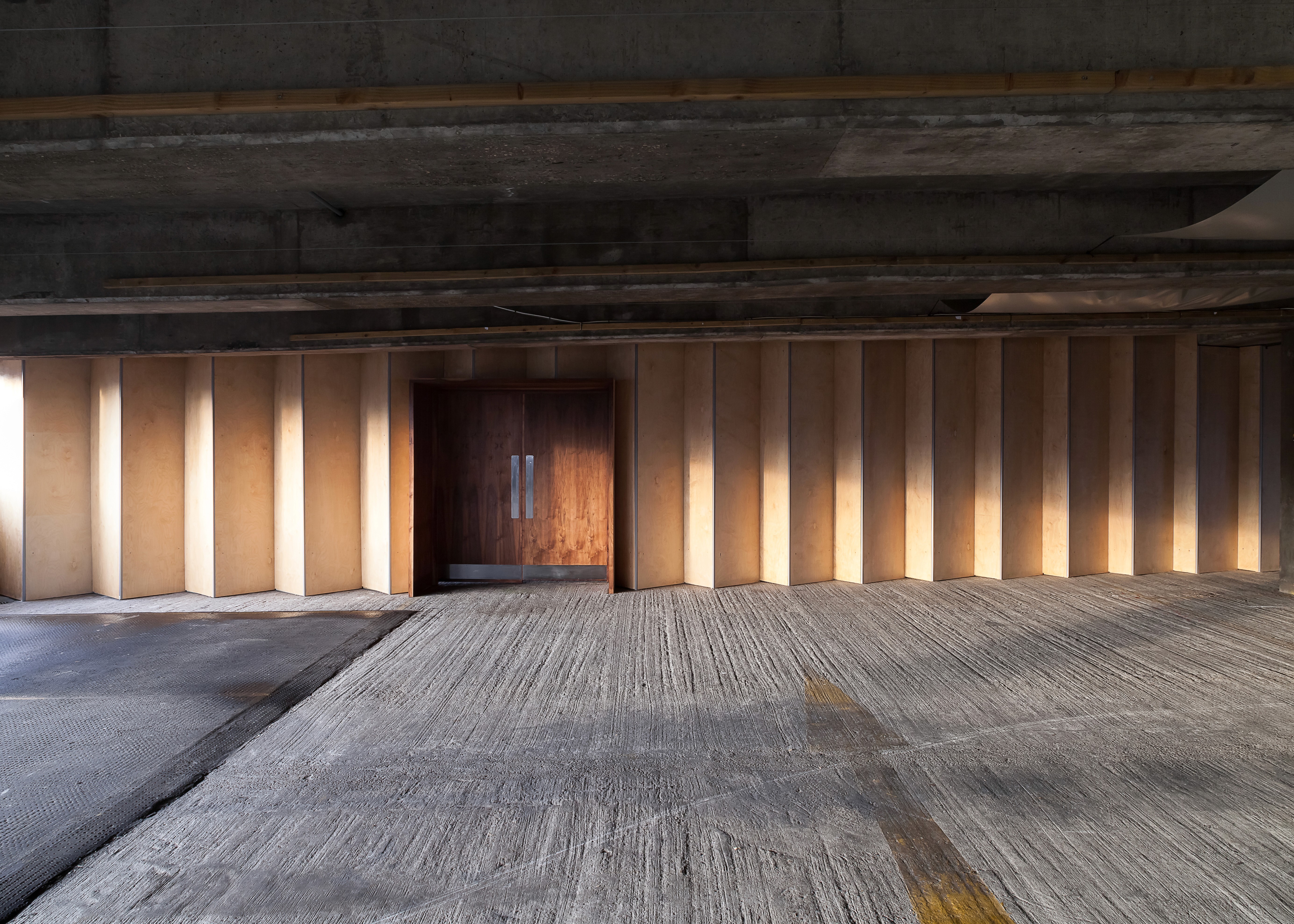 Shallow valleys in the centre gradually unfold across the width of the car park into much larger, deeper bays at the outer areas. The curtain-like form plugs into the raw dimensions and character of the original covered car park, spanning its full 33 metres.