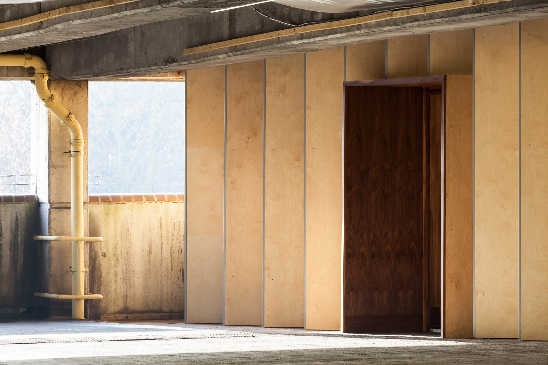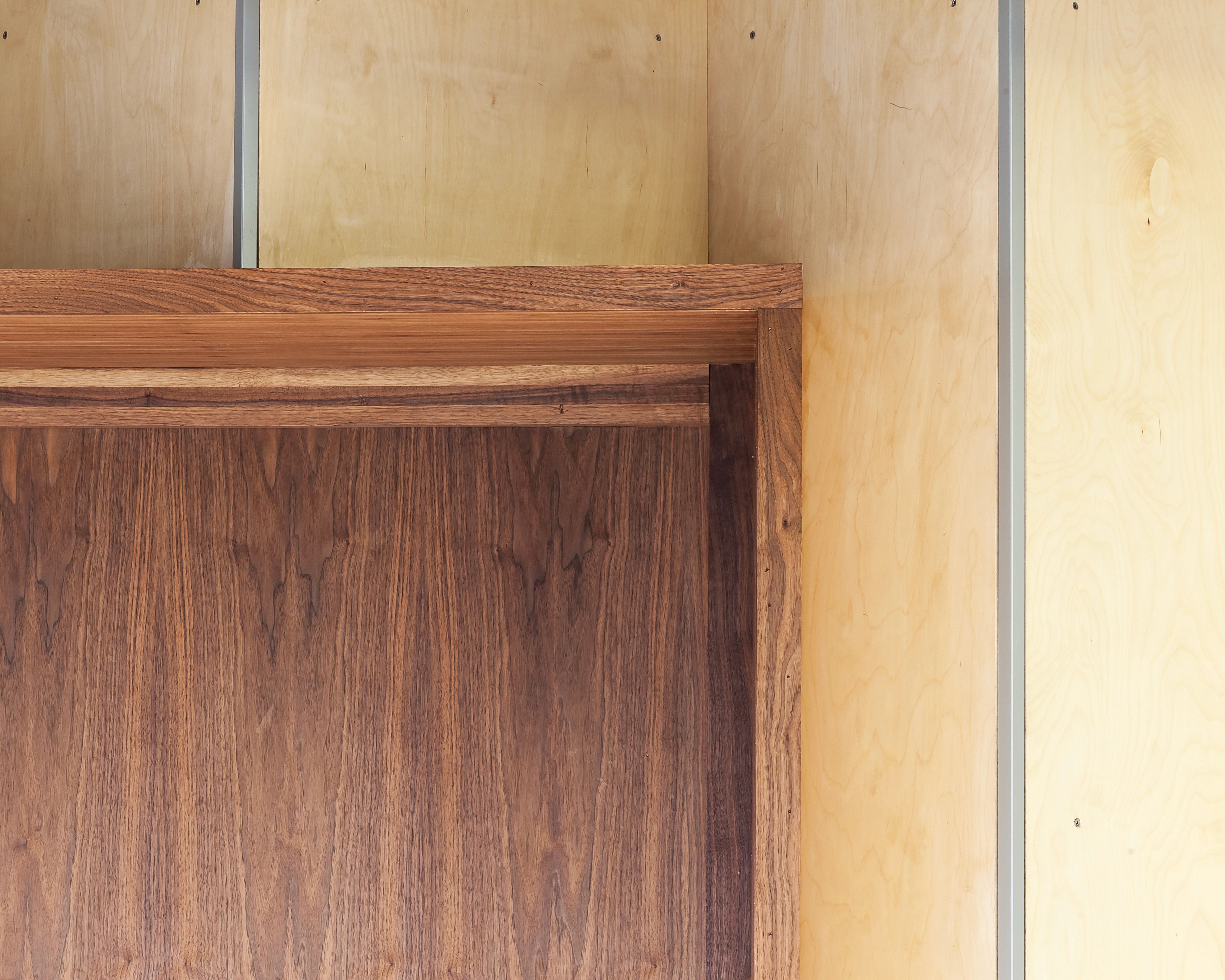 Birch plywood is the primary material, used in its natural state to bring warmth to the in-situ concrete surroundings. The angled plywood units have an anodised aluminium profile at the corner junction, and are fixed back to a precise CNC-cut zig-zag substructure. Two double doorways to the fire exit and green room are made as richly textured walnut-lined portals.