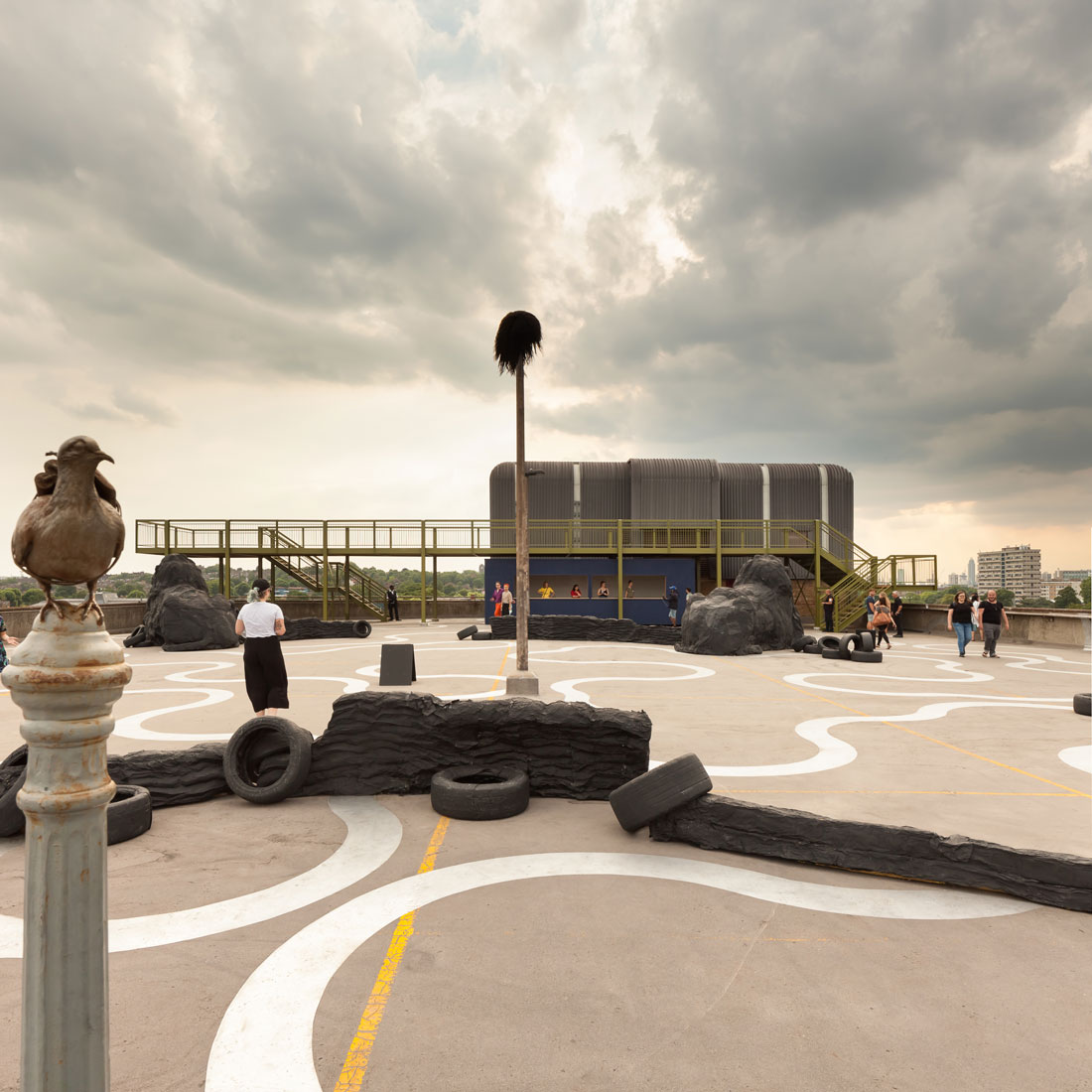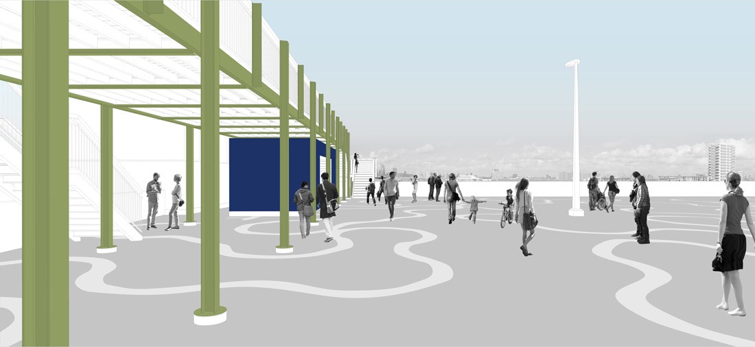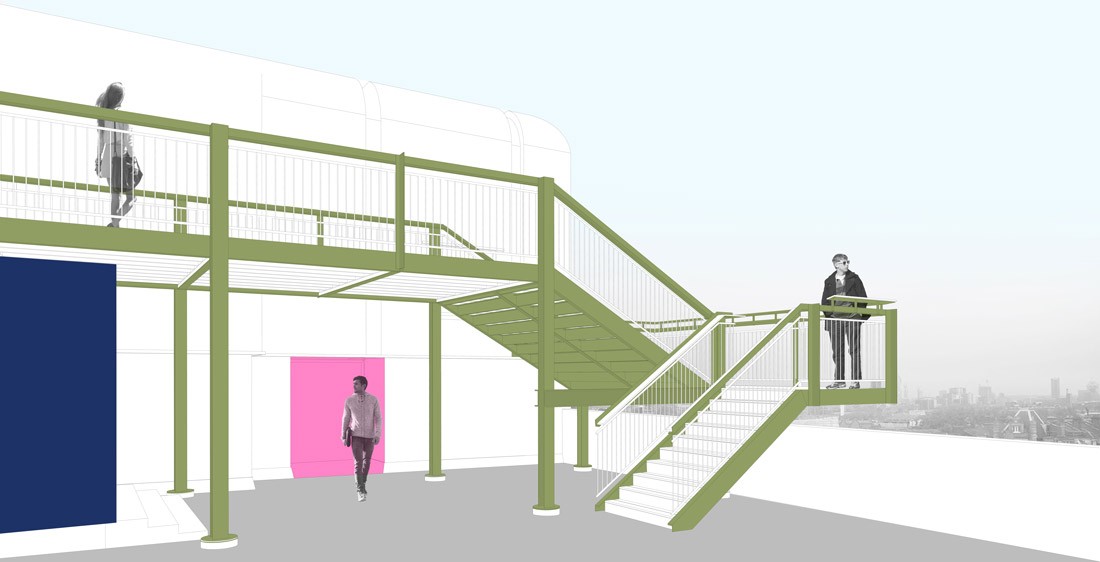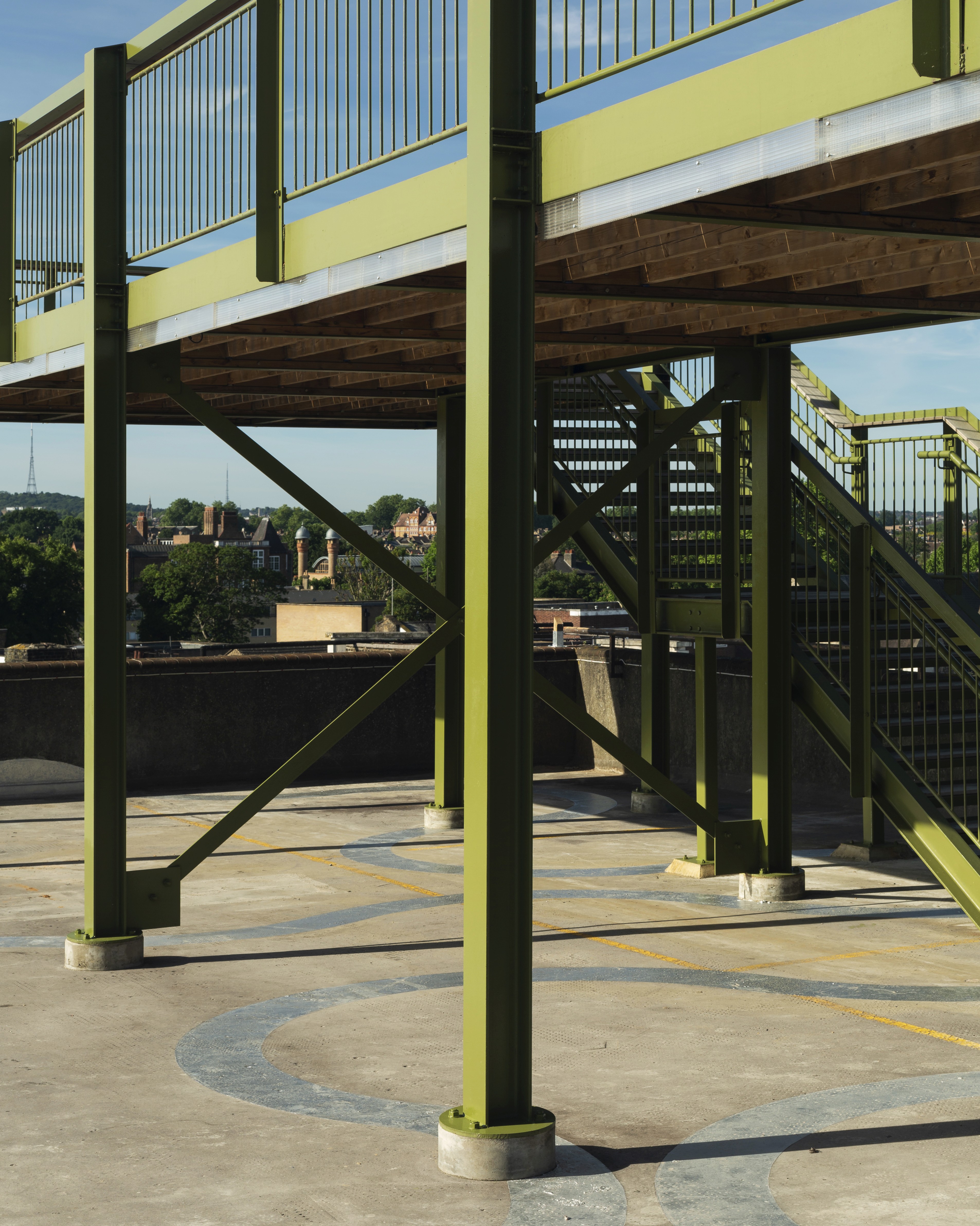 A 3.5m-wide, 32m-long raised platform spans the entire width of the car park, its locally-sourced, steel support beams cantilevered at both ends. Two staircases at either side provide an elevated promenade with access to unencumbered views of London.
