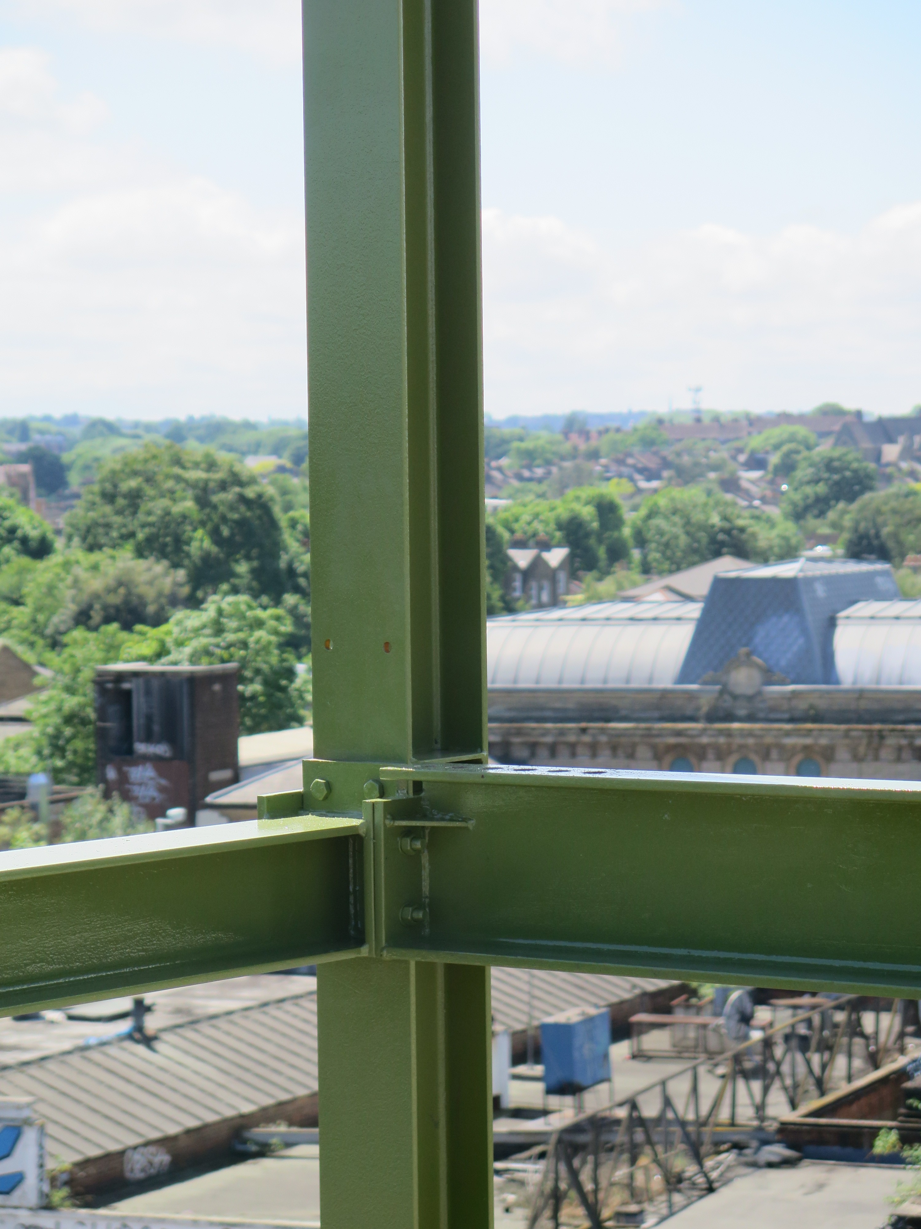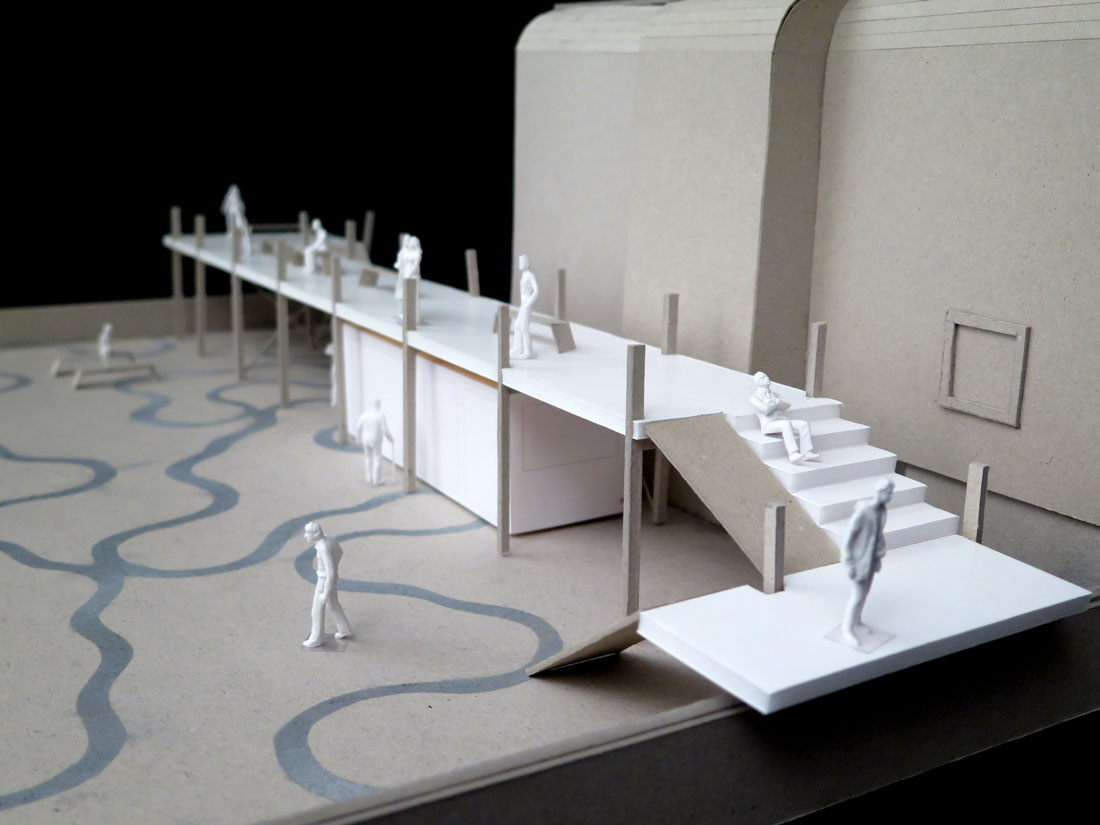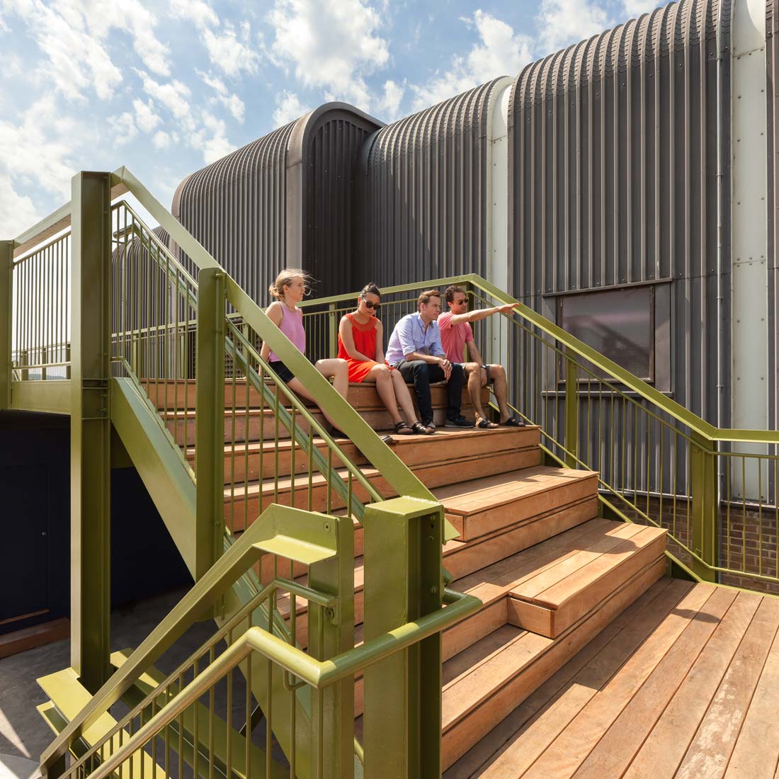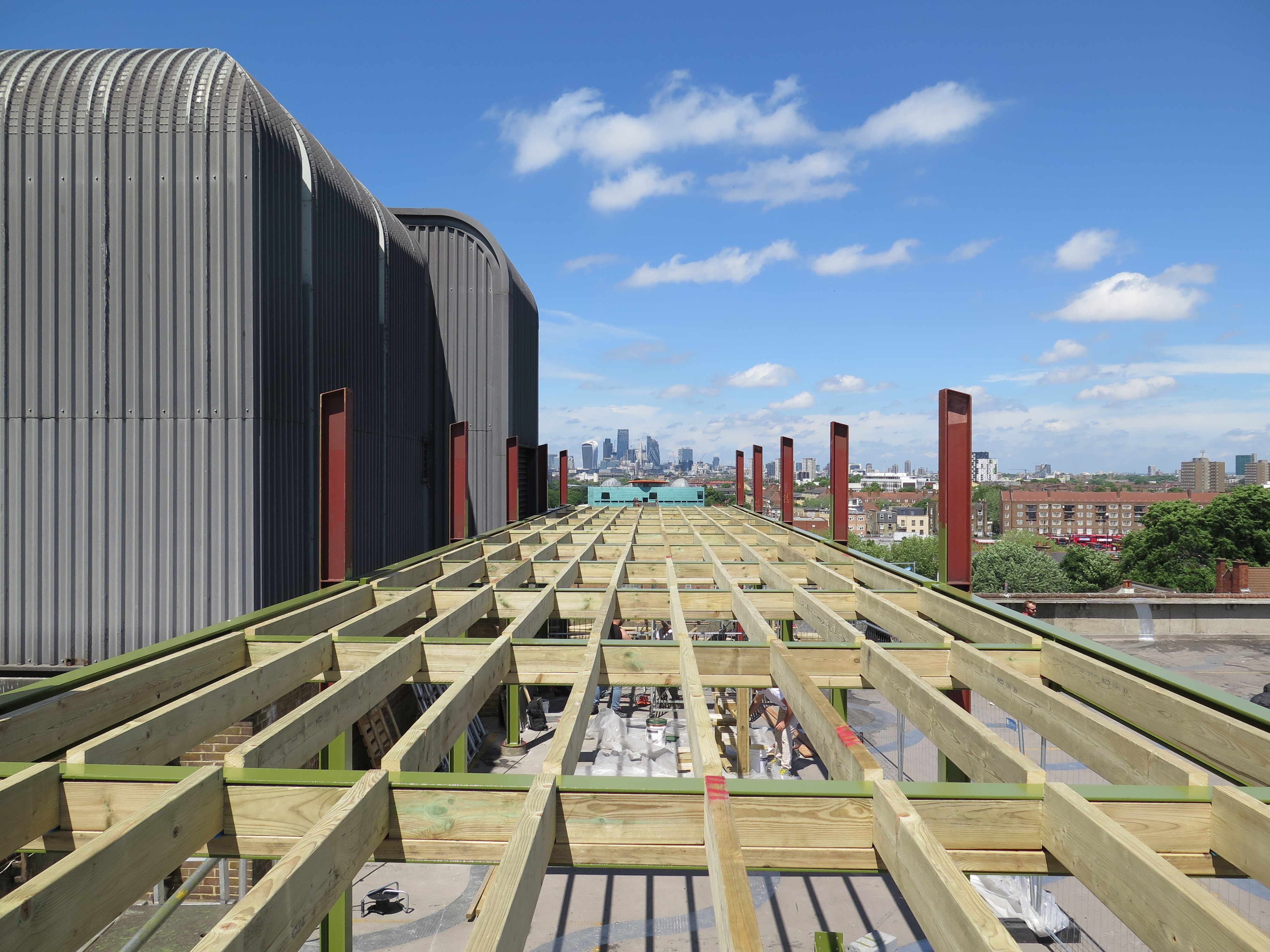 A 3.5m-wide, 32m-long raised platform spans the entire width of the car park, its locally-sourced, steel support beams cantilevered at both ends. Two staircases at either side provide an elevated promenade with access to unencumbered views of London.