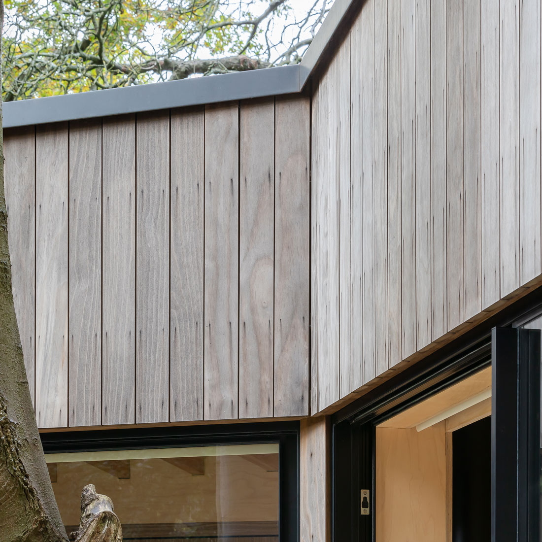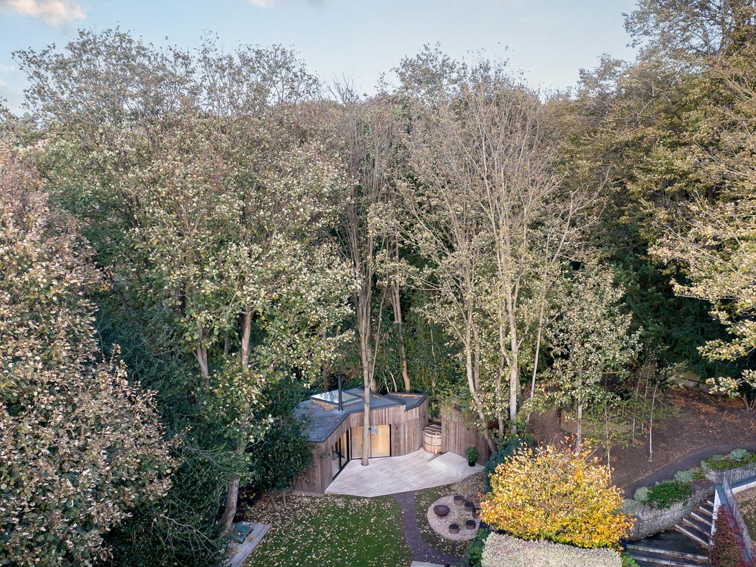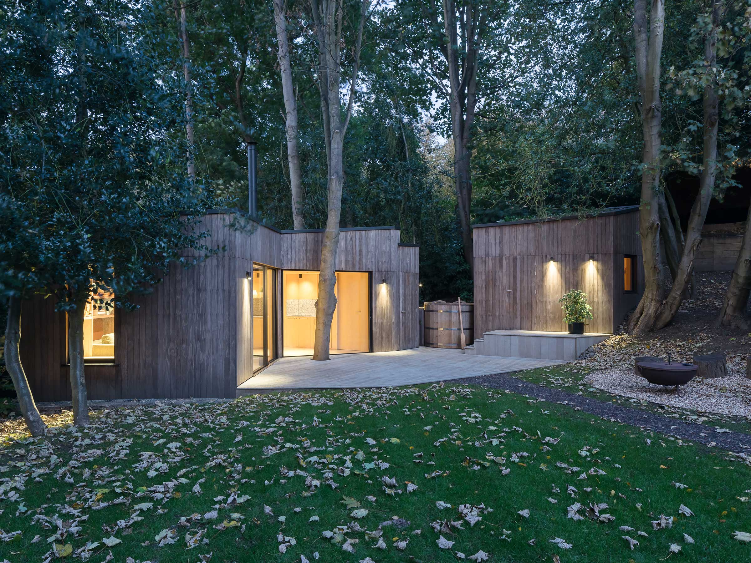 The garden room has large glazed sliding doors to draw light from the garden and terrace into the timber-finished interior. A large wrap-around rooflight-window to the rear provides a dramatic framed view of the extensive woodlands behind. The net effect is a building that feels immersed in nature.