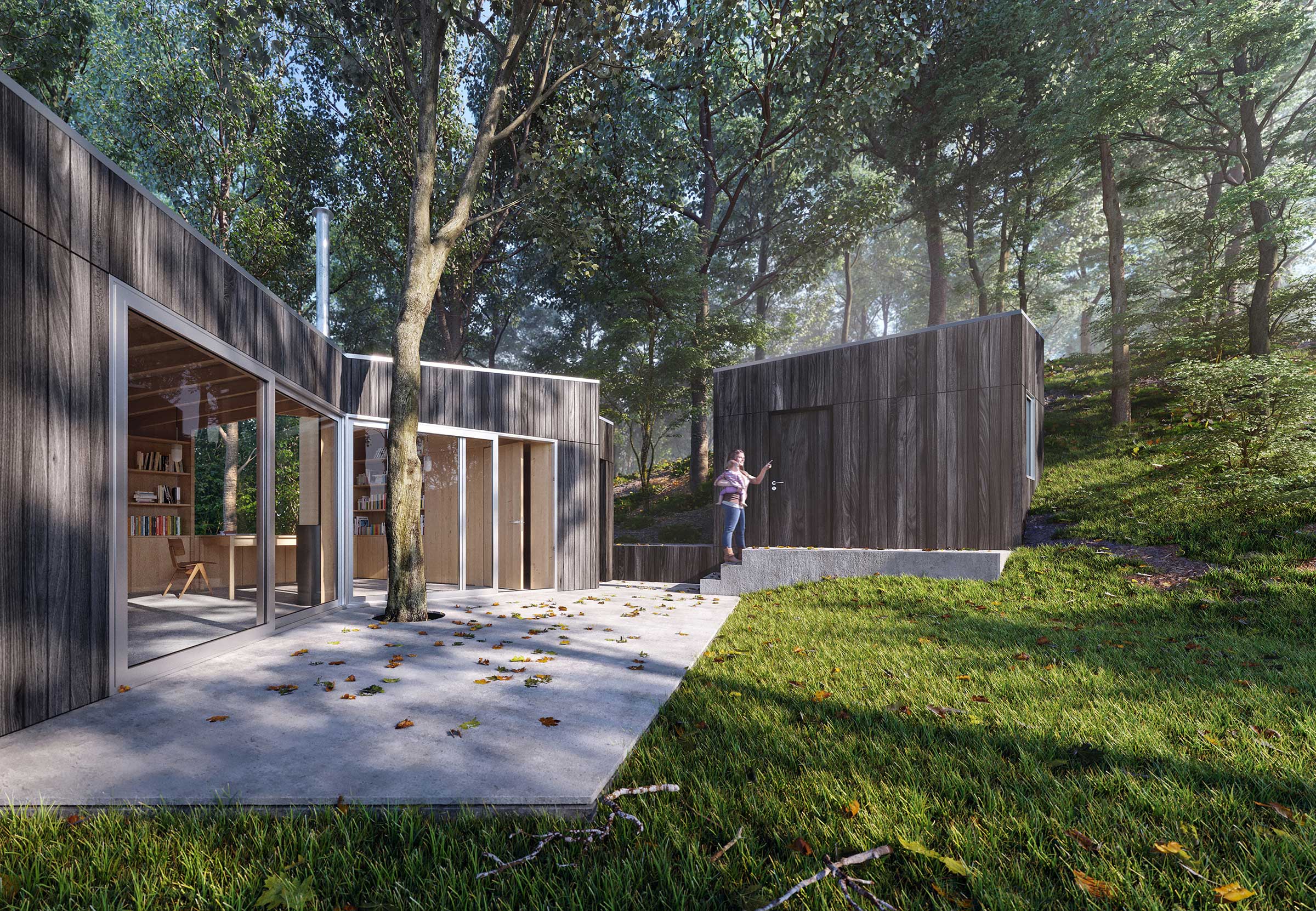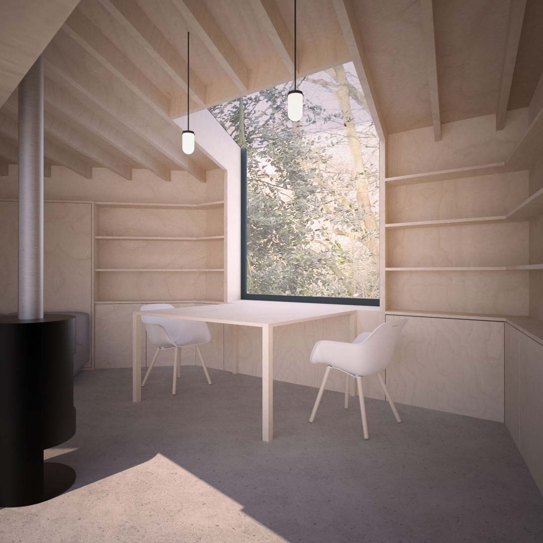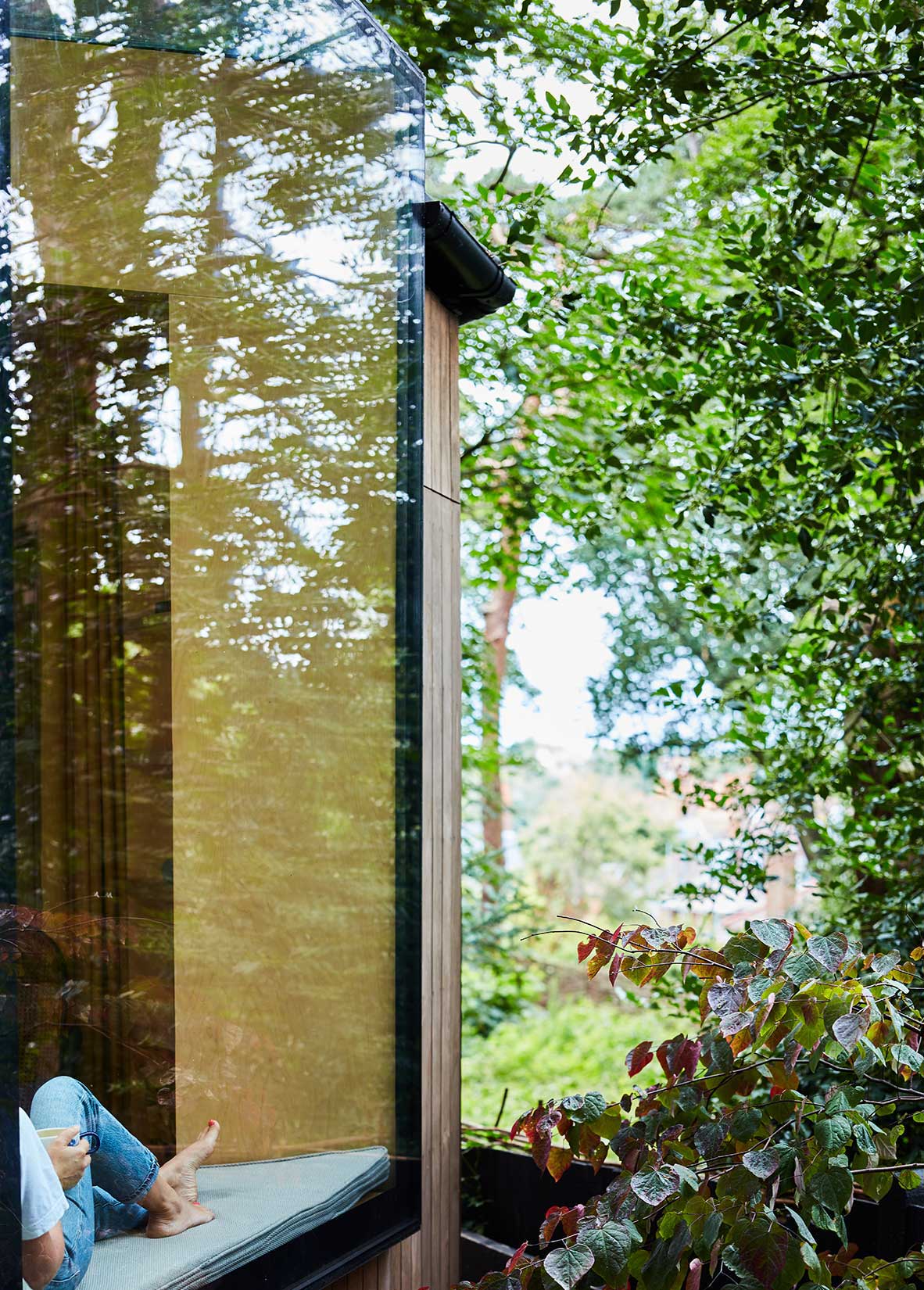 The garden room has large glazed sliding doors to draw light from the garden and terrace into the timber-finished interior. A large wrap-around rooflight-window to the rear provides a dramatic framed view of the extensive woodlands behind. The net effect is a building that feels immersed in nature.