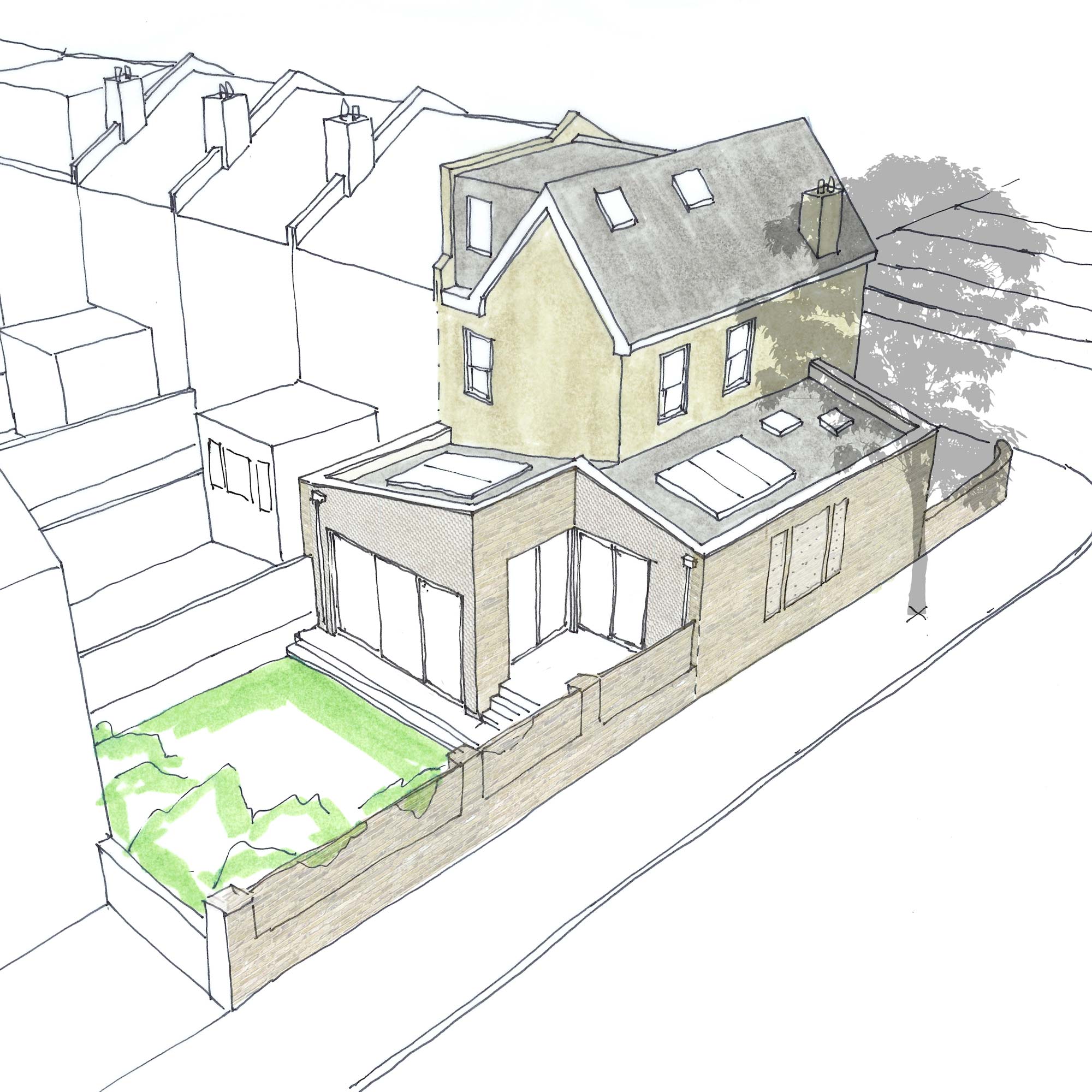 Enlarging an end-of-terrace Victorian house. Our task was to provide significantly more space for living and bedrooms; the house was very compact and the clients approached us after an unsuccessful application for a two-storey side extension.