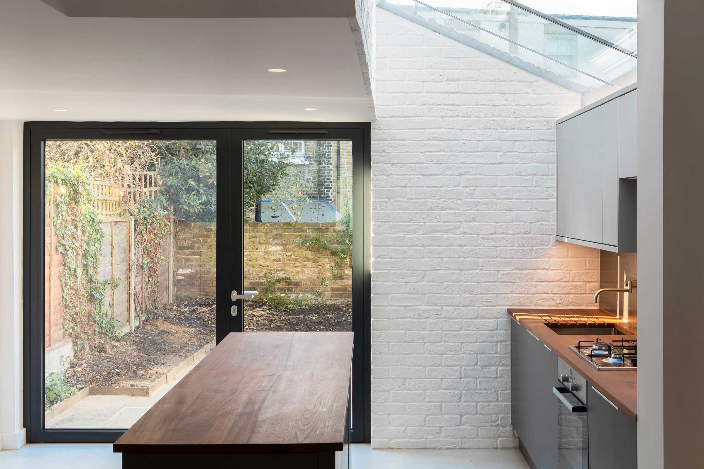 To make the most of the proximity of the garden a simple composition of generous skylight and garden glazing was used to complement the compact nature of the original property. A galley style kitchen is located under the roof light to benefit from good natural light and to emphasise the connection between the living areas and the garden.