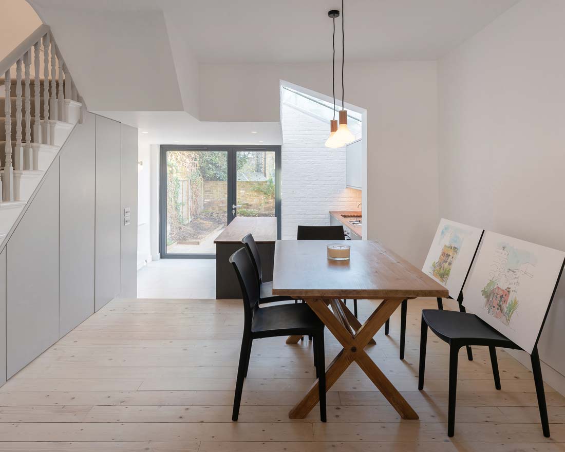 Full refurbishment, rear extension and loft extension in a Conservation Area in Islington. Whistler street is an unusual collection of compact Victorian terraced houses arranged in a mews like pattern close to Highbury fields. The focus of the project was to create an open plan flexible layout making the most of the possible views and connection to the west facing garden at ground level, and out over roof tops towards the Emirates Stadium at loft level.