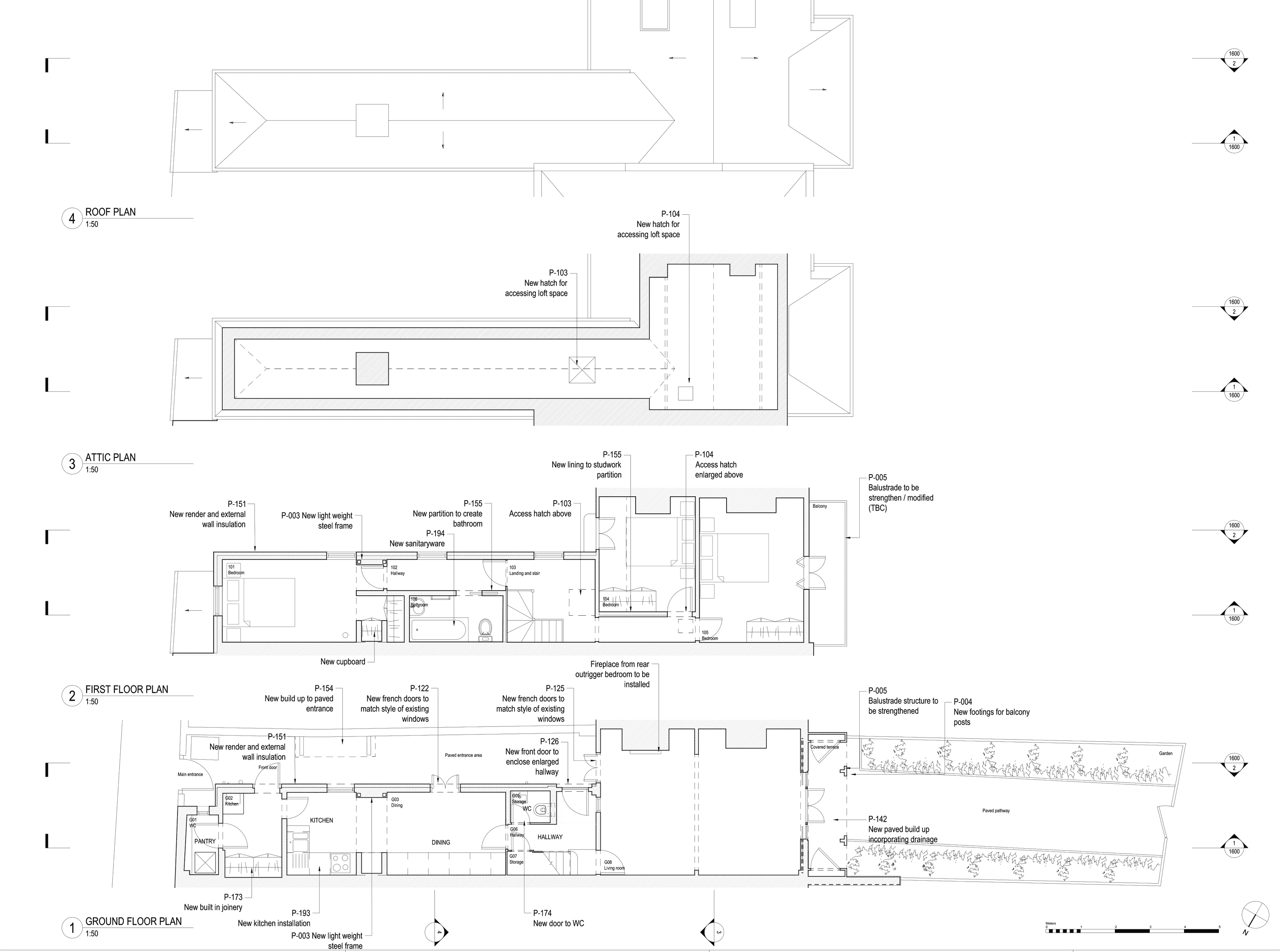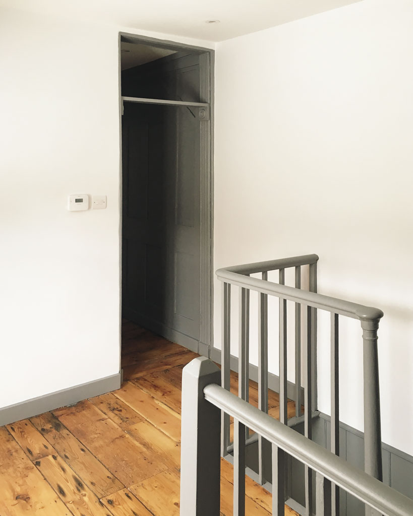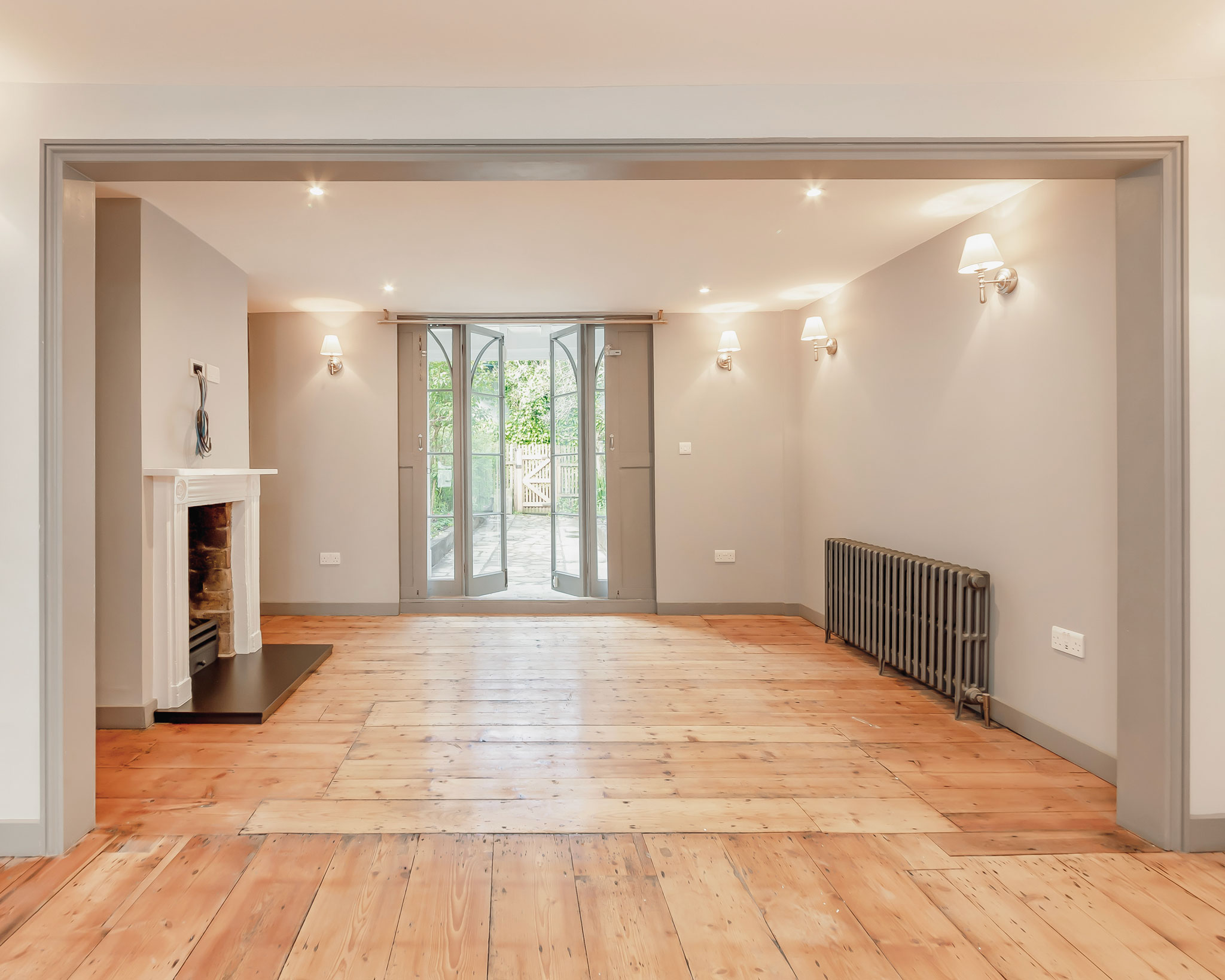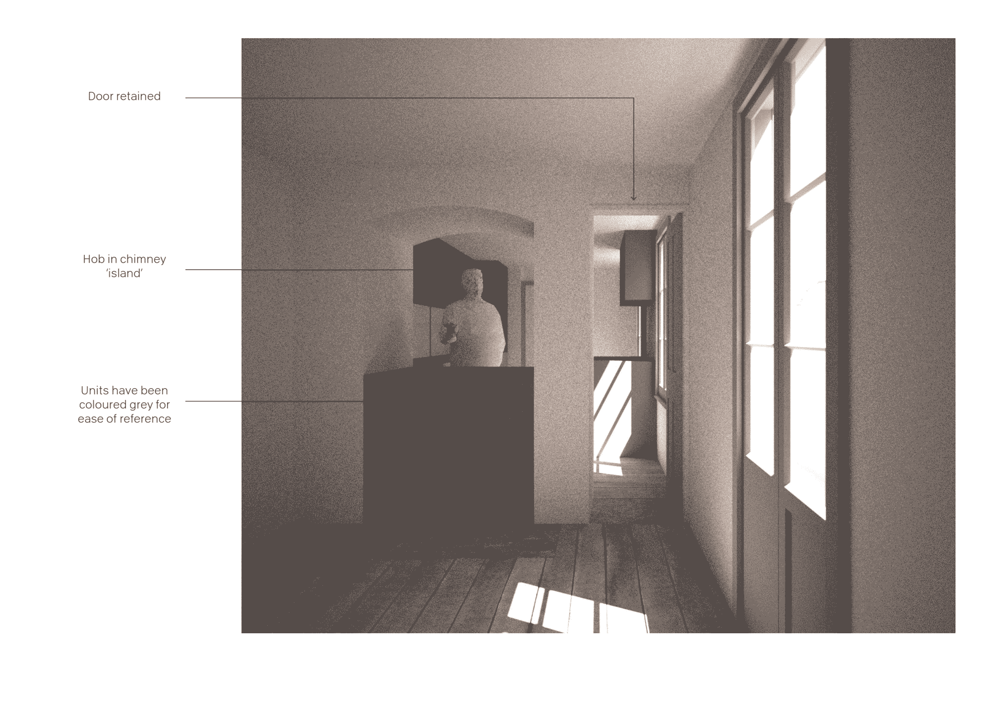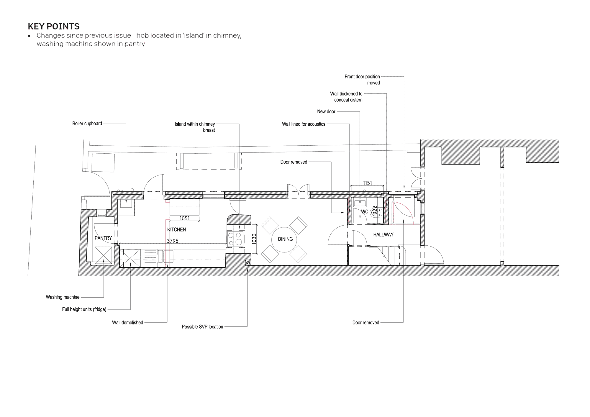 The work centres on the rear outrigger, a modest but significant addition that had grown awkward over time. Rather than remove, the approach has been to reinterpret: the existing chimney masonry is reworked to open a visual connection between the two ground-floor kitchen rooms, while a series of careful interventions — a removed partition, a relocated bathroom, a new front door that echoes an existing one — quietly transform the plan without unsettling the whole.