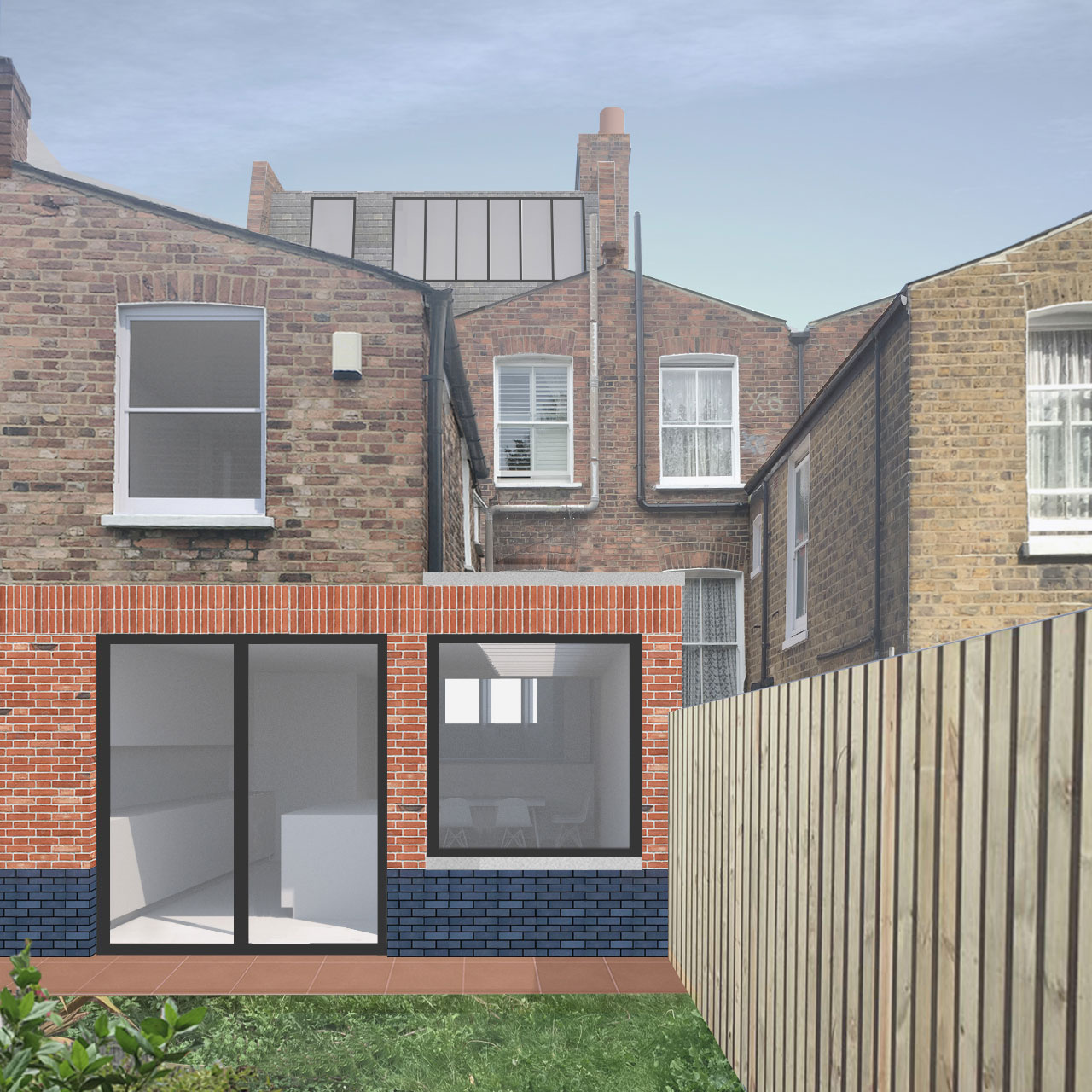 The new rear elevation refers to this patchwork of materials and introduces a unifying brick lintel combined with a robust band of engineering brick at low level.