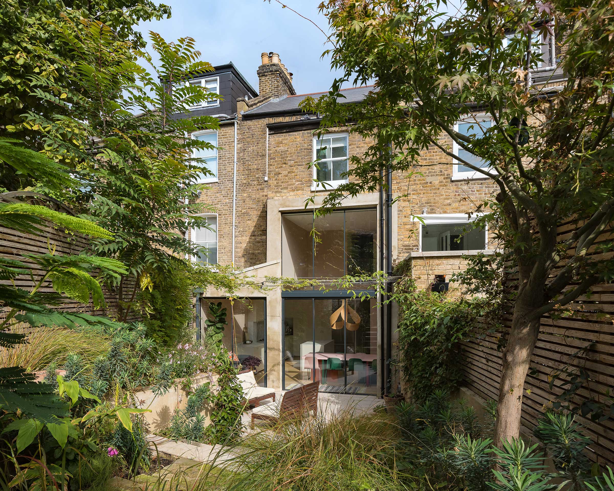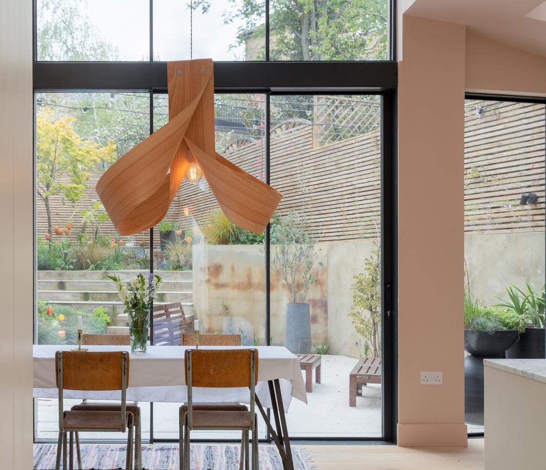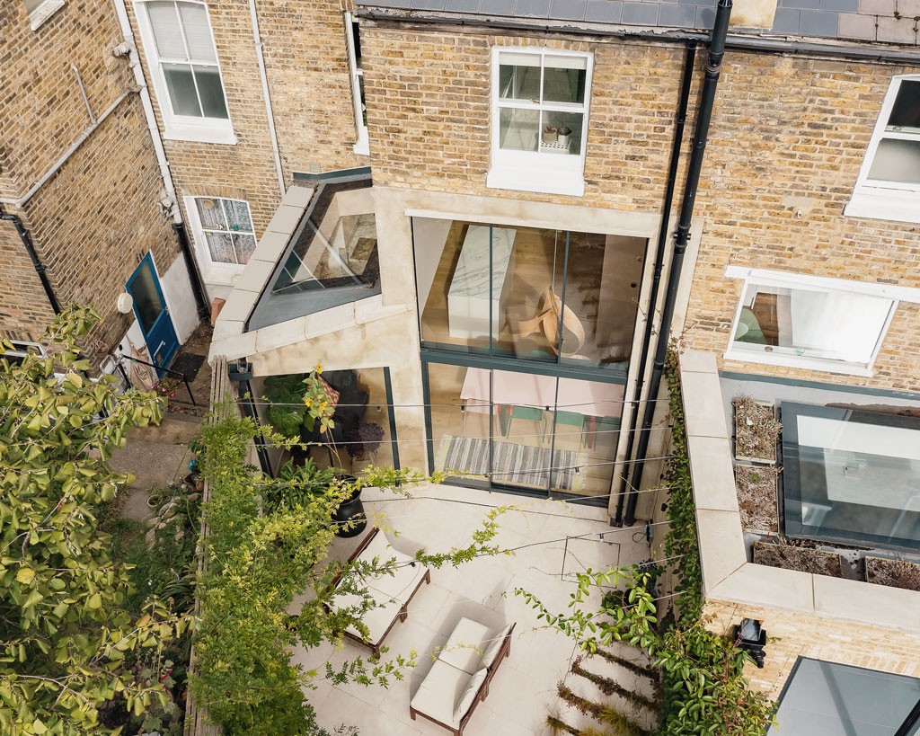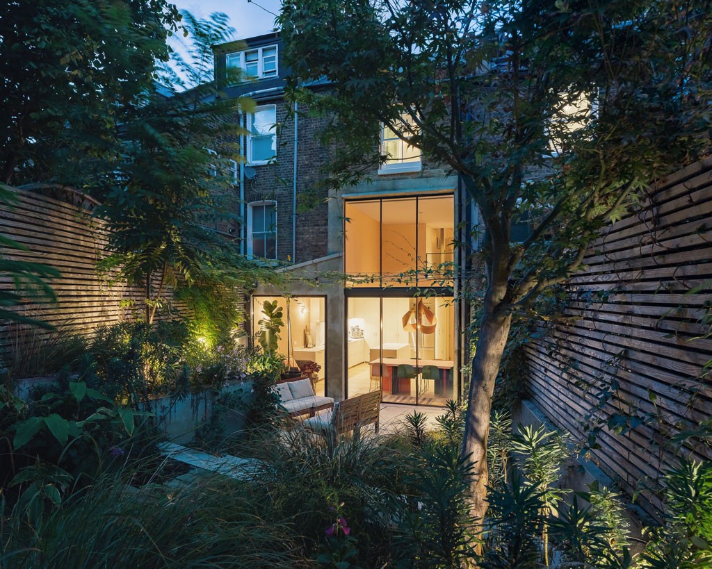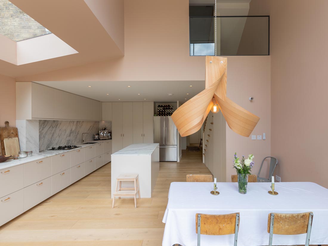 A side-return rear extension creates valuable extra space for the new living area, and a light-filled double-height space doubles as circulation for stairs.