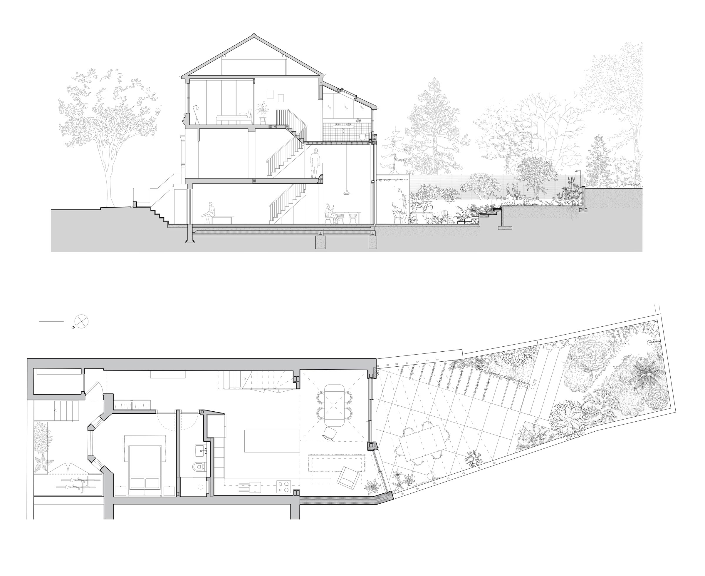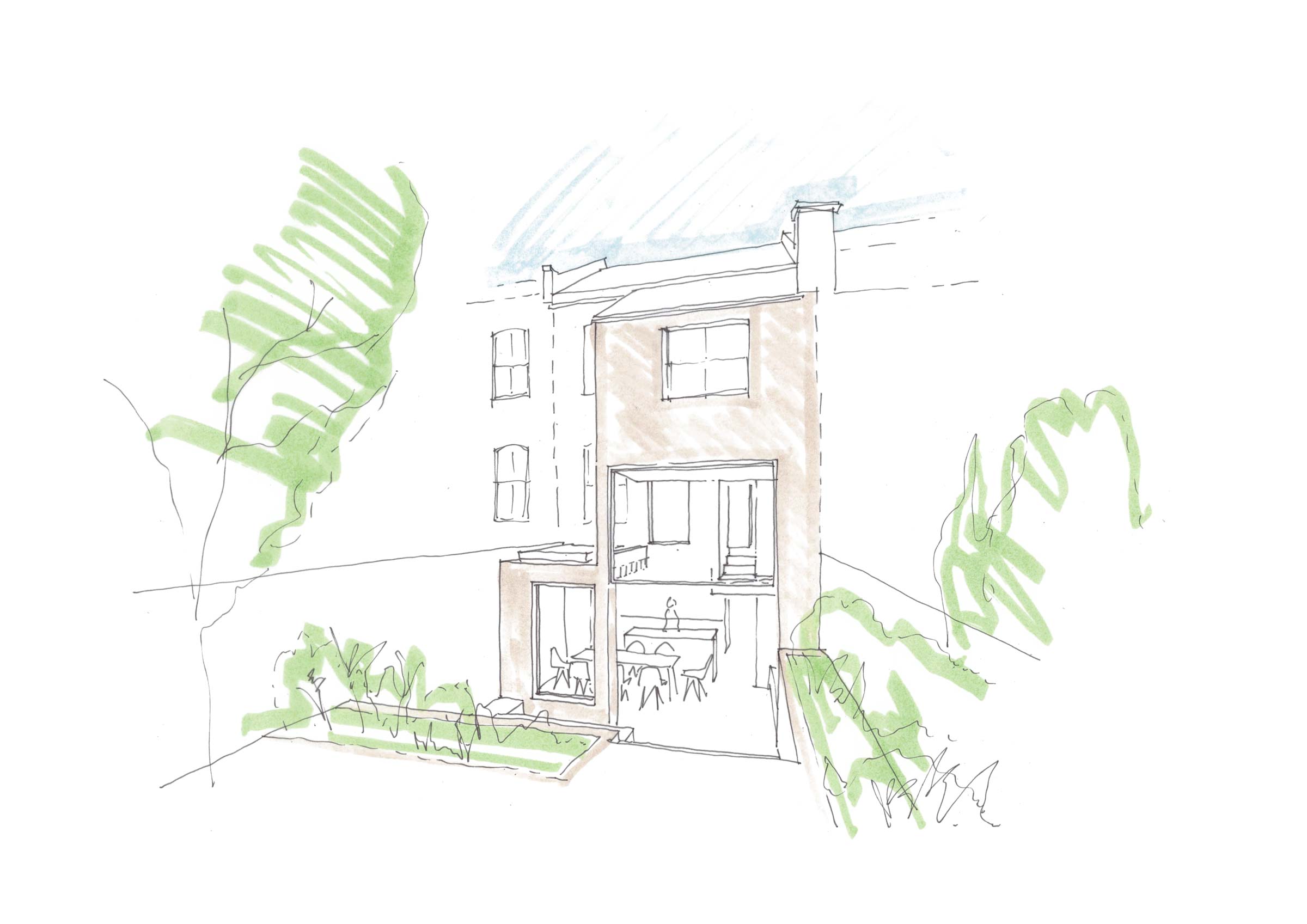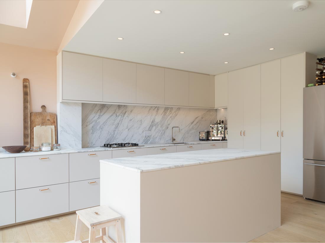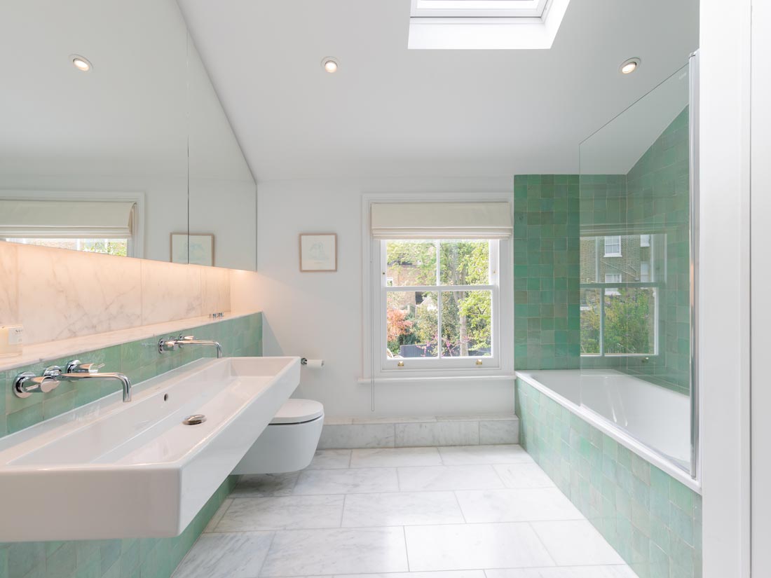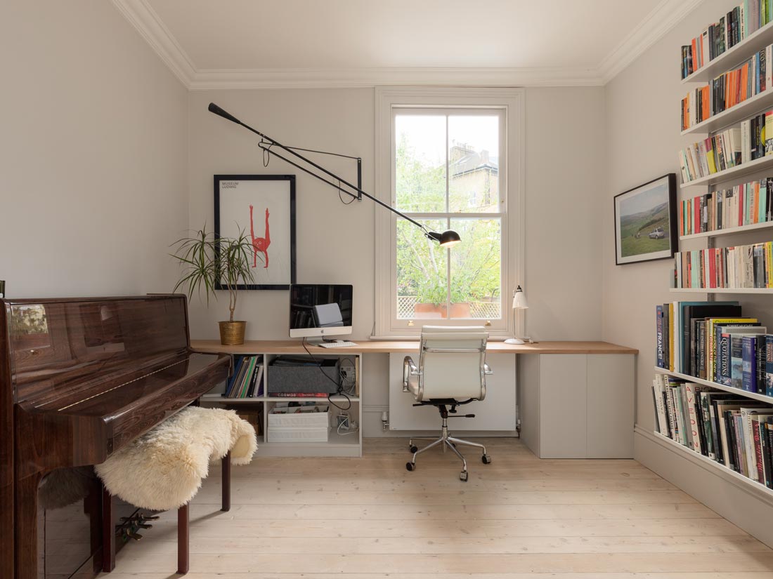 A side-return rear extension creates valuable extra space for the new living area, and a light-filled double-height space doubles as circulation for stairs.