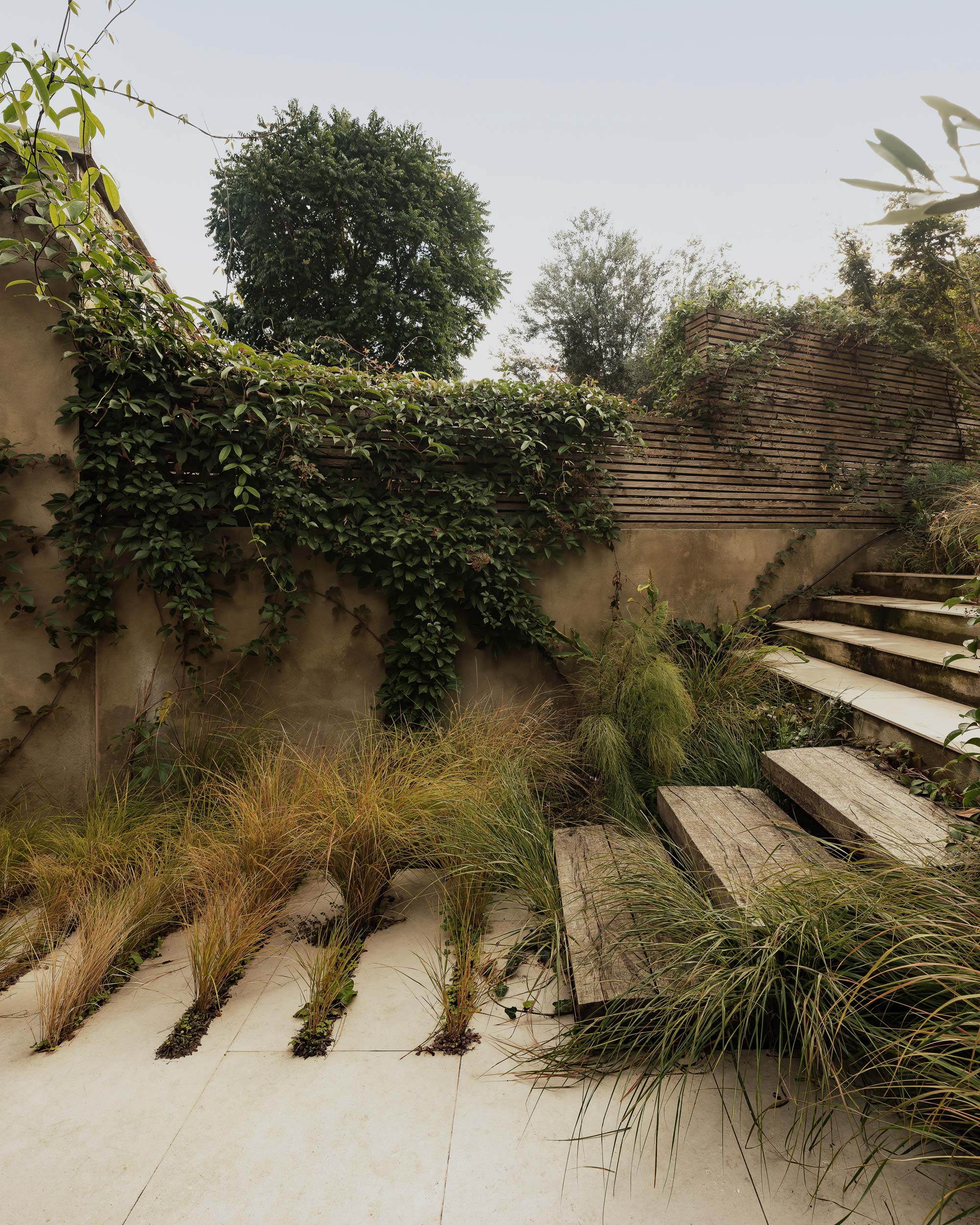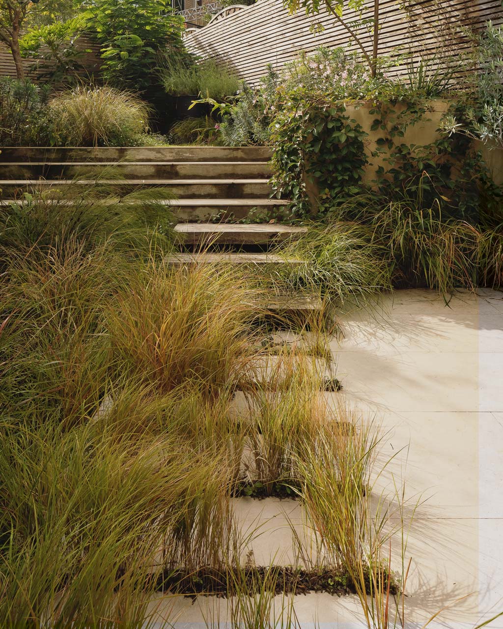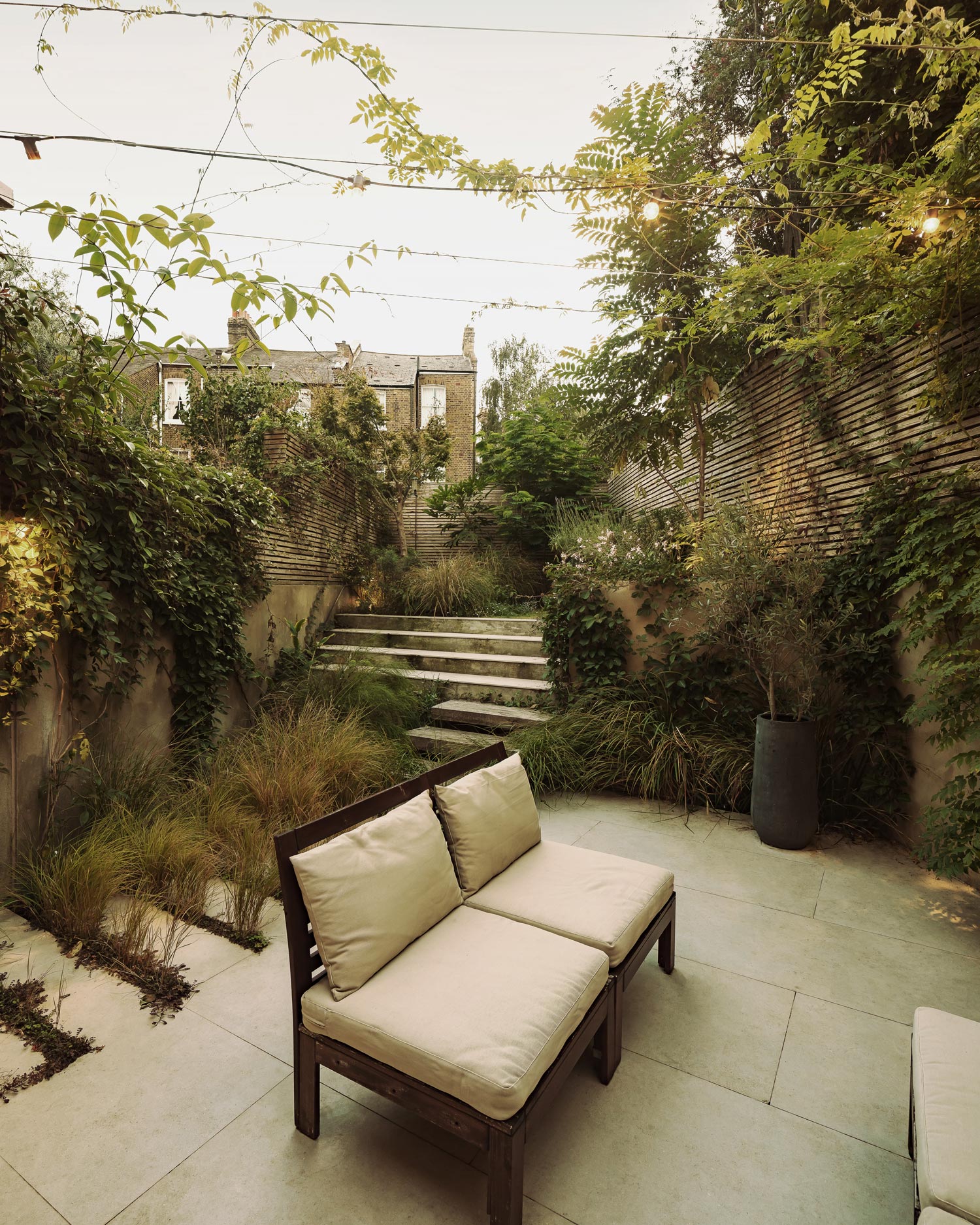 Working with landscape designer Dan Corby-Bristow, the level of the rear garden is significantly dropped to allow a direct connection to a terraced garden. Hard elements such as concrete retaining walls finished with rough-finished pigmented render and textured concrete paving, contrast with a rich mix of planting.