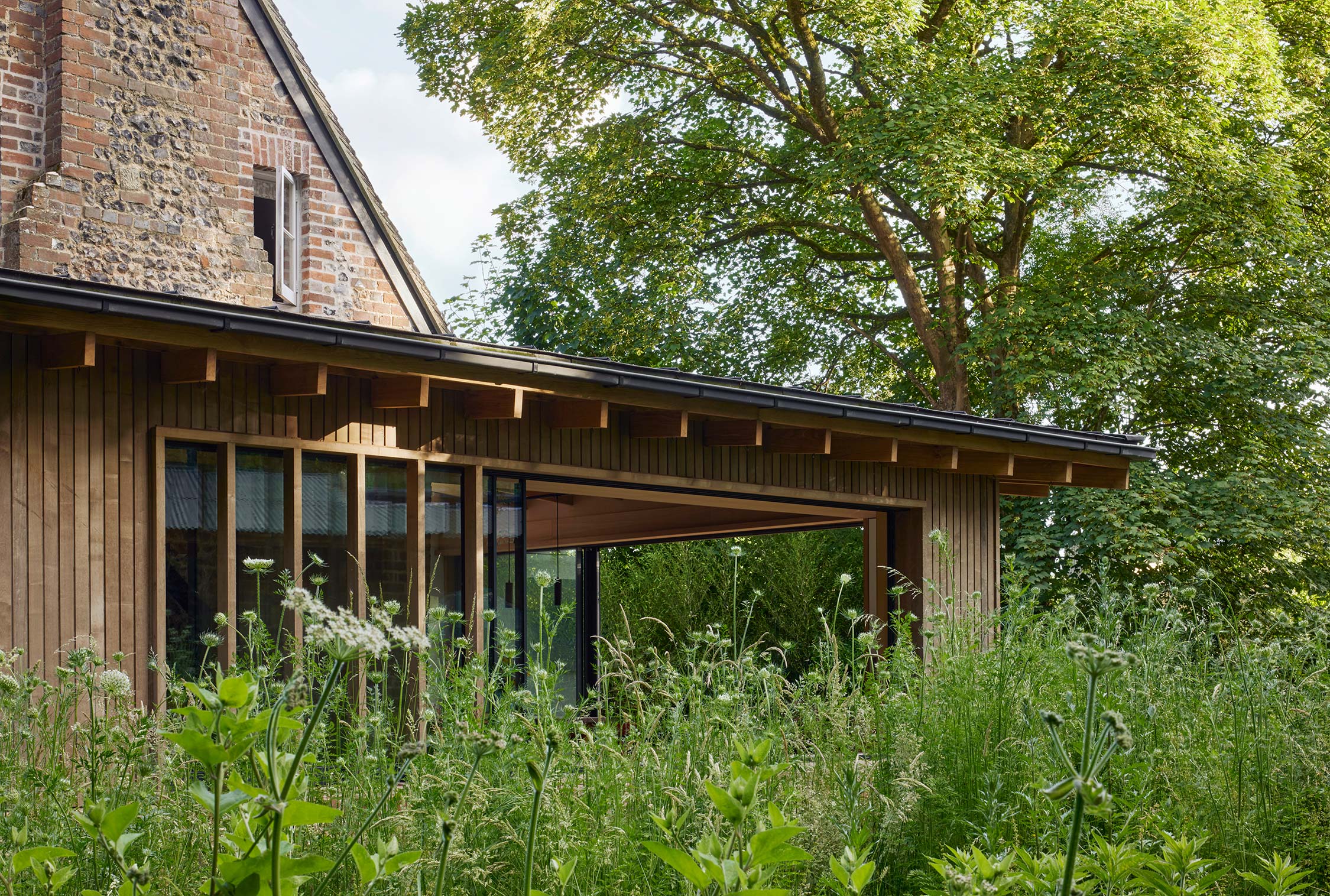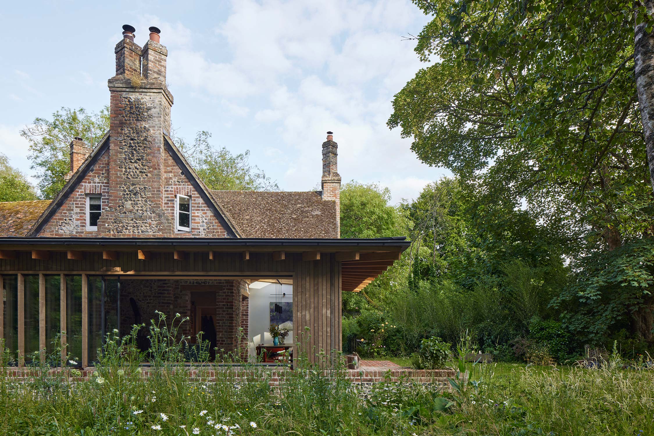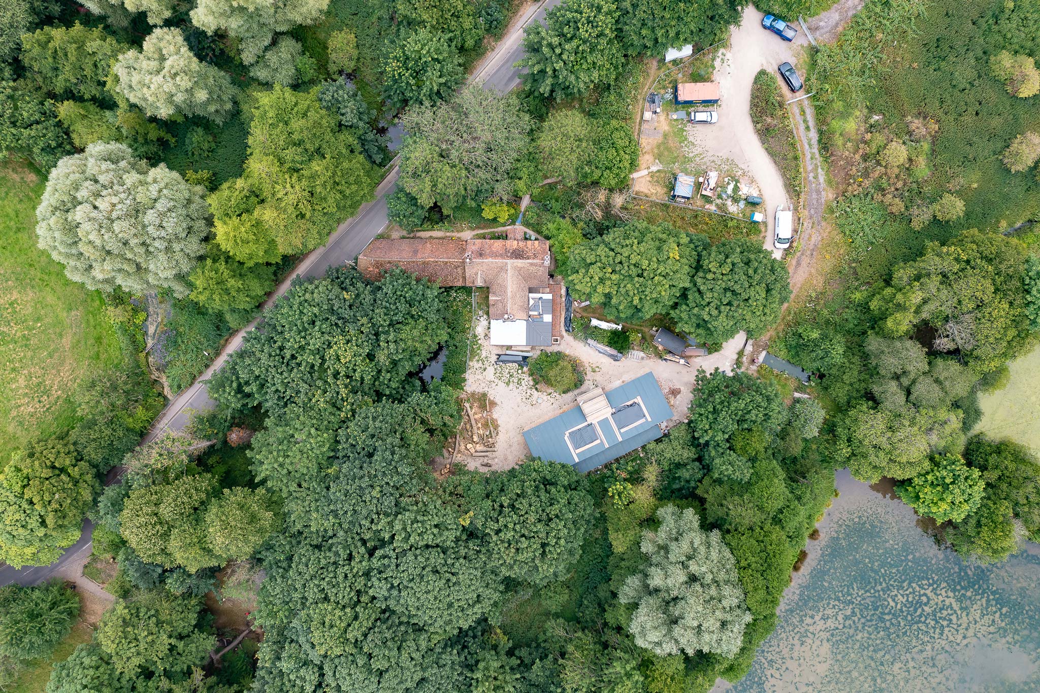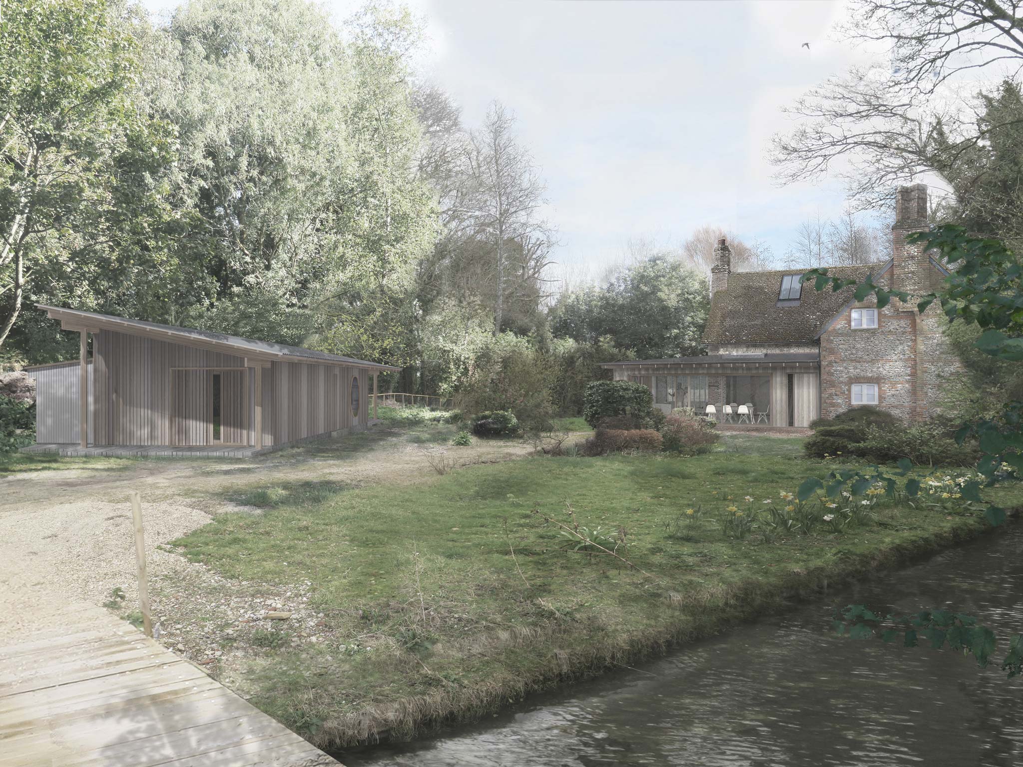 A Grade II listed water mill on the River Test comes with an obvious constraint: a protected historic structure, a Site of Special Scientific Interest, and a client brief that asks for something entirely new. The couple commissioning the project needed dedicated studio and workshop space for their practices, specialist picture framing and performance design, alongside a reconfigured and extended home. The challenge was to add to an already layered historic site without diminishing it.