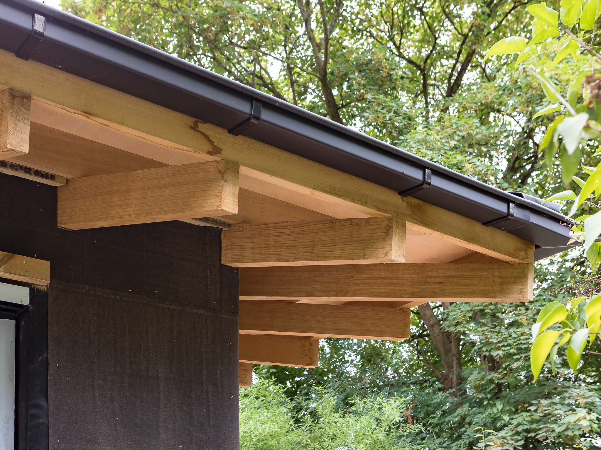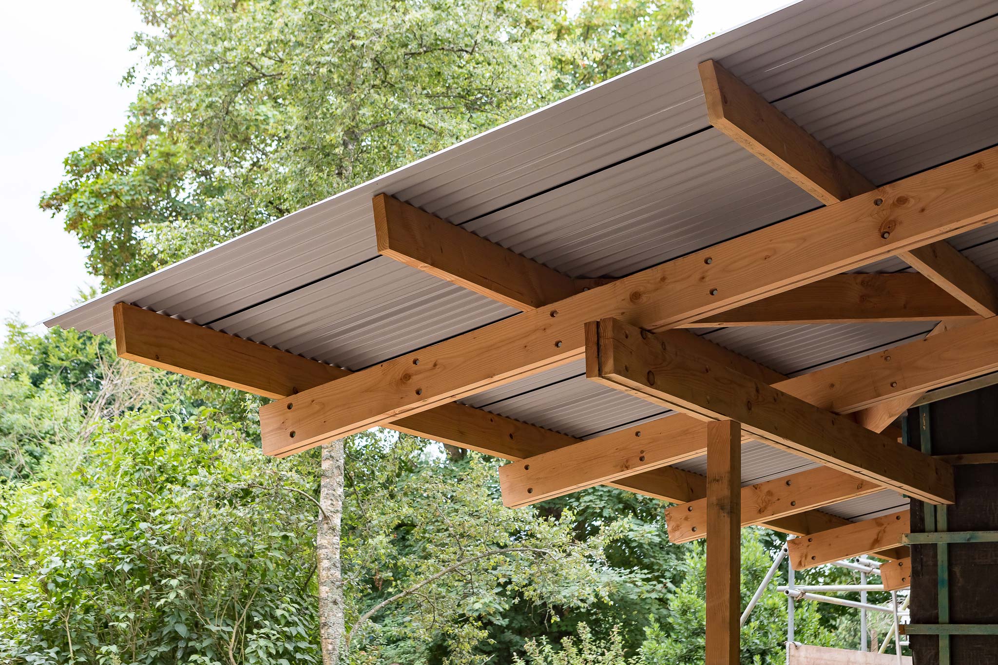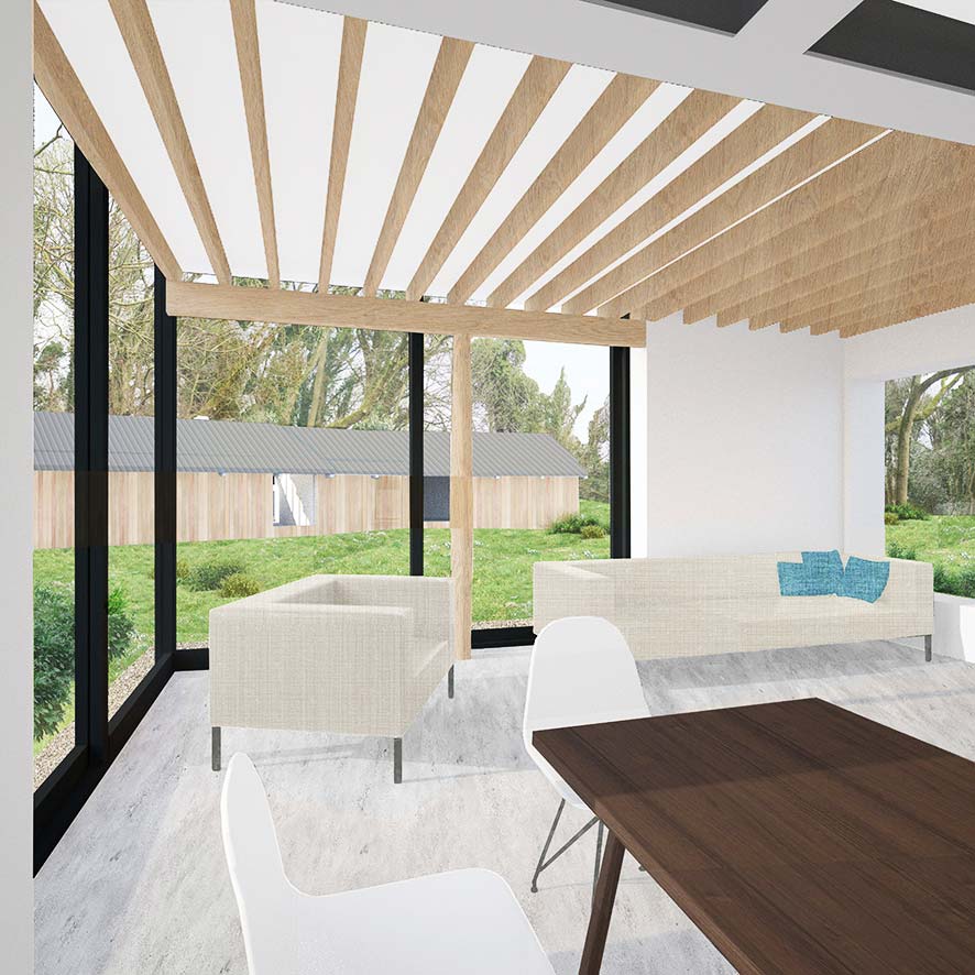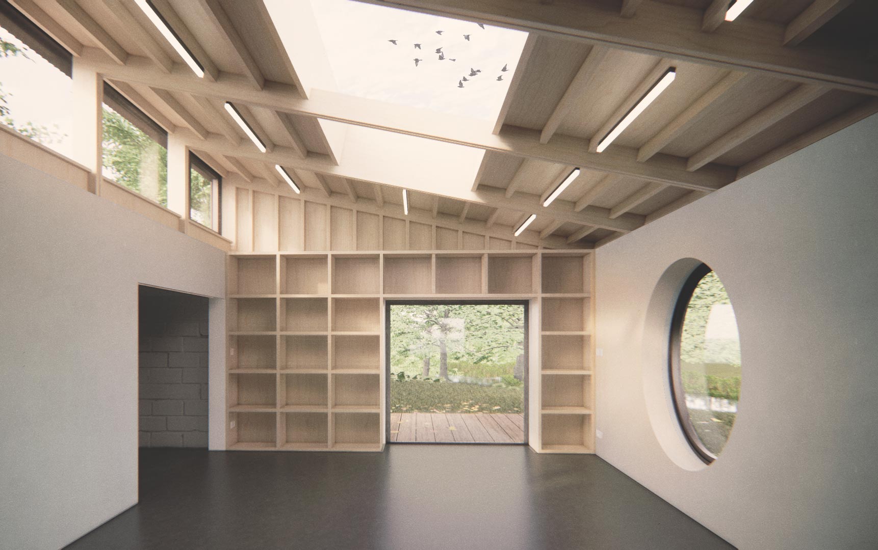 We designed a single-storey studio annexe that mirrors the plan of the existing mill, positioning it in dialogue with the mill house across the garden. Heat-treated sycamore, locally sourced and native to the area, clads the structure; it will weather over time, gradually losing itself against the boundary tree line. Inside, the two studios are planned around specific working practices: a north clerestory brings consistent, glare-free light into the woodworking workshop; a south oculus introduces human scale and marks the relationship back to the river and mill house; large rooflights meet the high light levels needed for detailed studio work. The material language, timber, zinc and corrugated roofing, references the light industrial heritage of the site rather than reaching for something picturesque. Full plywood wall linings give complete fixing flexibility for tools and materials, and a large pocket door between the two studio spaces controls noise and dust without sacrificing floor area.