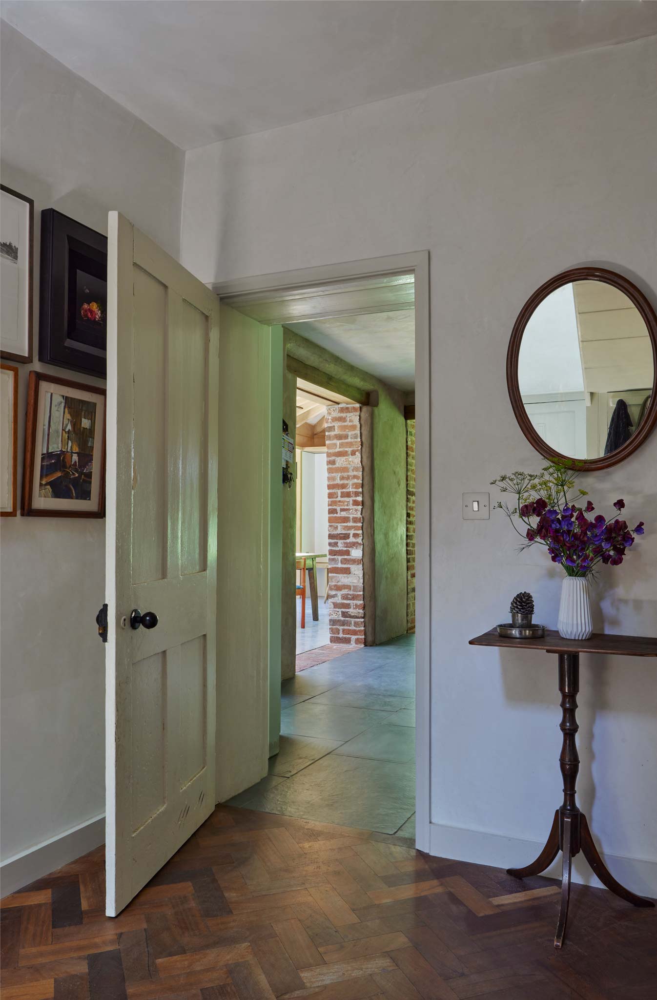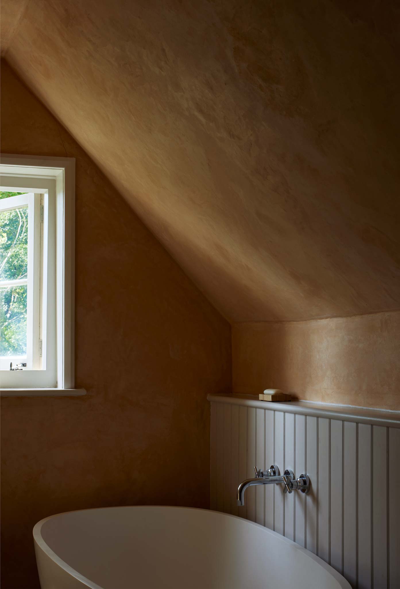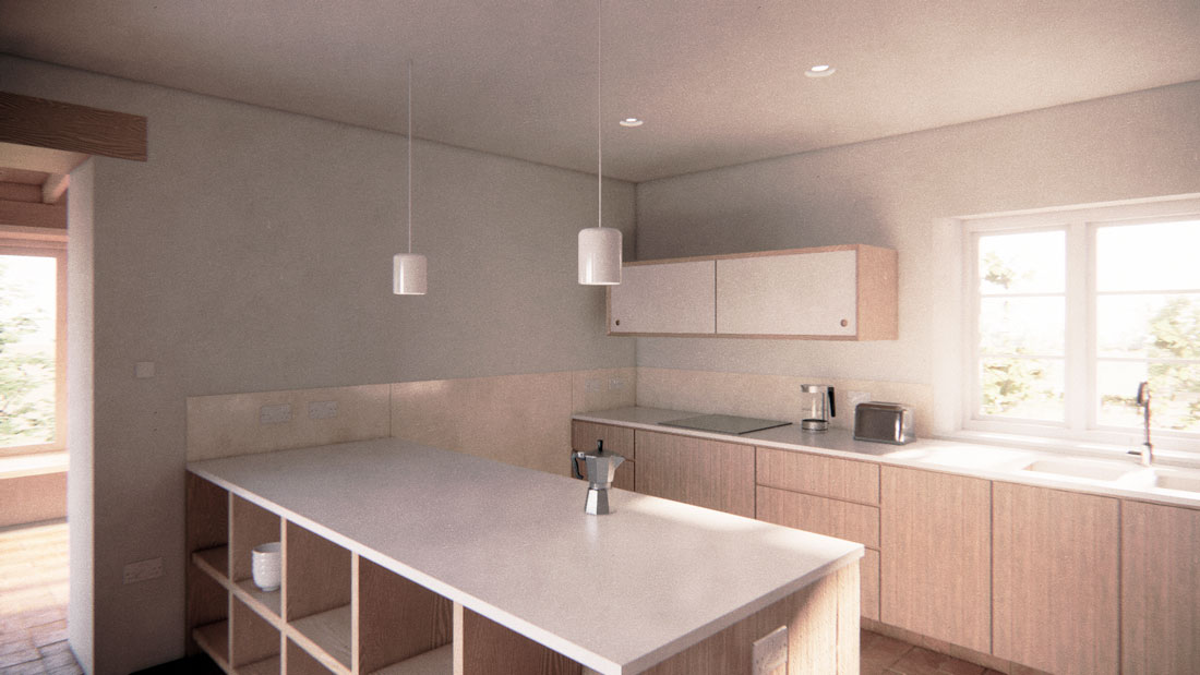 The mill house itself has been stripped of later accretions and reconfigured to maximise living space. Working closely with Hampshire conservation officers and the SPAB, we exposed and retained a concealed bread oven discovered during enabling works, which set the tone for the kitchen: salvaged materials, lime plaster, linseed oil on lath-and-plaster walls. A water-source heat pump installed in the mill race now powers heating across the site, replacing fossil fuel systems without disturbing the original timber mill mechanism.