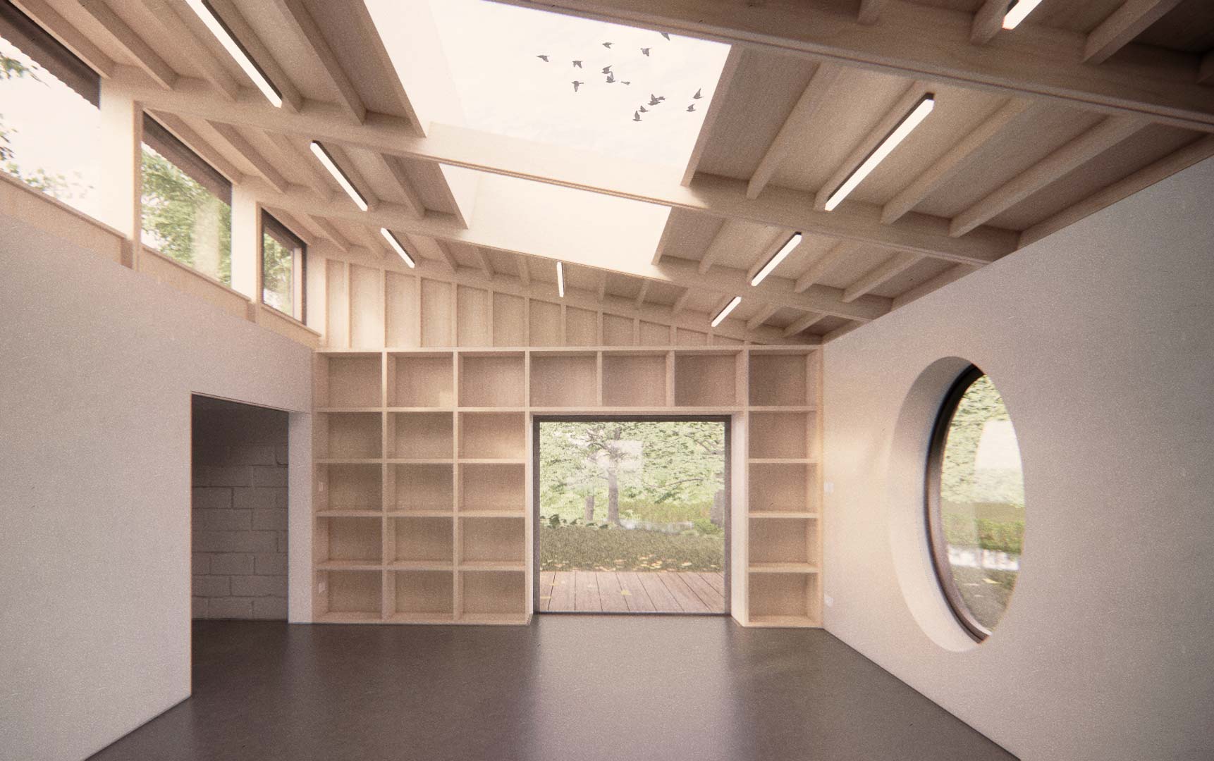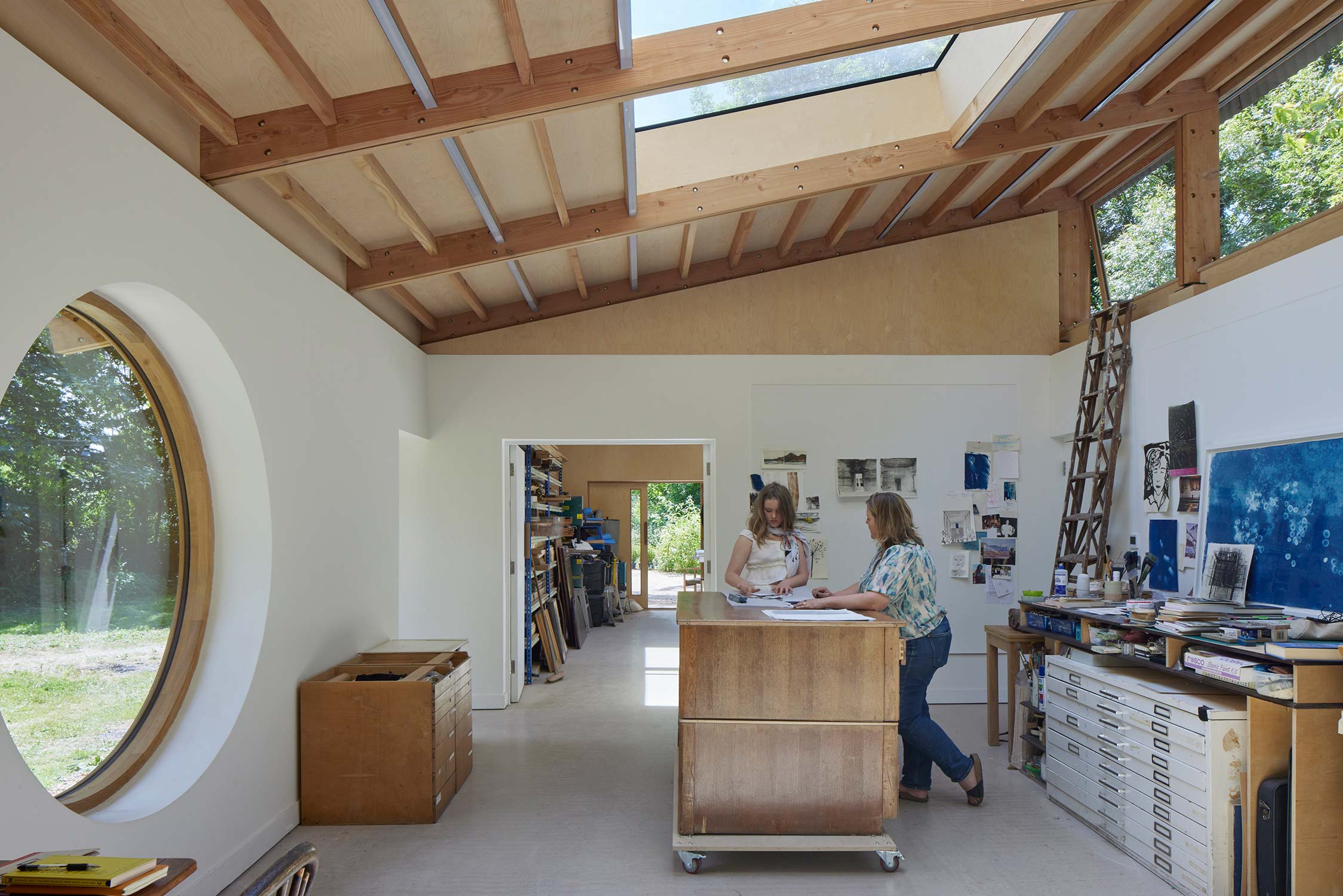 The interior design creates a robust environment which is practical, beautiful and inspiring. Material choices including plywood linings, exposed blockwork and painted concrete flooring, alongside carefully designed storage, utility, and dark room spaces support a range of creative practice within the building.