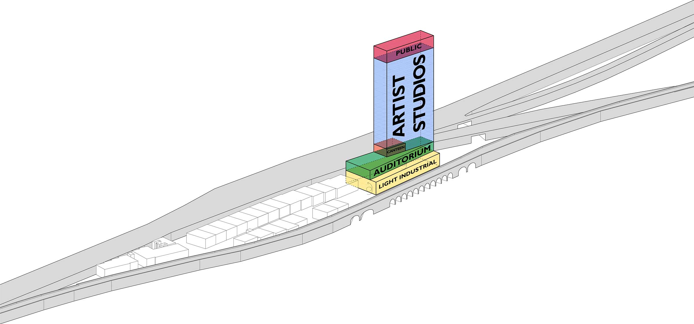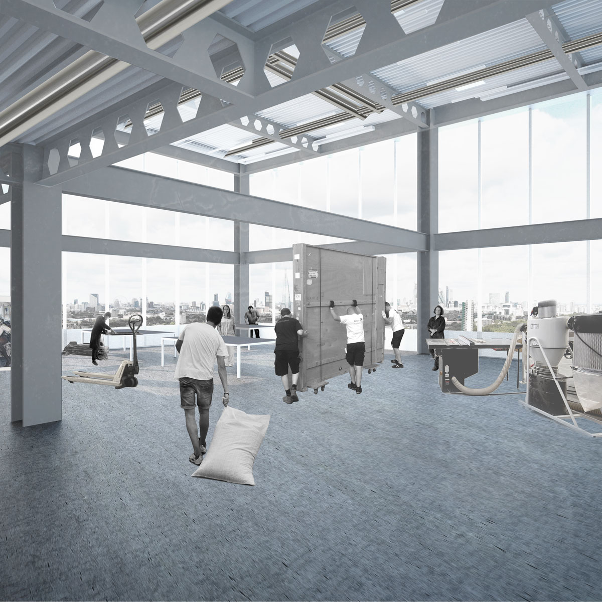 This proposal, developed in collaboration with Bold Tendencies, aims to challenge the status quo, with a custom-built tall building in which artistic and community functions sit above a light industrial plinth.