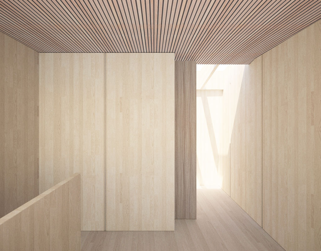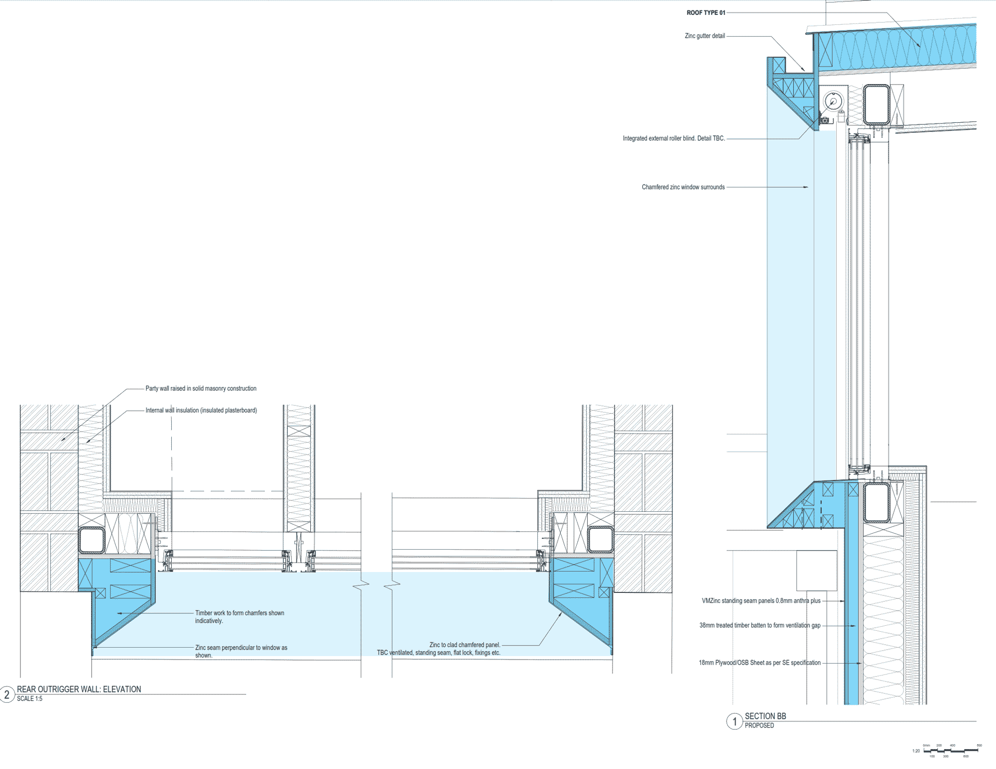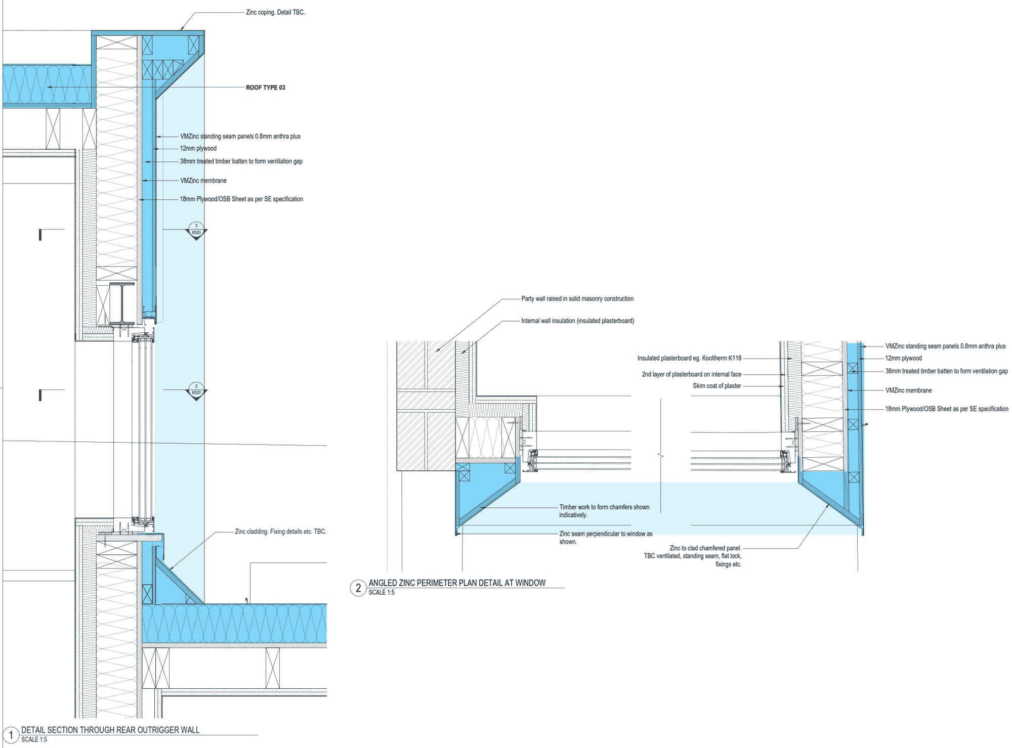 The extension takes on the traditional form of a mansard at the front, but opting for sloping skylights in place of the traditional dormer windows. To the rear, a full-width glazed element spans from wall-to-wall above the outrigger roof extension. Zinc ties the new roof surfaces together with an understated material logic.