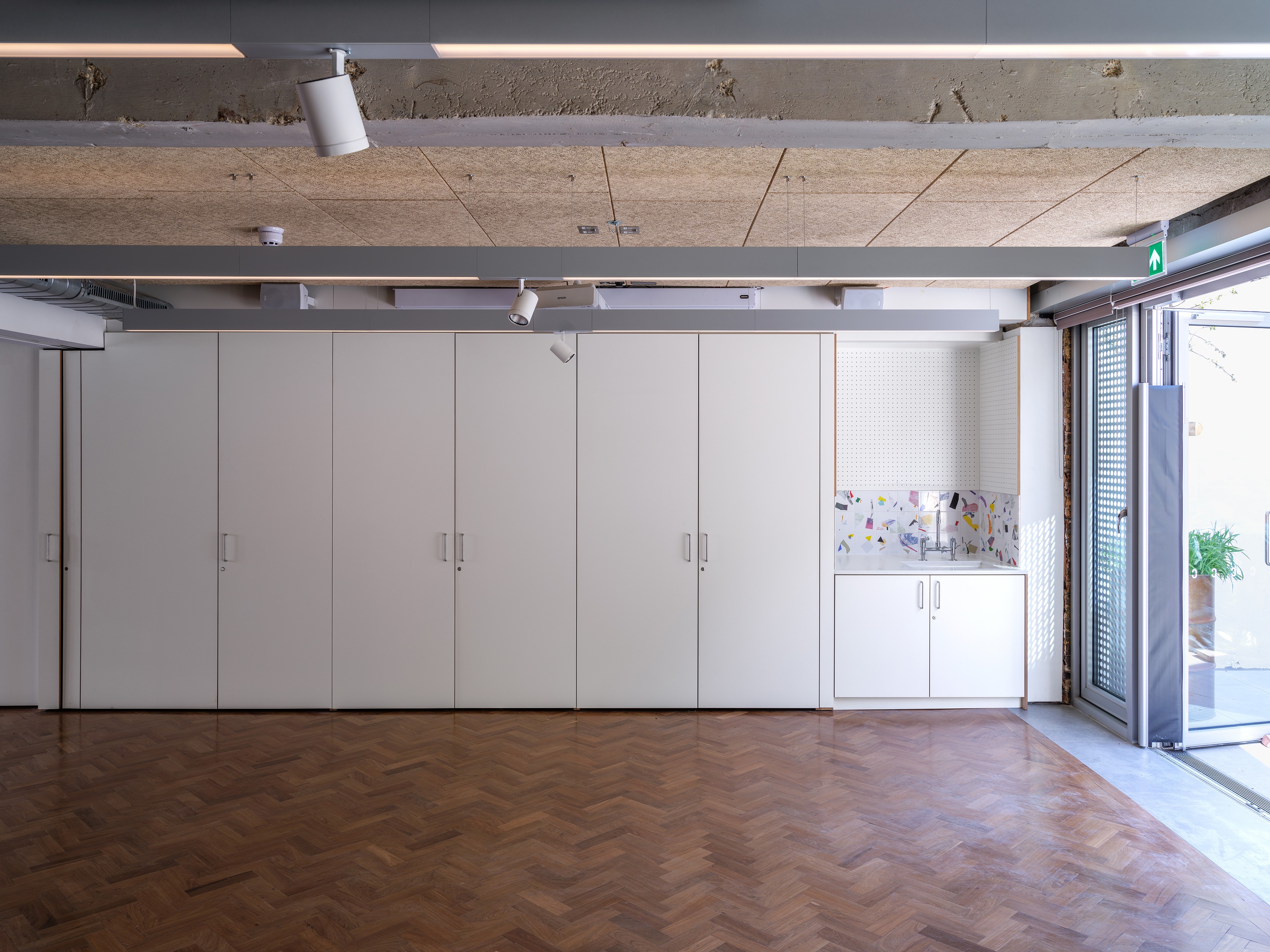 Passive design principles have informed the orientation, form and massing of a new makers’ studio block - unlocking under-utilised space in the backyard. The design achieves exemplary low-energy standards throughout new and refurbished areas – for example with a new façade for the ground floor areas of the existing building, and the construction of a new wood workshop. In collaboration with Max Fordham LLP, we have introduced air source heat pumps for the workshop, several MVHR units and extensive passive solutions for ventilation and shading. As part of the retrofit of existing spaces, radiators have been oversized so that when Cockpit make the switch to heat pumps for the main building heating, these refurbished areas are future proofed.
