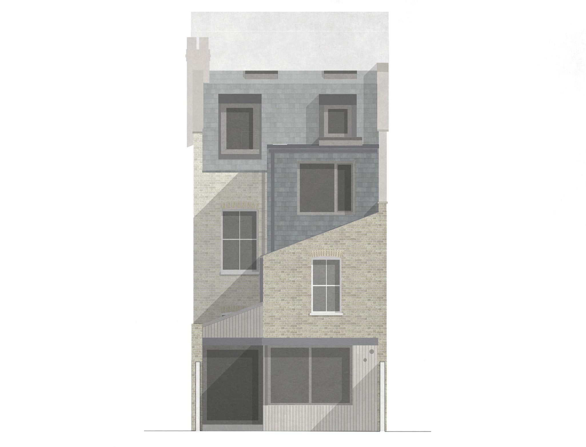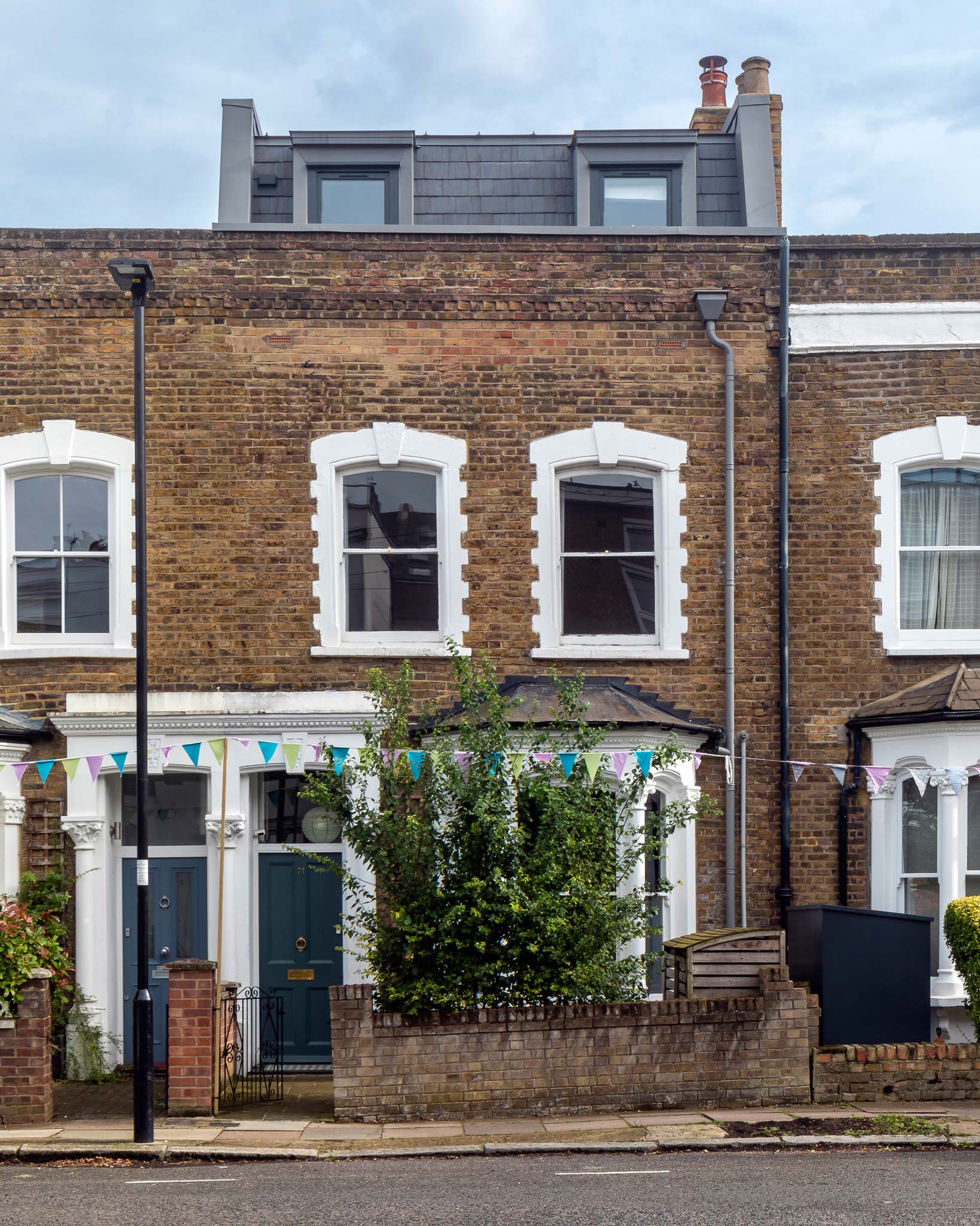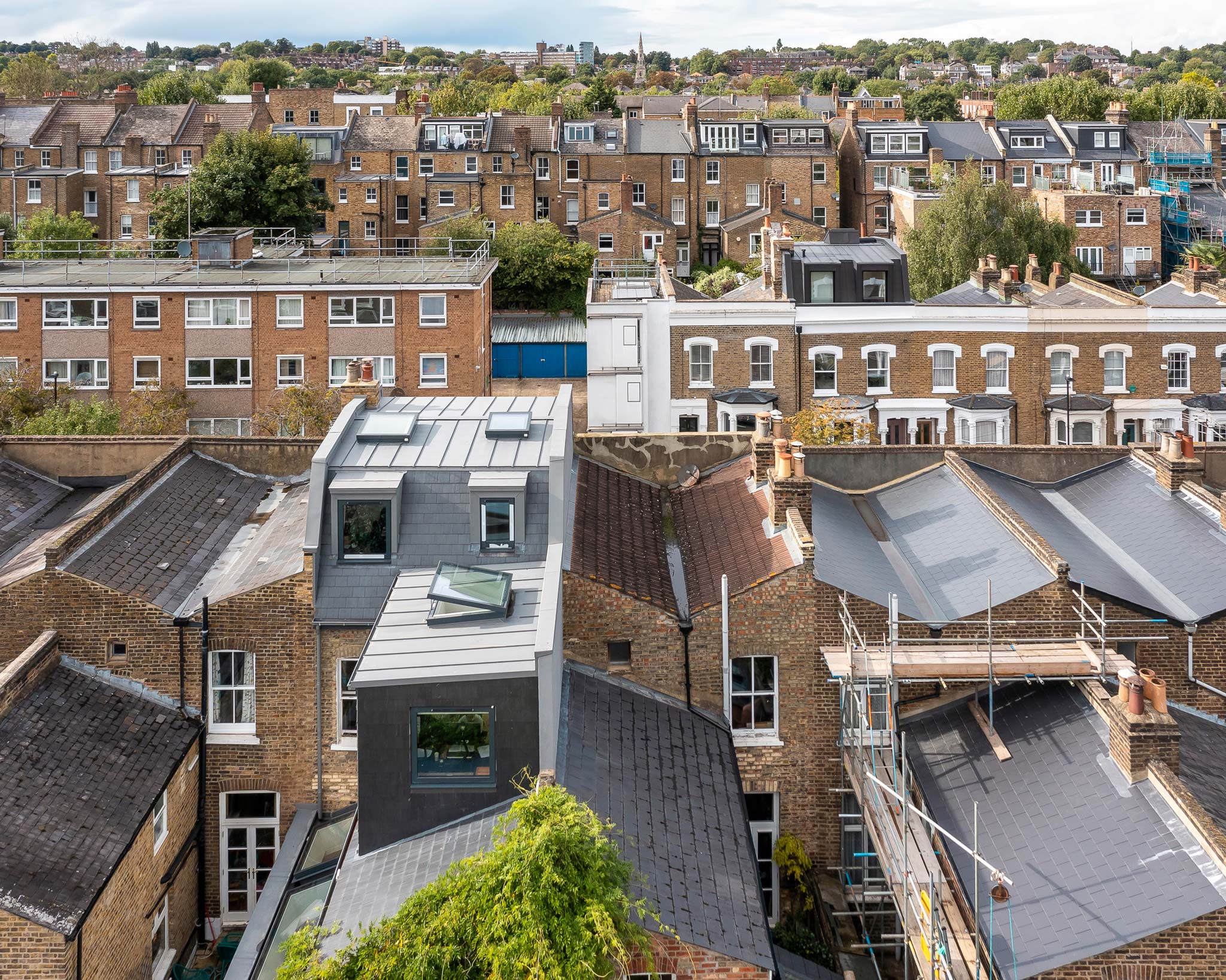 A mansard loft conversion and side return extension that resolves a specific live-work brief by reorganising an entire house vertically, adding 40% more floor area to a Victorian terraced house. Islington's acceptance of mansard conversions in this part of Finsbury Park is recent, and required demonstrating that the form can sit respectfully within the streetscape. Once approved, the real design question becomes how to use the new space well. Here the brief made the answer clear: the clients, an academic and a barrister, both work from home and needed a dedicated, acoustically isolated work floor.