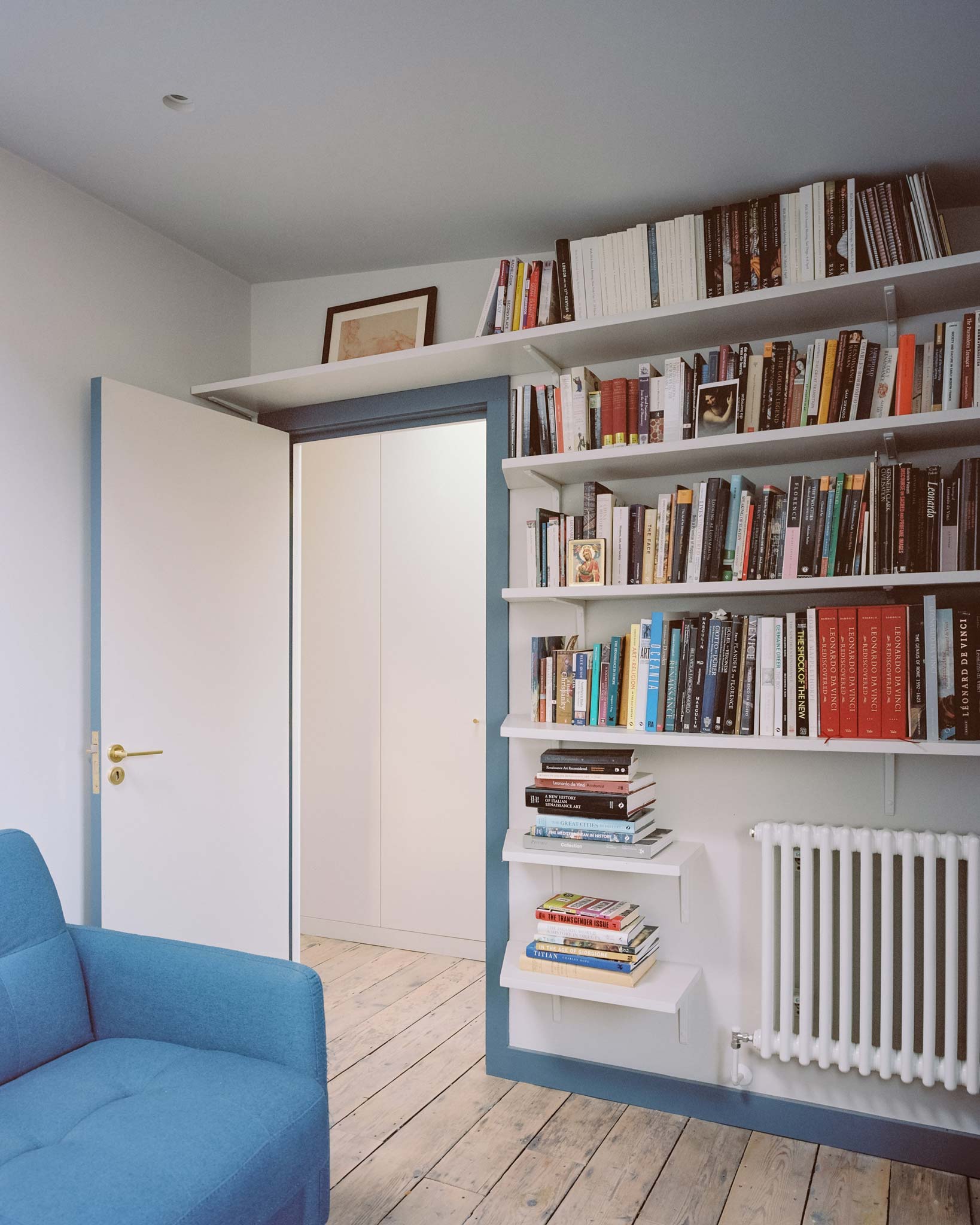 The new top floor creates two studies, a spare bedroom and shower room, separated by acoustic construction from the rest of the house. The challenge with a heavily partitioned plan is preventing it from feeling compartmentalised. Glazing to the stair, internal sightlines through the spaces, and generous rooflights maintain a sense of height and openness throughout.