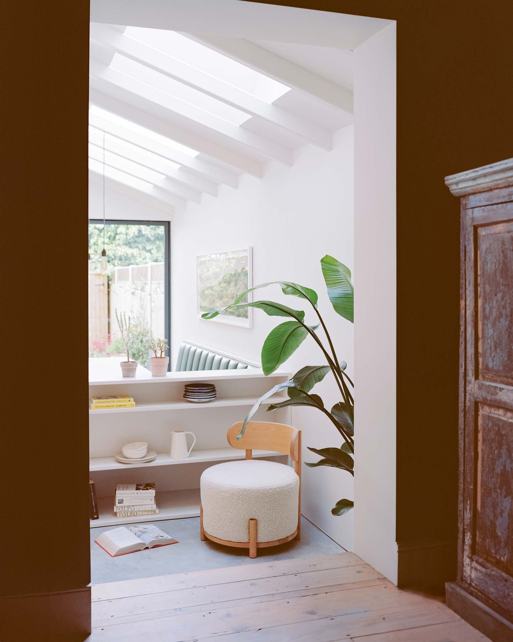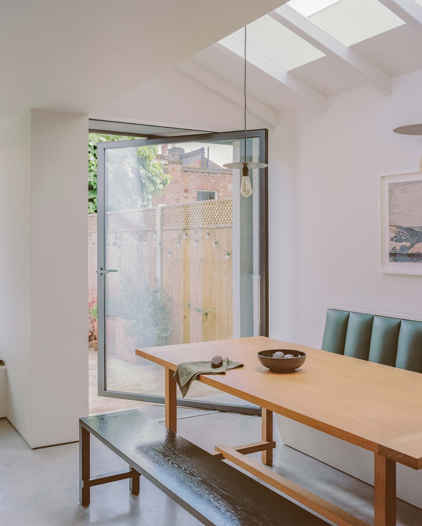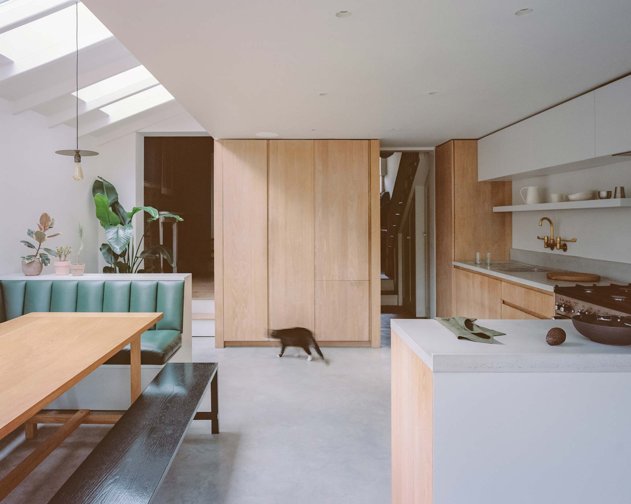 Freeing the top floor for work allows the ground floor to operate as a connected series of living spaces. The side return becomes a kitchen-dining room that anchors the rear of the house. A wide pivot door opens the full width to the garden, and a projecting bay window pulls greenery directly into the room. Planting wires for the client's wisteria mean the view is framed by green-on-green as the climber establishes. The joinery is bespoke and carefully made, giving the kitchen a hand-crafted quality without visual noise. Raw timber and concrete complete a restrained, tactile palette throughout.