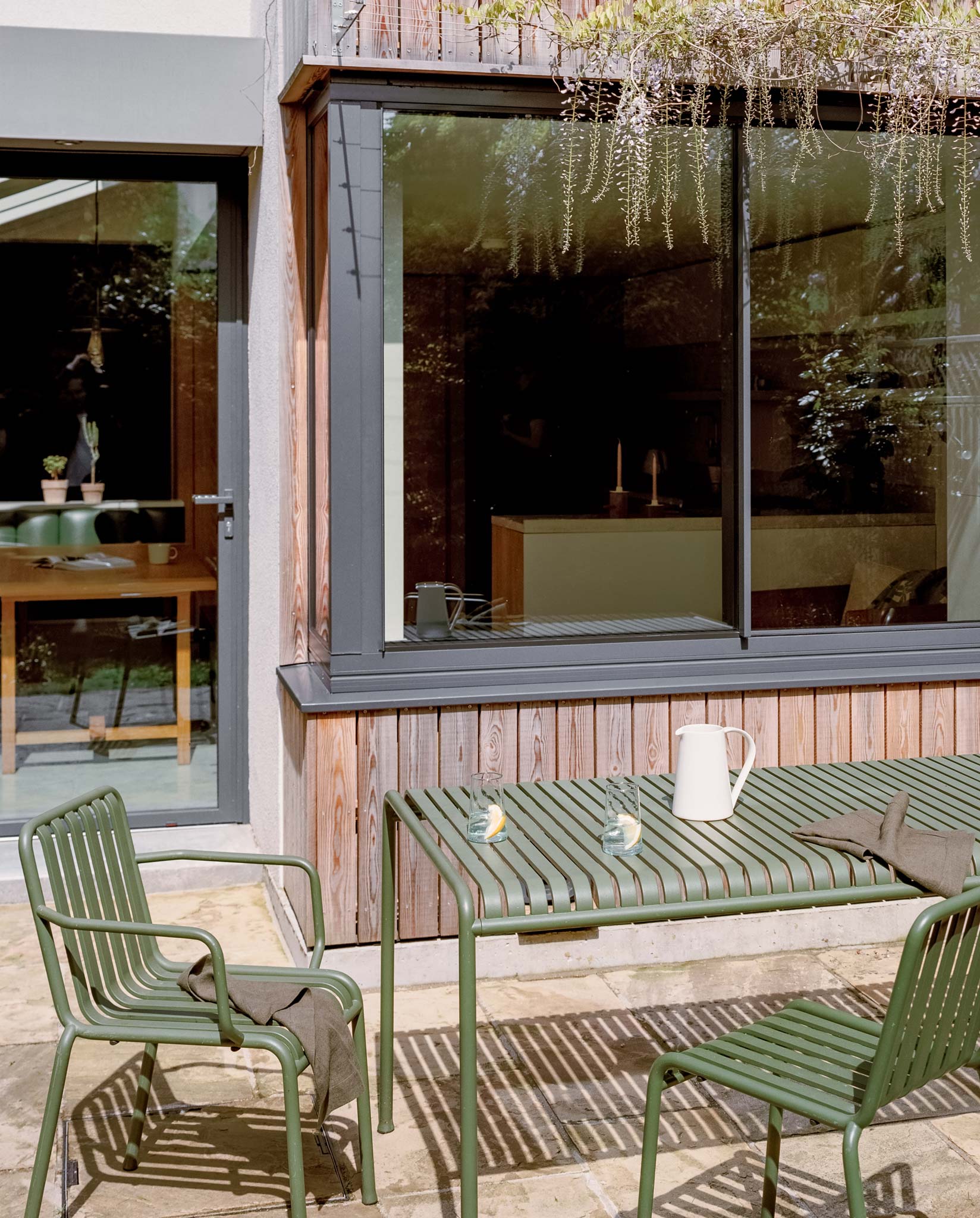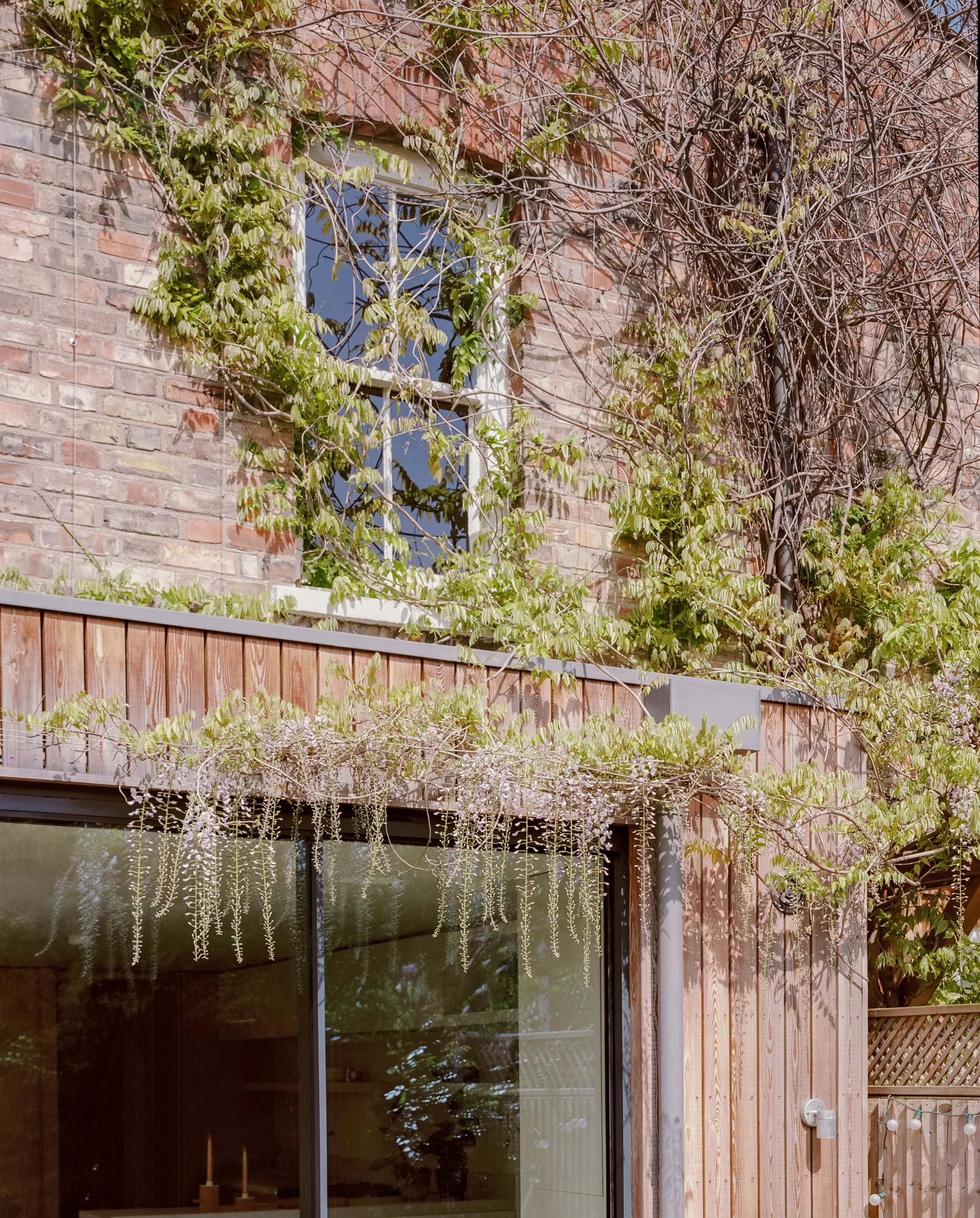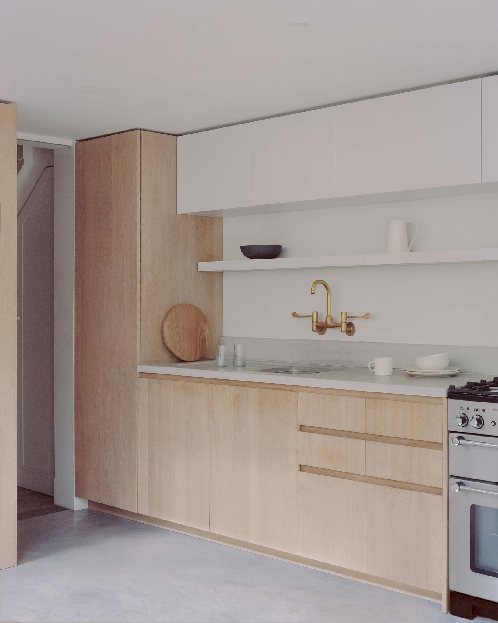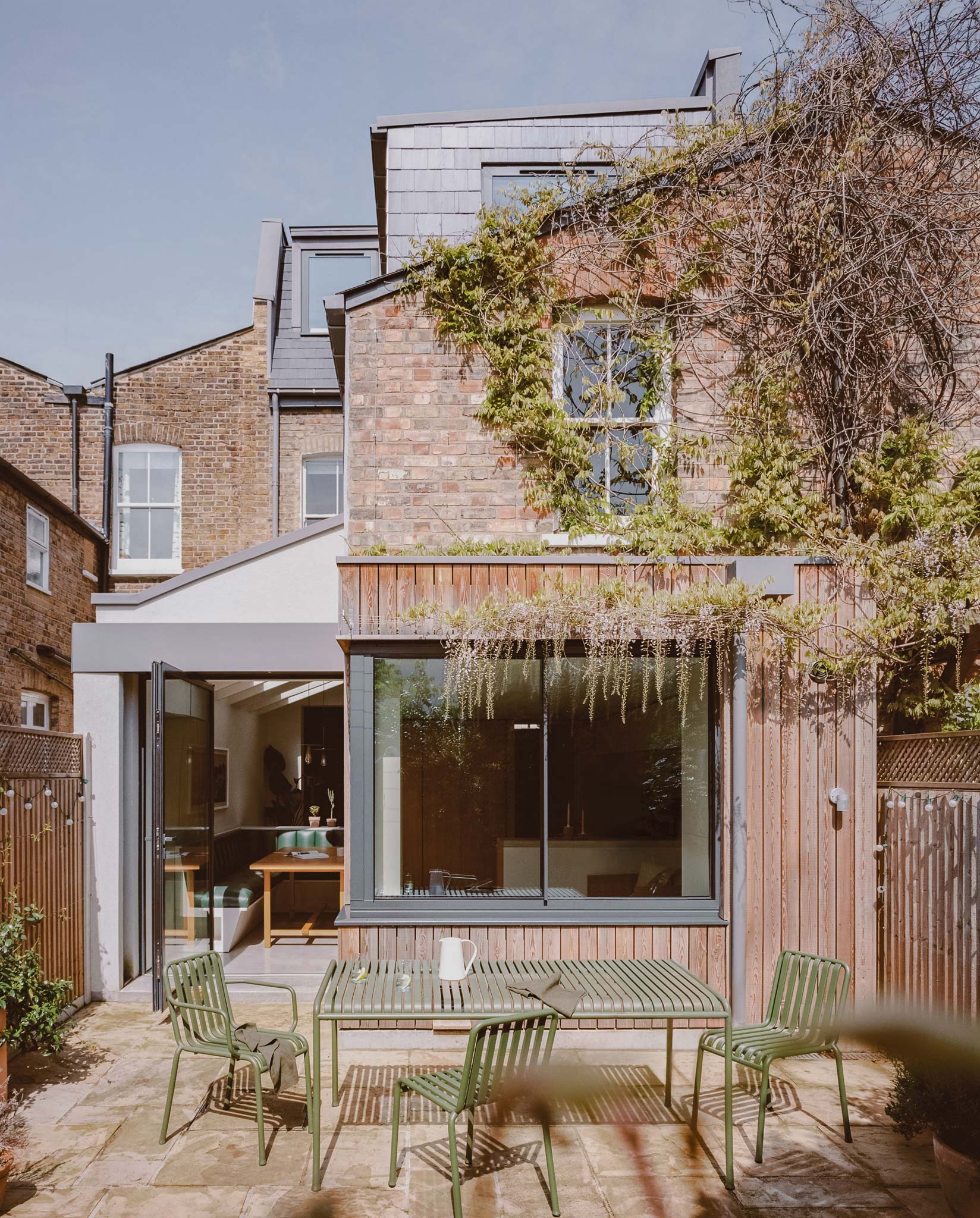 Freeing the top floor for work allows the ground floor to operate as a connected series of living spaces. The side return becomes a kitchen-dining room that anchors the rear of the house. A wide pivot door opens the full width to the garden, and a projecting bay window pulls greenery directly into the room. Planting wires for the client's wisteria mean the view is framed by green-on-green as the climber establishes. The joinery is bespoke and carefully made, giving the kitchen a hand-crafted quality without visual noise. Raw timber and concrete complete a restrained, tactile palette throughout.