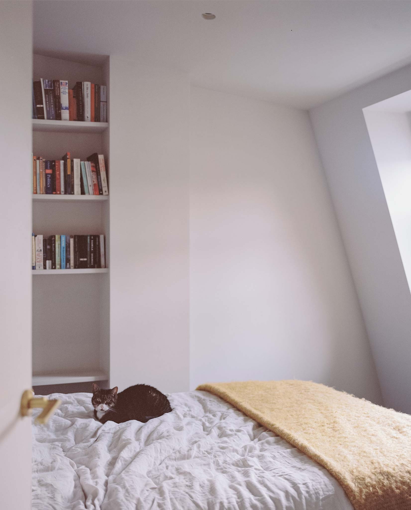 The mansard roof geometry is not treated as a constraint. It determines the spatial character of the upper floor, and the design uses height and section rather than floor area alone to create rooms with genuine presence.