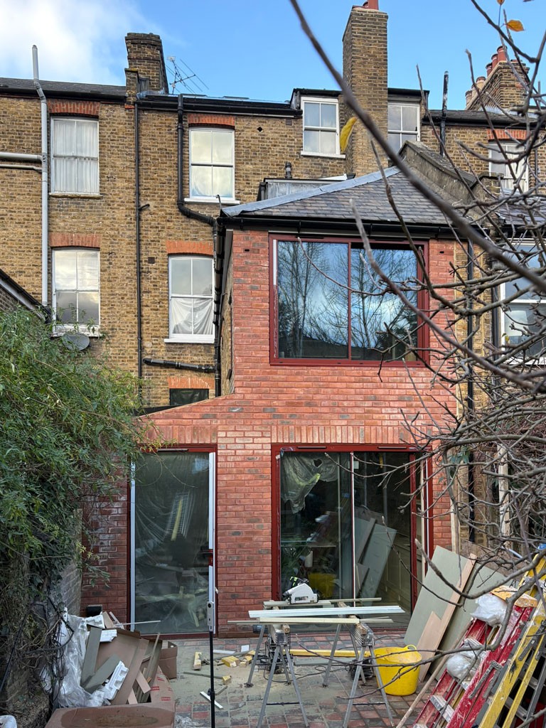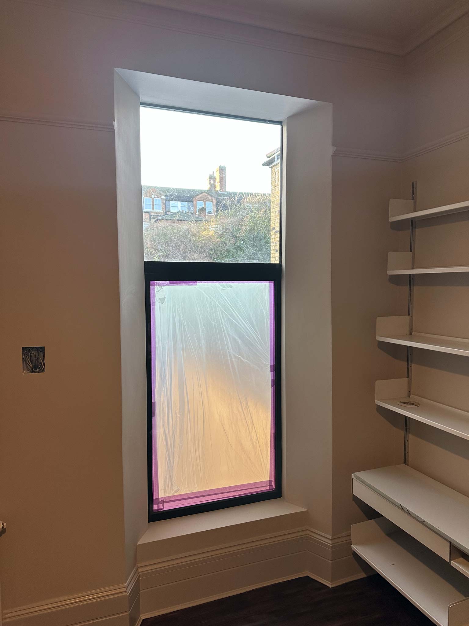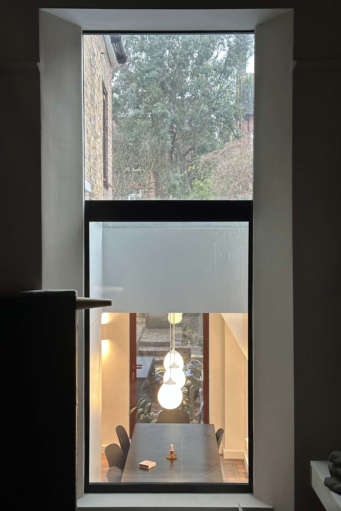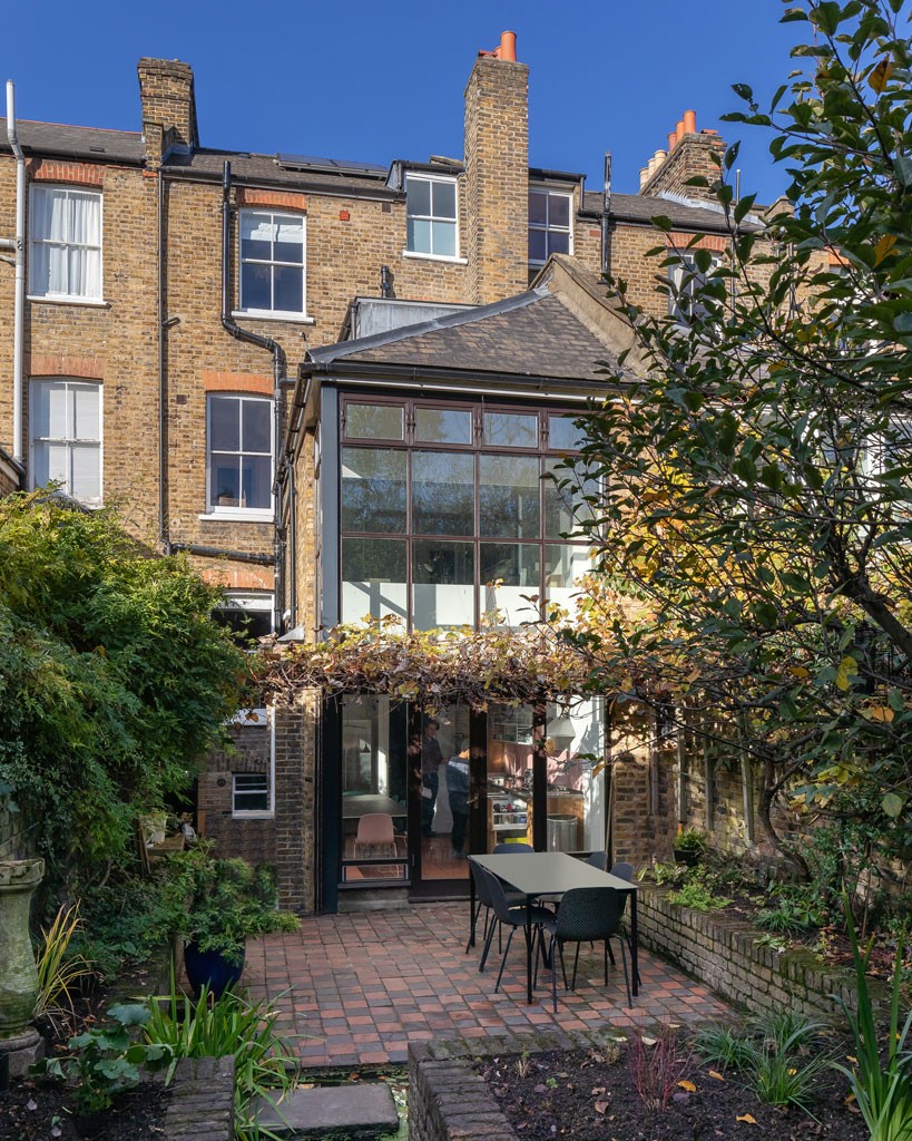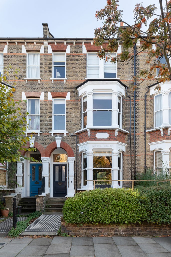 Central to the brief was a significant improvement in environmental performance. The existing rear outrigger — clad in an ill-judged double-height glass facade that overheated in summer and lost heat in winter — has been reclad in brick with carefully considered glazed openings, restoring the rhythm of the surrounding terrace while dramatically improving thermal comfort. Elsewhere, single-glazed sash windows have been replaced with double-glazed timber equivalents, matched precisely to the originals in dimension, profile and finish — a requirement of the conservation area's Article 4 direction. An air source heat pump, discreetly positioned behind the front garden hedge, replaces the gas boiler, supported by solar panels on the rear roof slope.