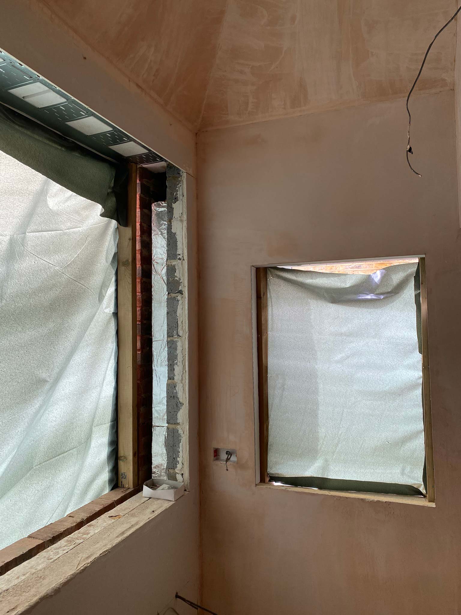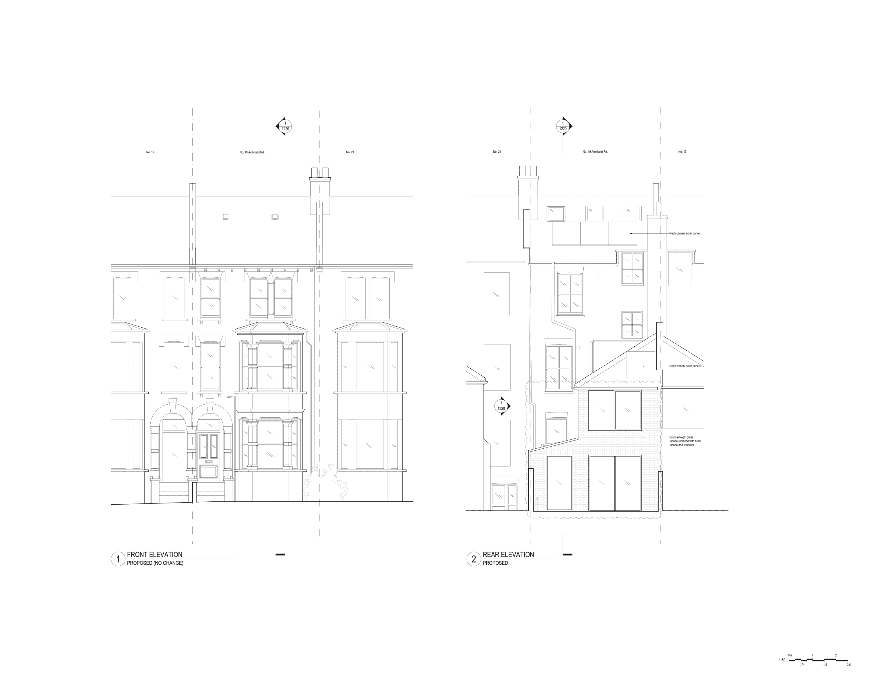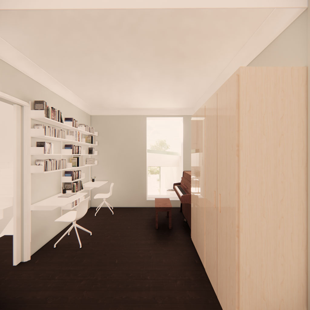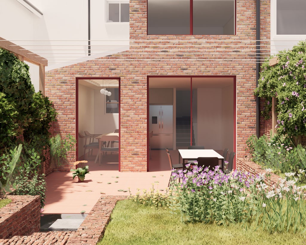 Central to the brief was a significant improvement in environmental performance. The existing rear outrigger — clad in an ill-judged double-height glass facade that overheated in summer and lost heat in winter — has been reclad in brick with carefully considered glazed openings, restoring the rhythm of the surrounding terrace while dramatically improving thermal comfort. Elsewhere, single-glazed sash windows have been replaced with double-glazed timber equivalents, matched precisely to the originals in dimension, profile and finish — a requirement of the conservation area's Article 4 direction. An air source heat pump, discreetly positioned behind the front garden hedge, replaces the gas boiler, supported by solar panels on the rear roof slope.