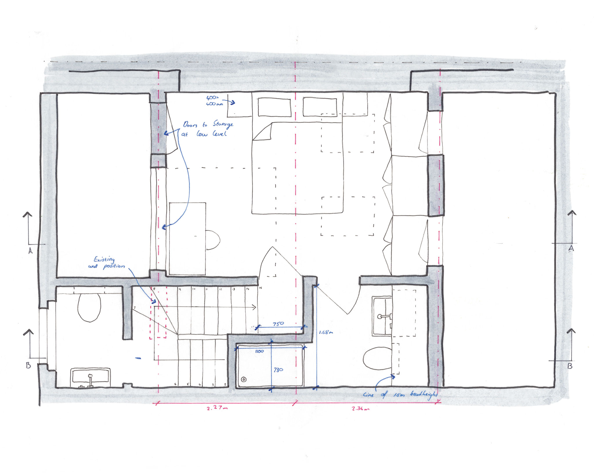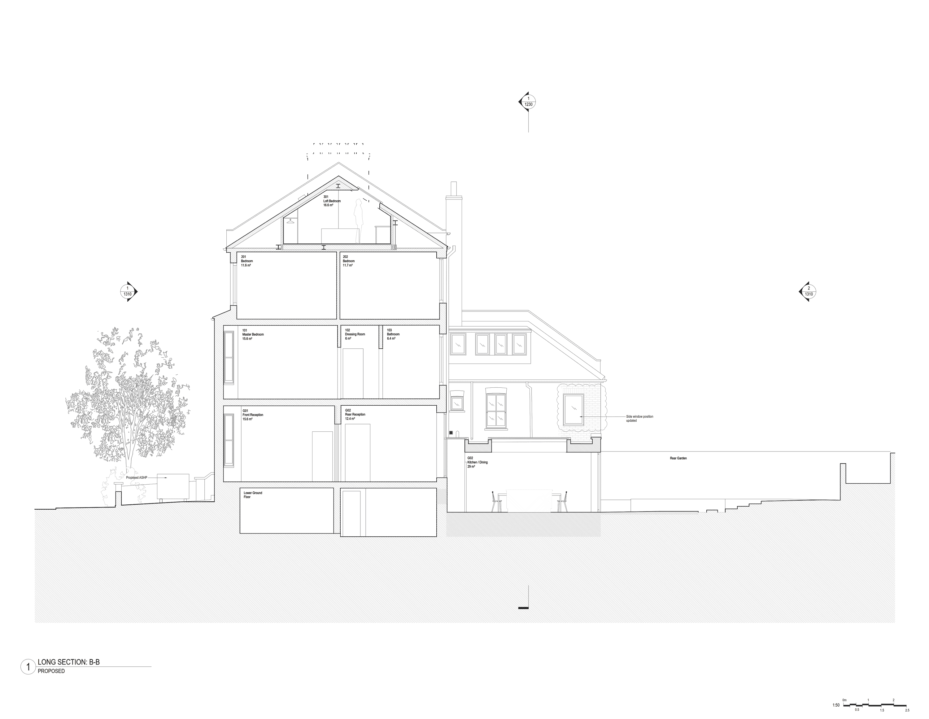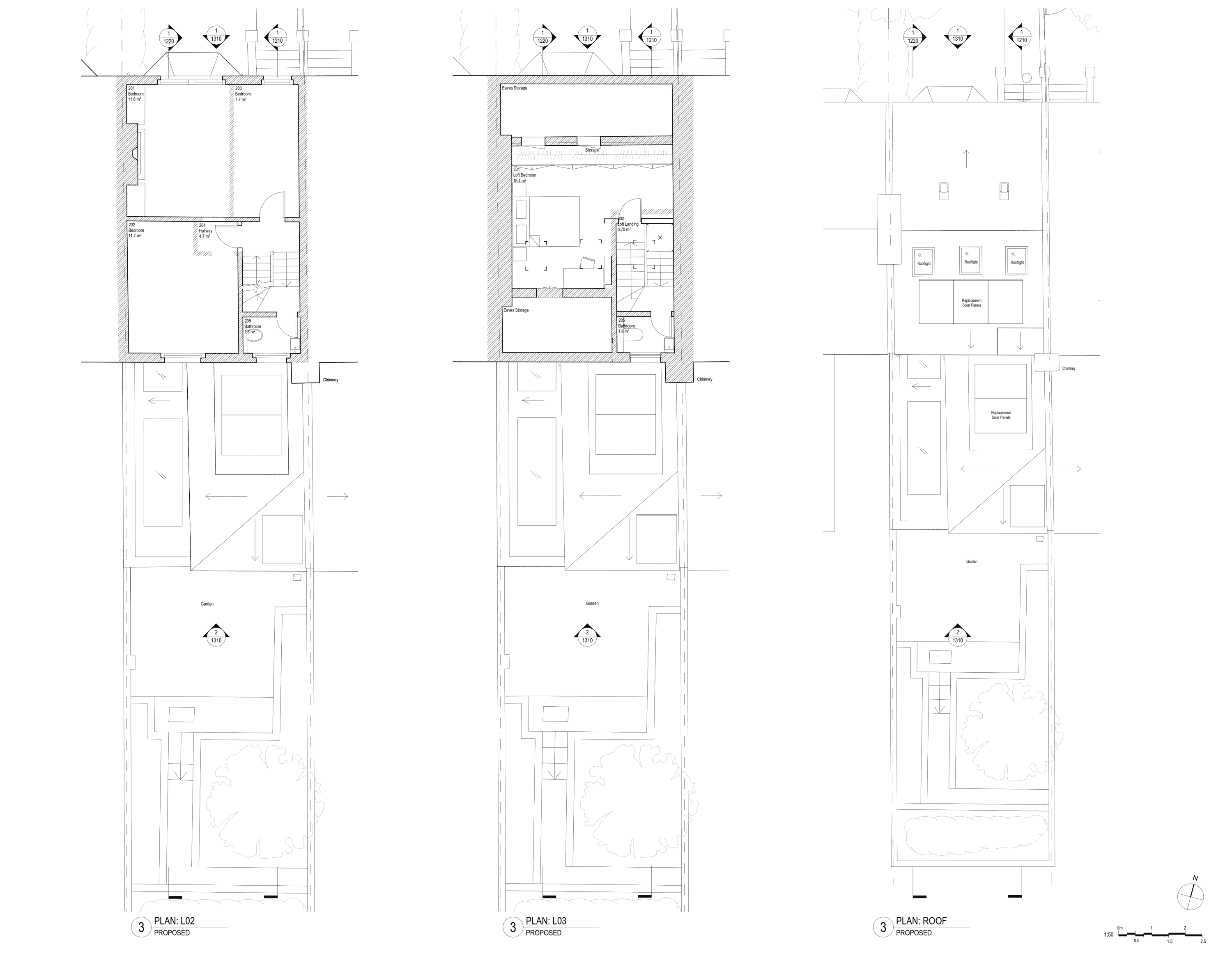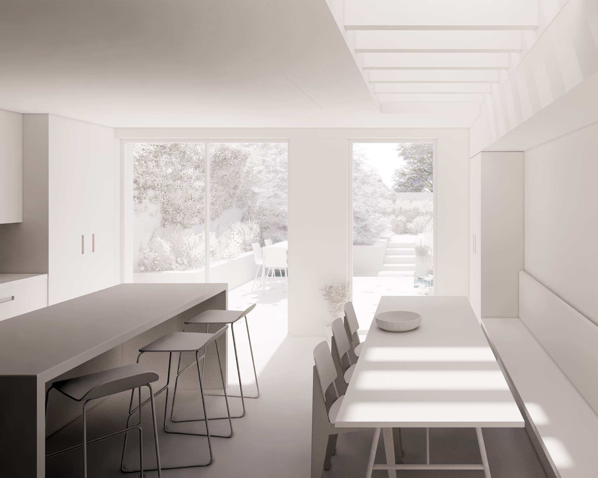 Central to the brief was a significant improvement in environmental performance. The existing rear outrigger — clad in an ill-judged double-height glass facade that overheated in summer and lost heat in winter — has been reclad in brick with carefully considered glazed openings, restoring the rhythm of the surrounding terrace while dramatically improving thermal comfort. Elsewhere, single-glazed sash windows have been replaced with double-glazed timber equivalents, matched precisely to the originals in dimension, profile and finish — a requirement of the conservation area's Article 4 direction. An air source heat pump, discreetly positioned behind the front garden hedge, replaces the gas boiler, supported by solar panels on the rear roof slope.