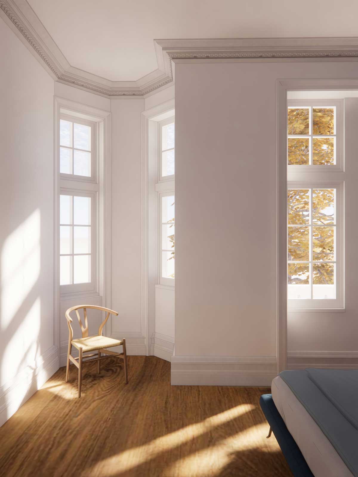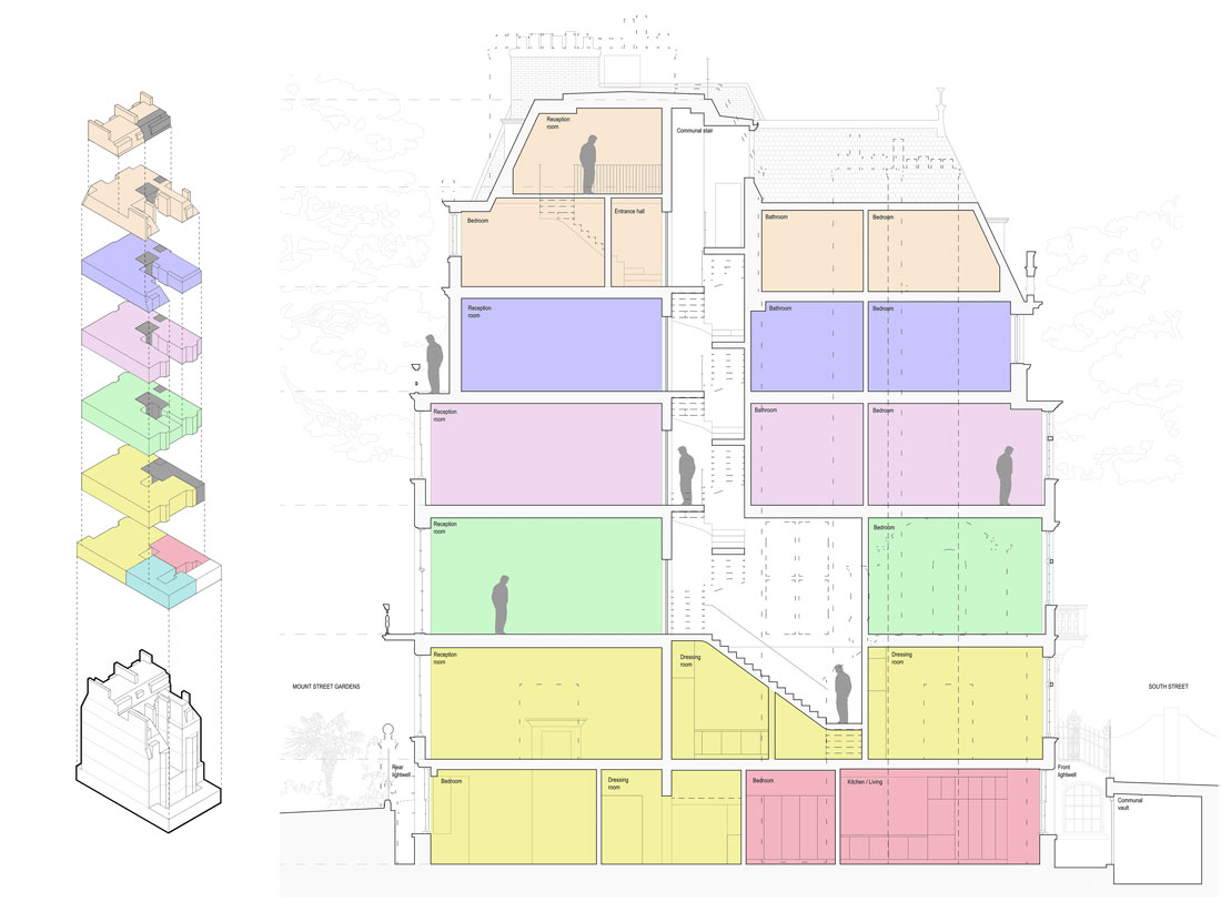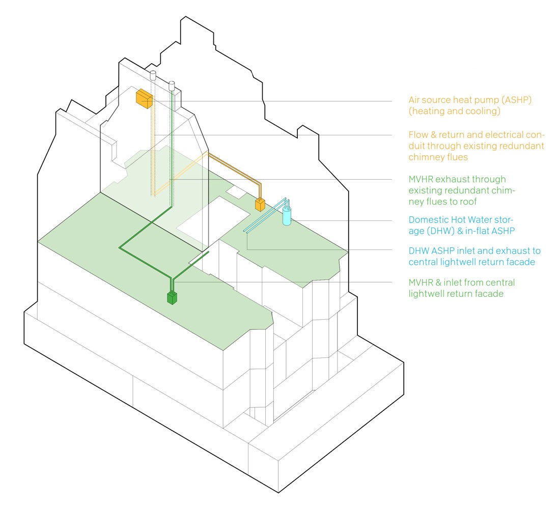 We were challenged to provide a generational upgrade to the building's services and communal spaces, to meet modern standards and expectations, and to provide a better mix of flat sizes and layouts. We had to sensitively work around the substantial internal alterations that had been made down the years, while installing vital equipment such as air-source heat pumps which would help future-proof the building. Our proposal was successful in gaining planning and Listed Building consents.