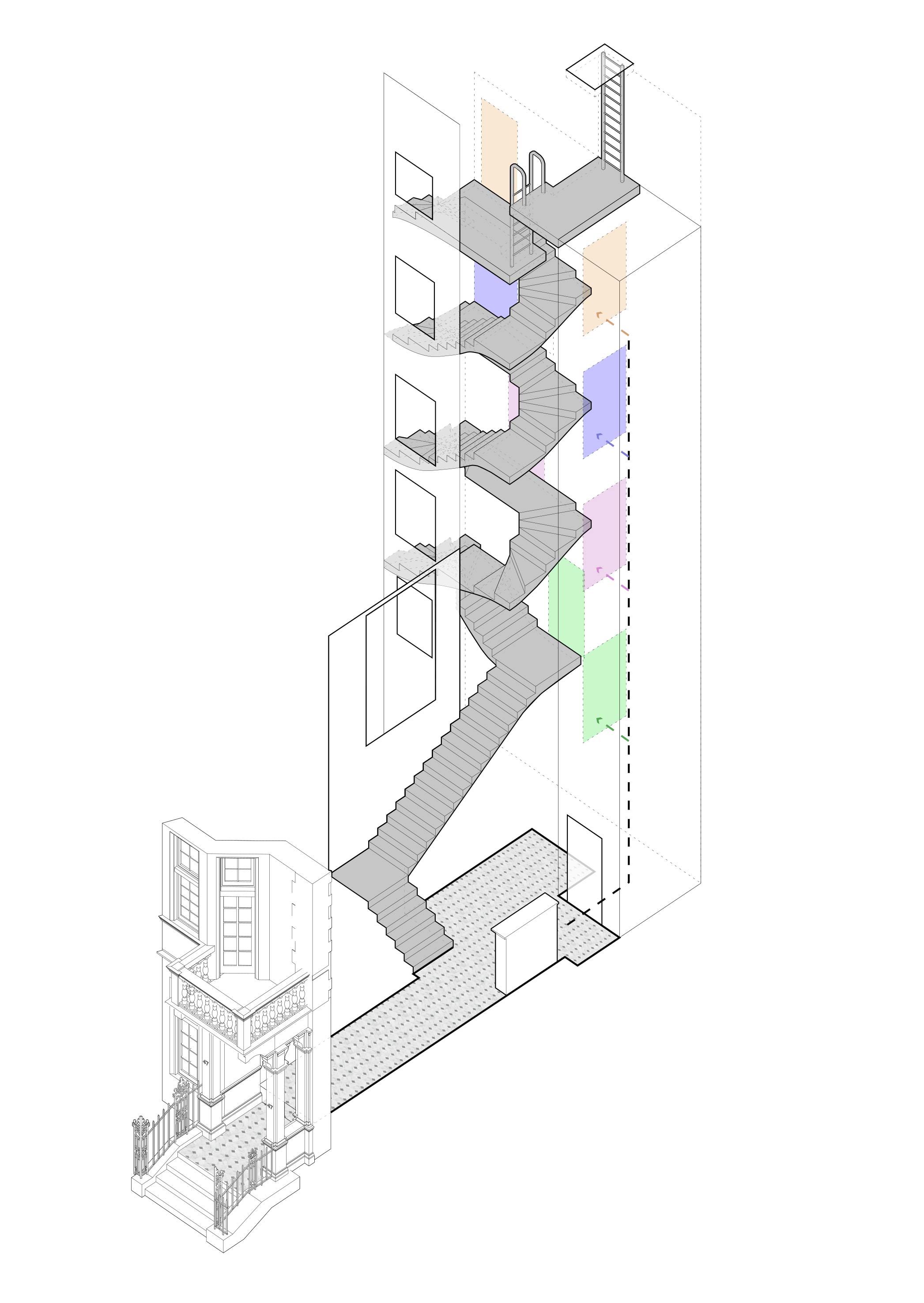 Full redesign of vertical circulation to take advantage of an existing series of windows currently blocked by the lift