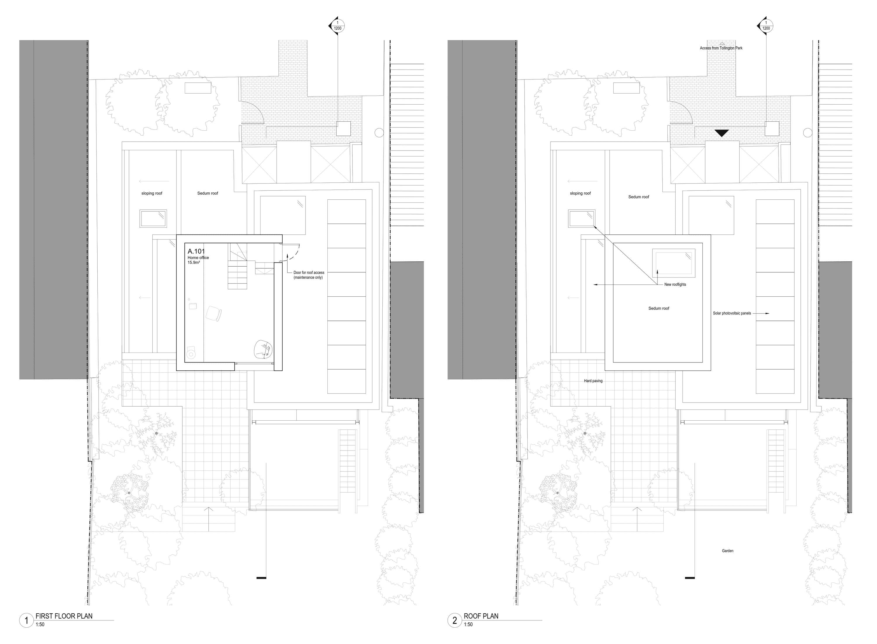 A ground-floor side extension replaces a former terrace, designed to give back what it takes: a generous window seat and large glazed doors re-establish a direct connection to the reformed external terrace. At first-floor level, a new crow's nest volume sits above the roofline to create a dedicated home office, deliberately separate and overlooking the garden. A skylight above the stairwell draws natural light down through both levels.