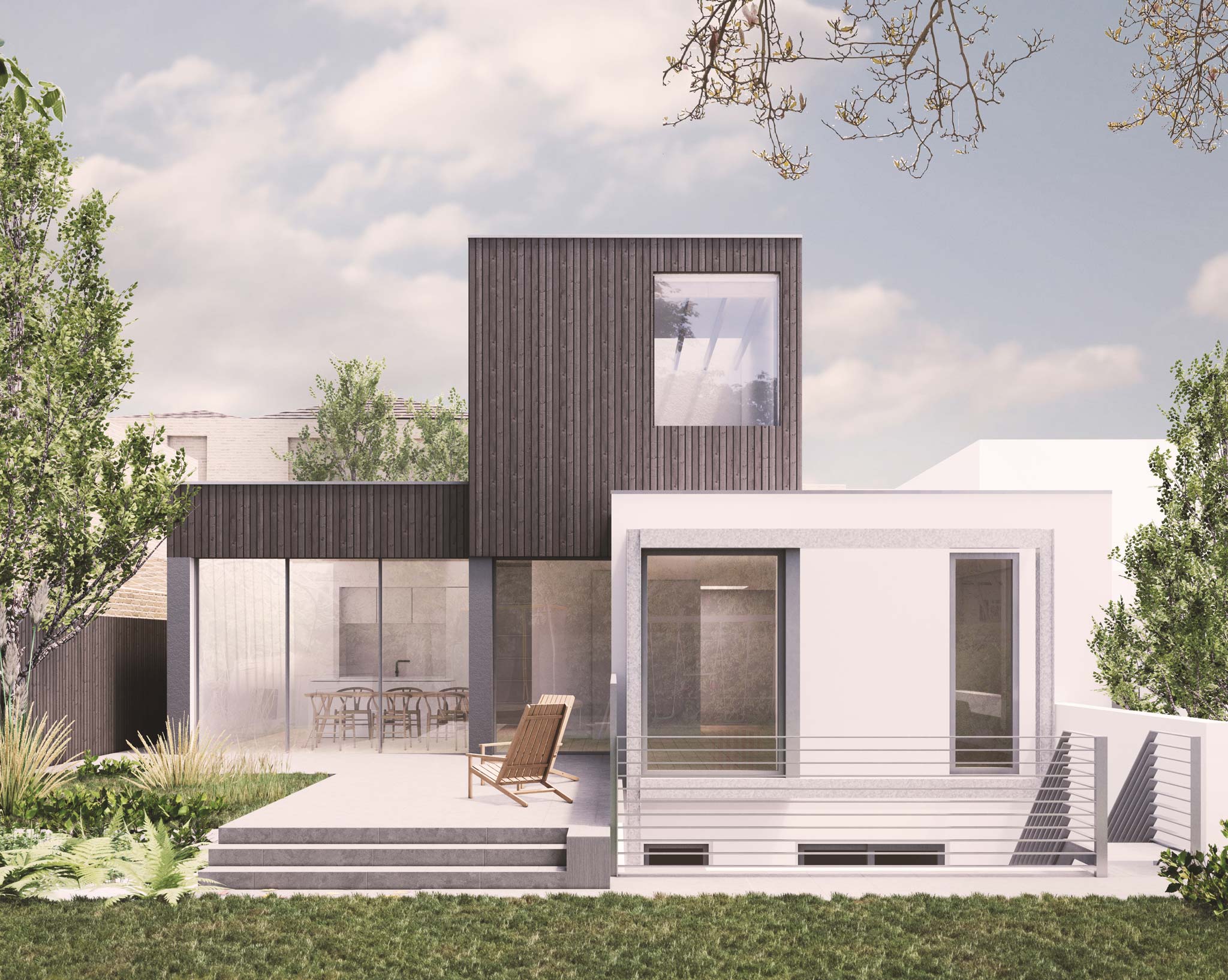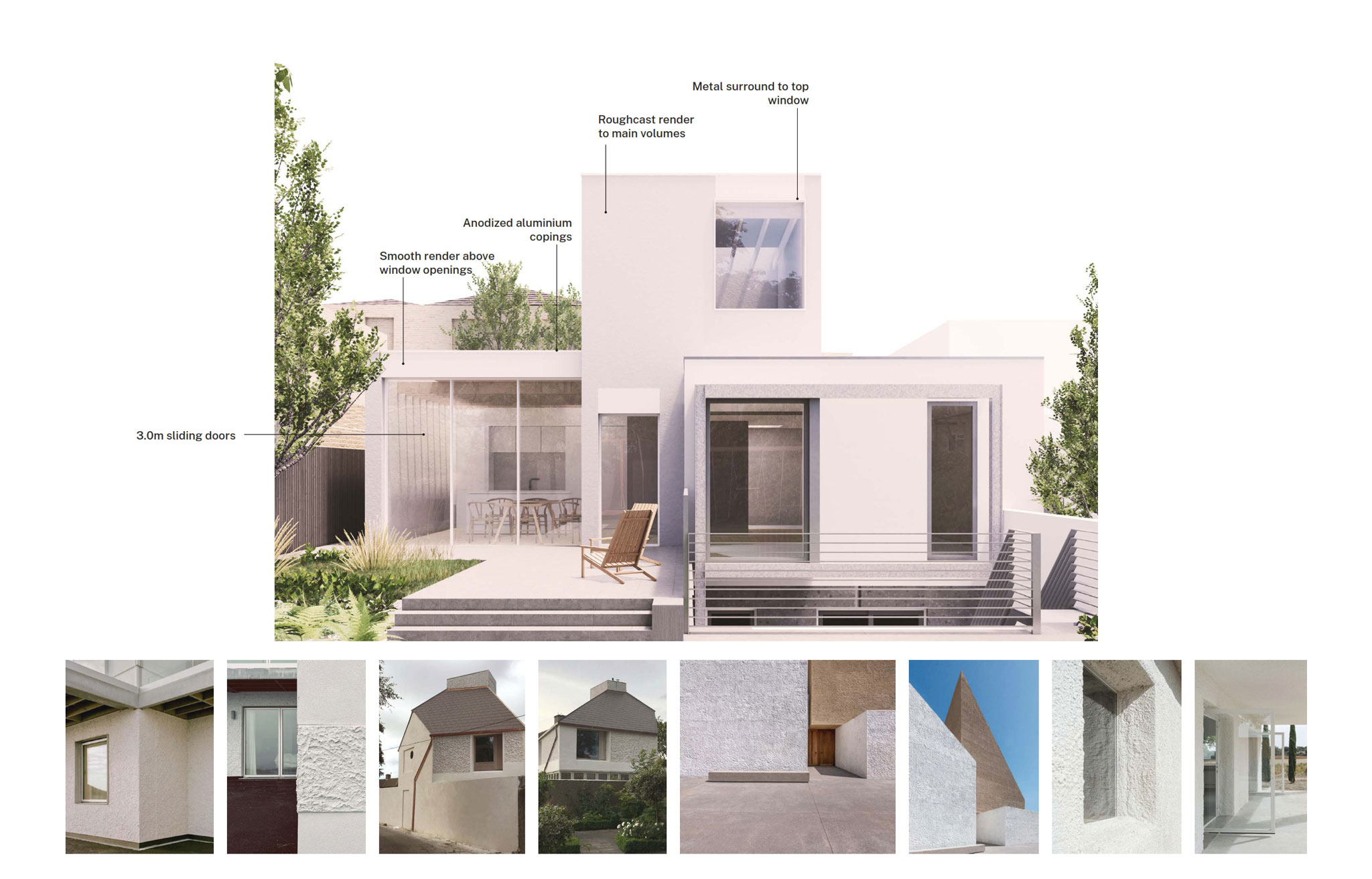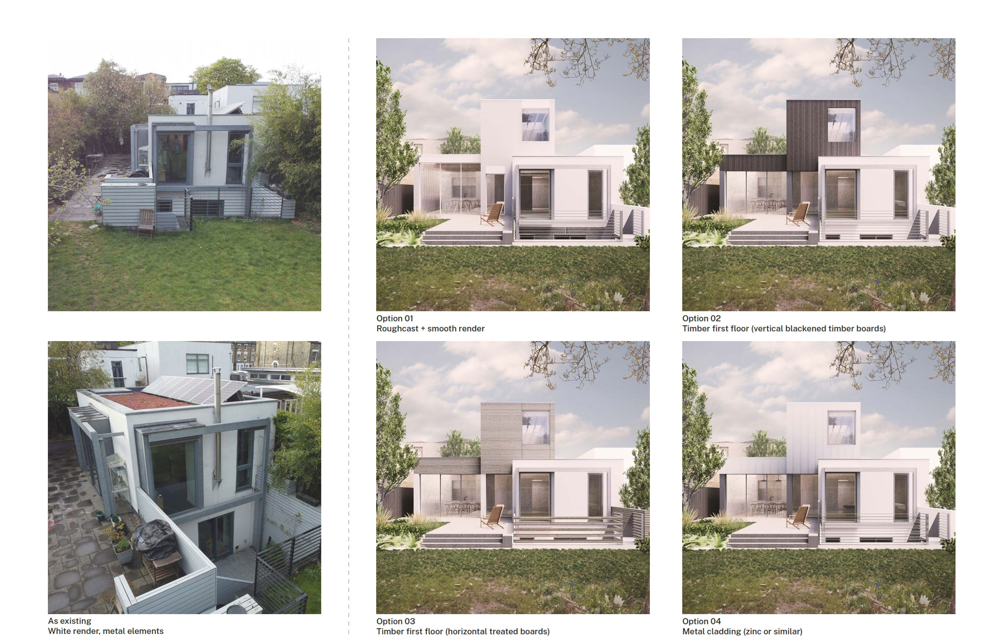 The existing house, built to high environmental standards in the early 2000s, combines white render with zinc and galvanised steel. Rather than mirror this palette, we've proposed a complementary set of materials — weathered timber cladding and rough stucco — that reads as a distinct addition while holding together with the original.