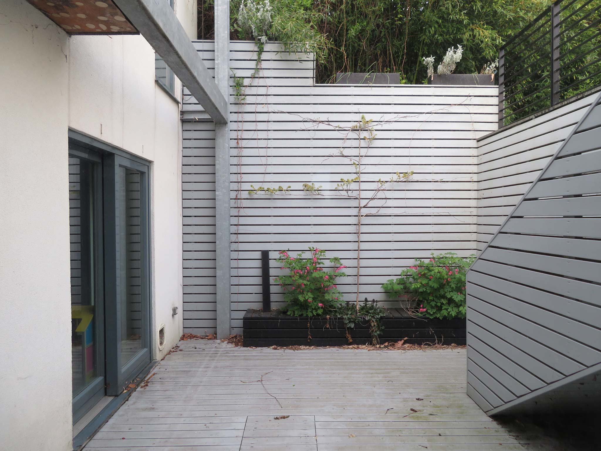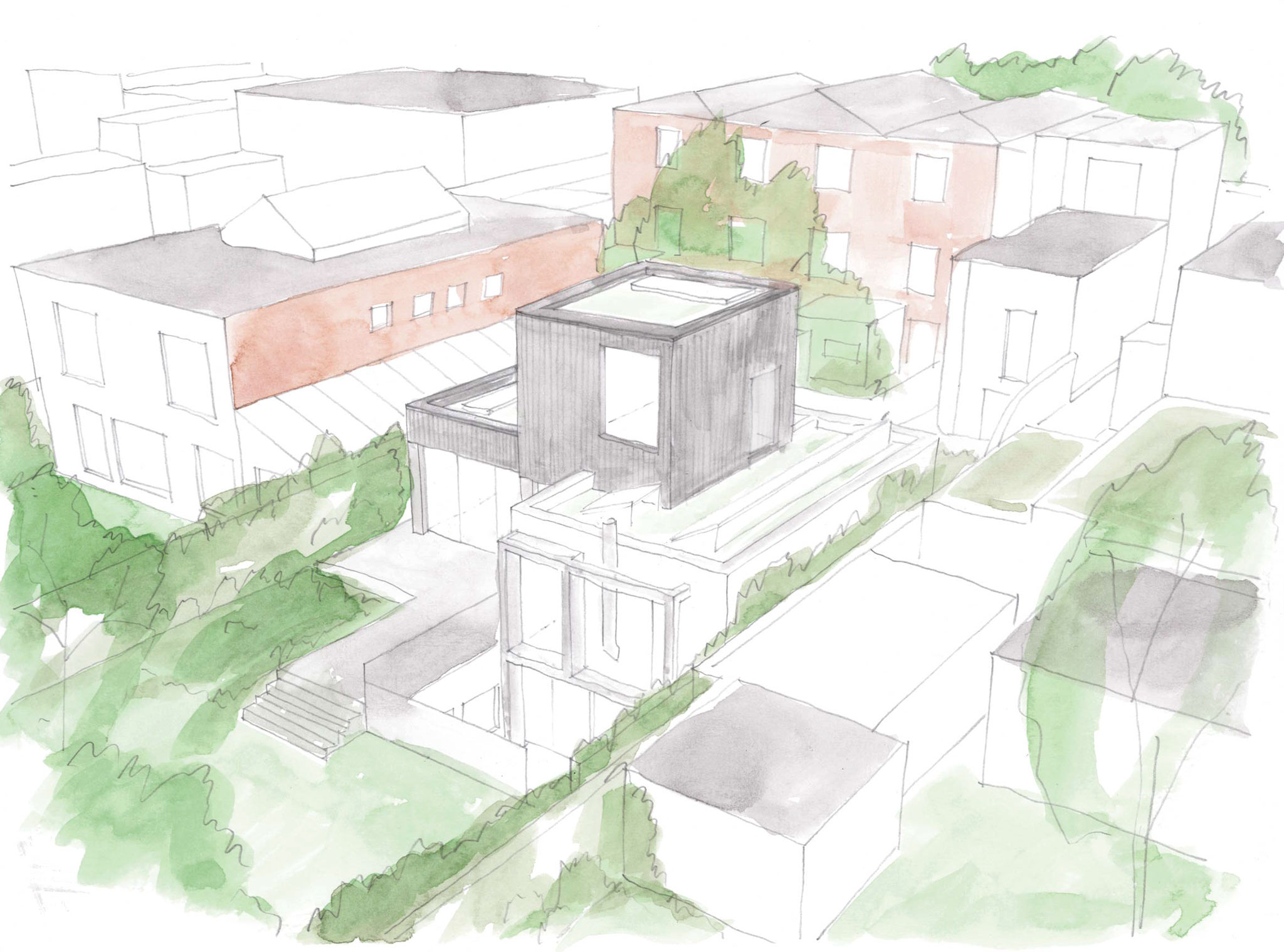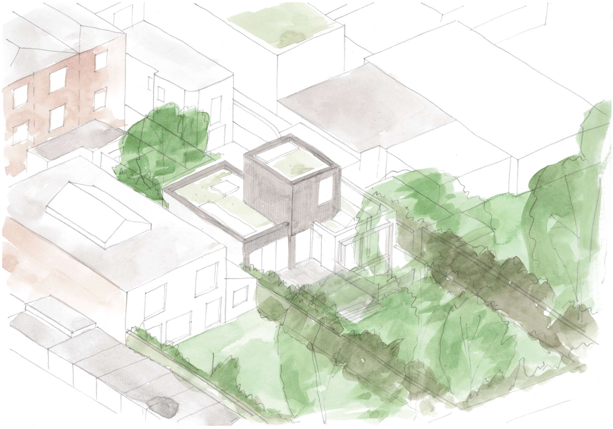 The existing house, built to high environmental standards in the early 2000s, combines white render with zinc and galvanised steel. Rather than mirror this palette, we've proposed a complementary set of materials — weathered timber cladding and rough stucco — that reads as a distinct addition while holding together with the original.