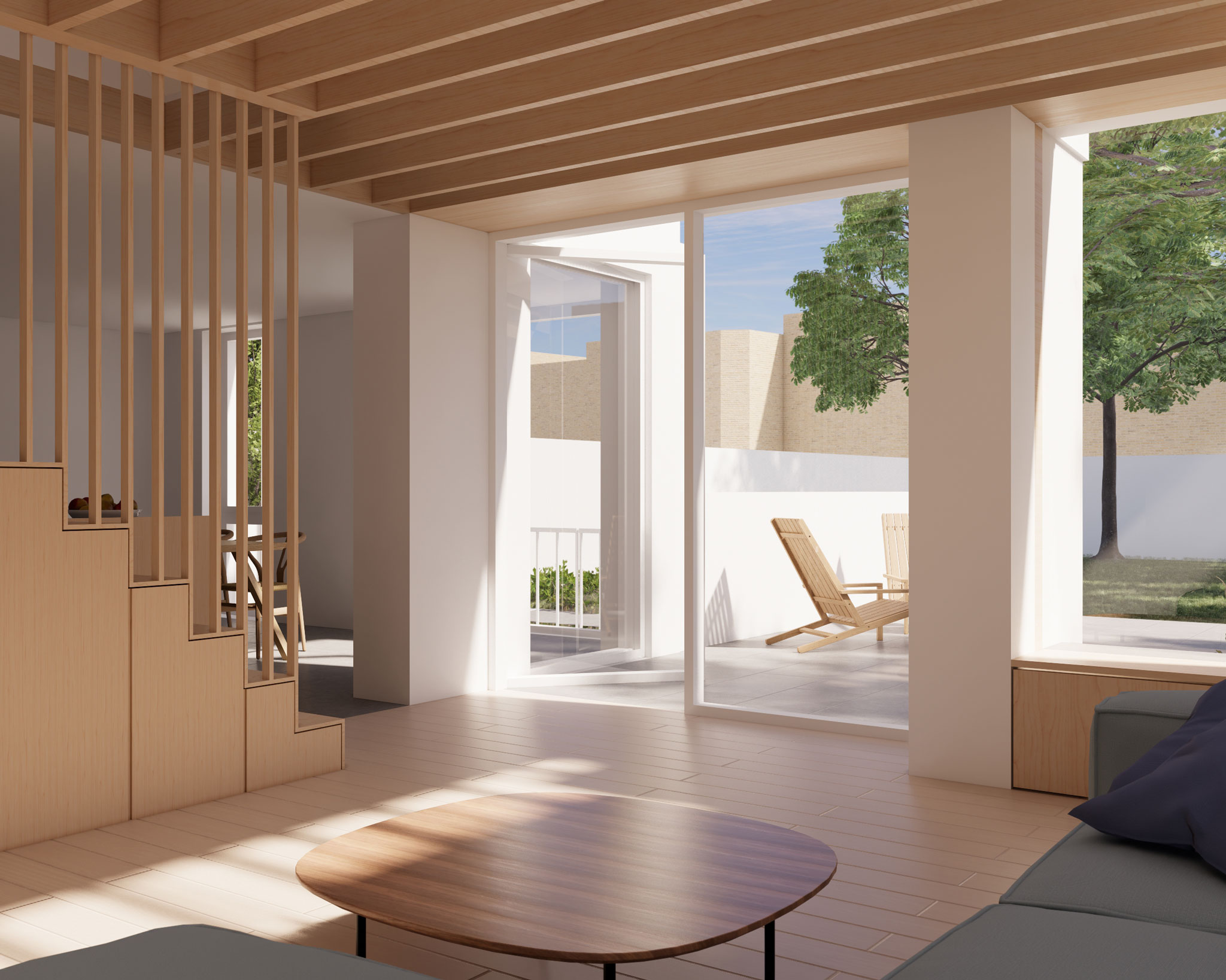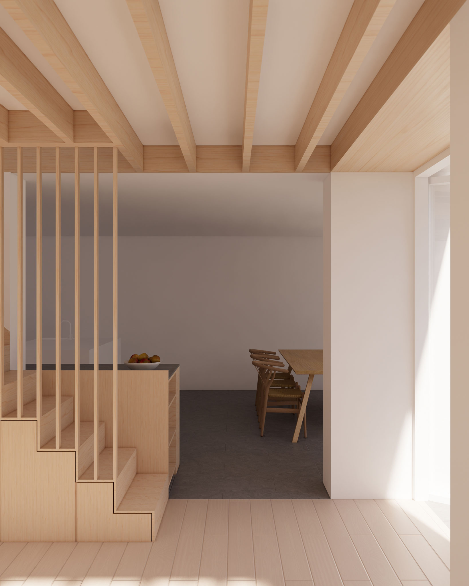 Structurally, integrating the new stair within the extended volume required careful coordination; storage was incorporated into the stair to maintain a sense of lightness when seen from the living room below.