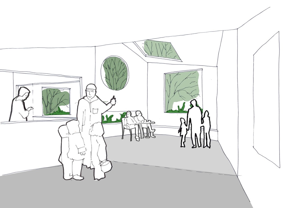 Our proposal for an omni-directional building, shaped by existing pathways and key views, is intended to feel strongly rooted in the setting: a beautiful organic garden, designated as a site of importance for nature conservation. With picture windows and entrances around its full perimeter, the design ensures a constant sense of connection with the gardens and brings in light.