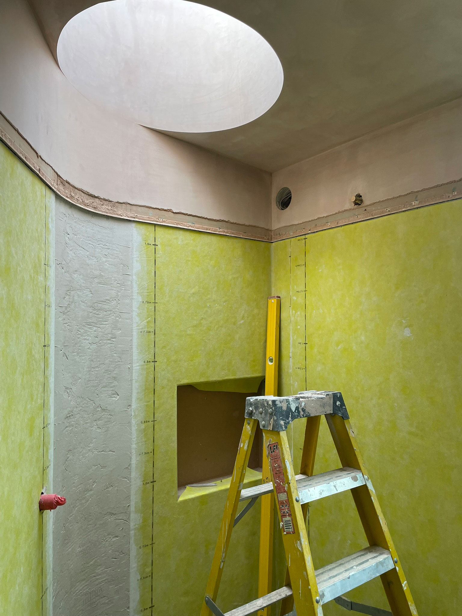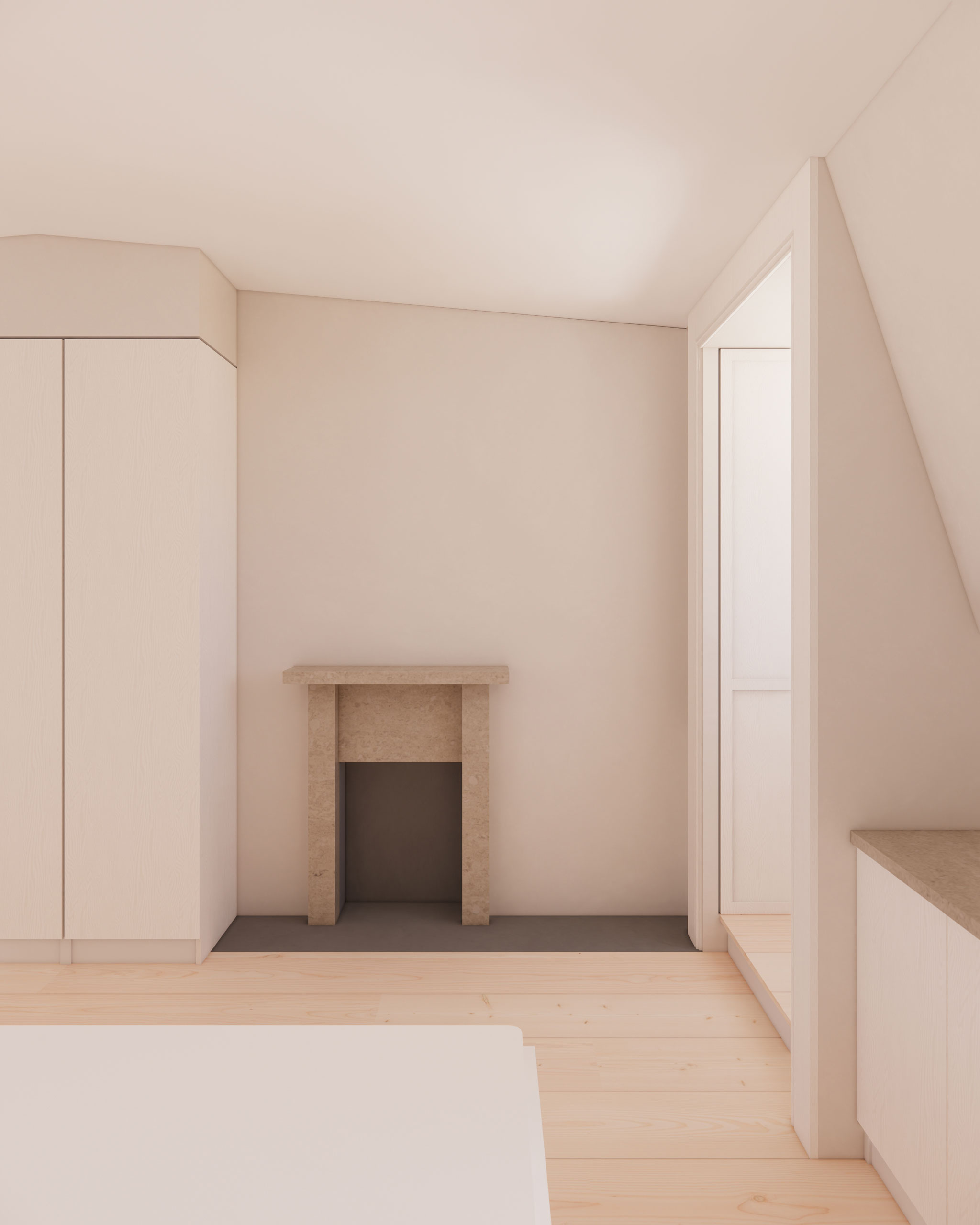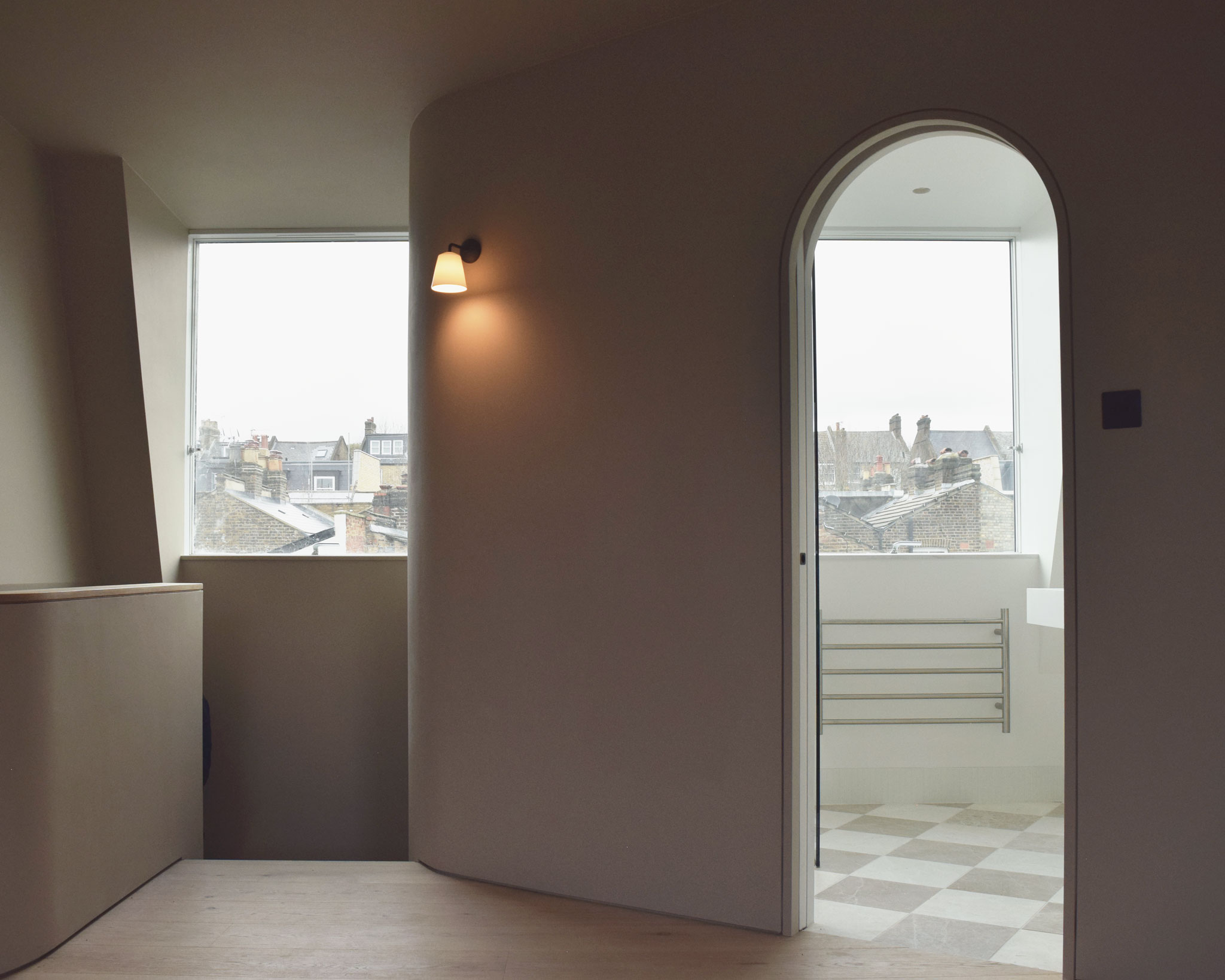 The new level is planned around a single, continuous volume. Positioning the bedroom door at the foot of the stair rather than the top allows the entire floor plate to be read as one space. Clay plaster follows the natural curves of the room; Dinesen Douglas fir flooring introduces warmth and grain. A sculpted bathroom wall defines the wet area without closing it off, and a circular skylight above the shower tracks the arc of the wall. Bespoke shutters, joinery, and a stone fireplace introduce material refinement throughout.