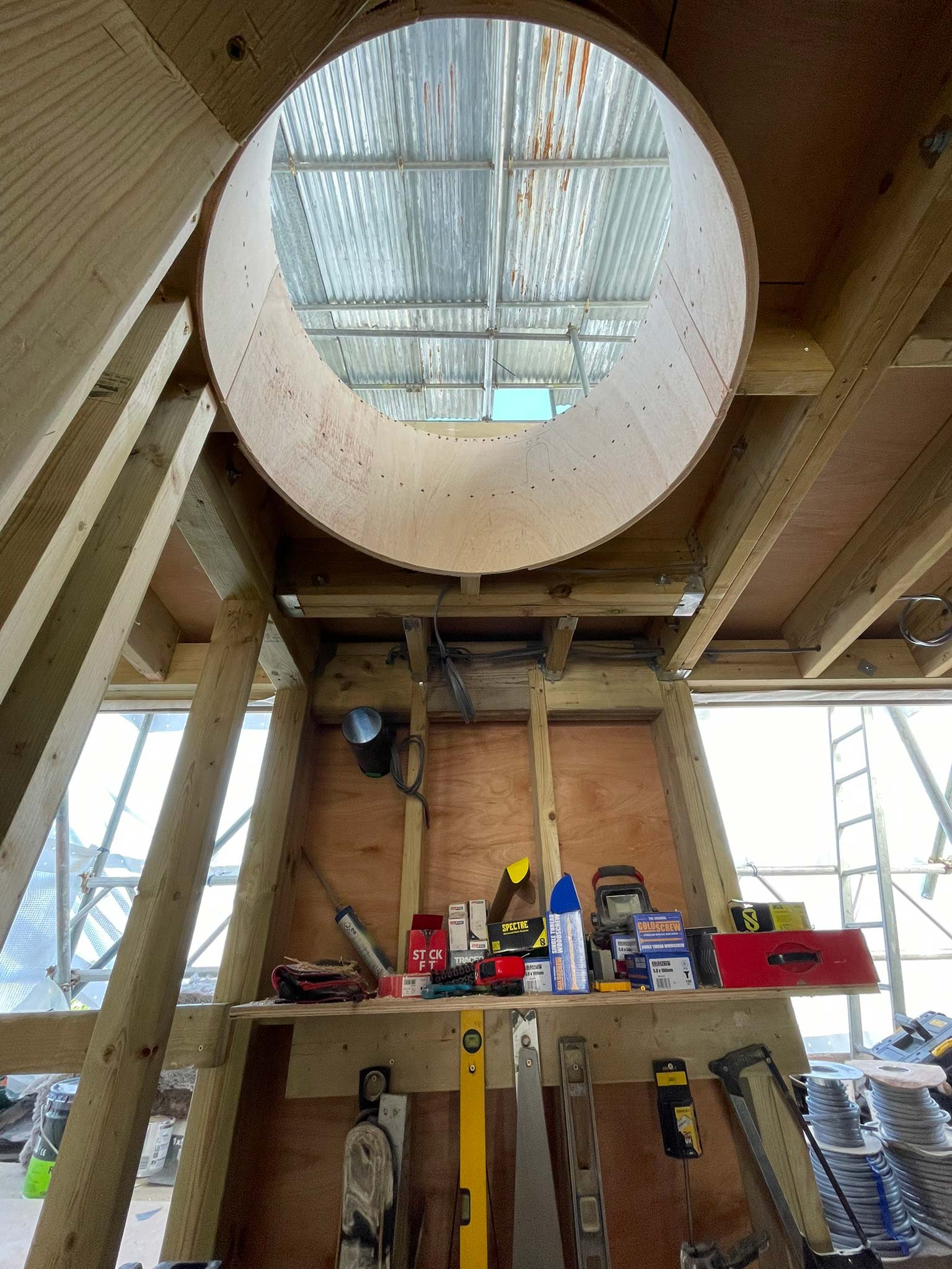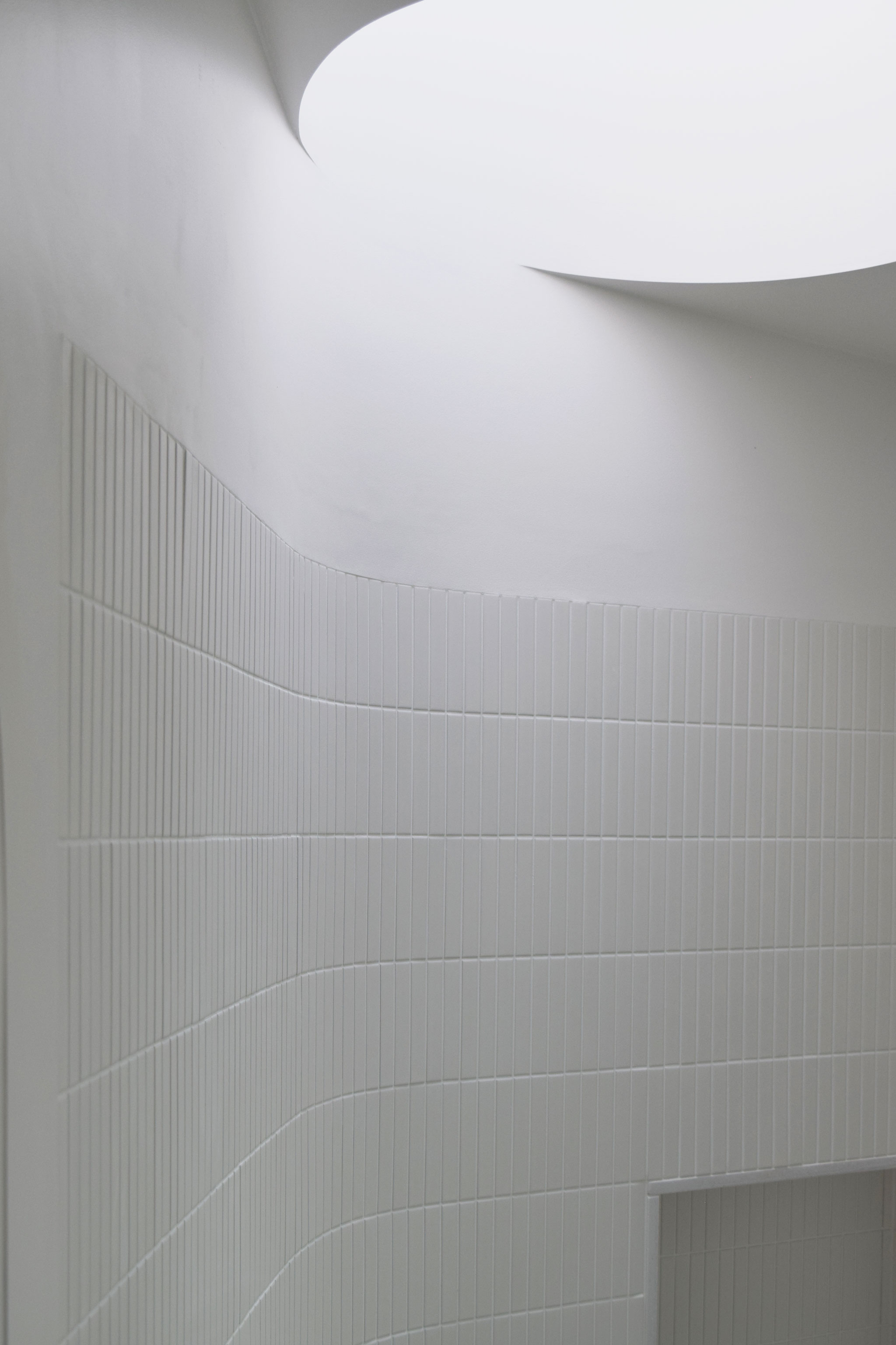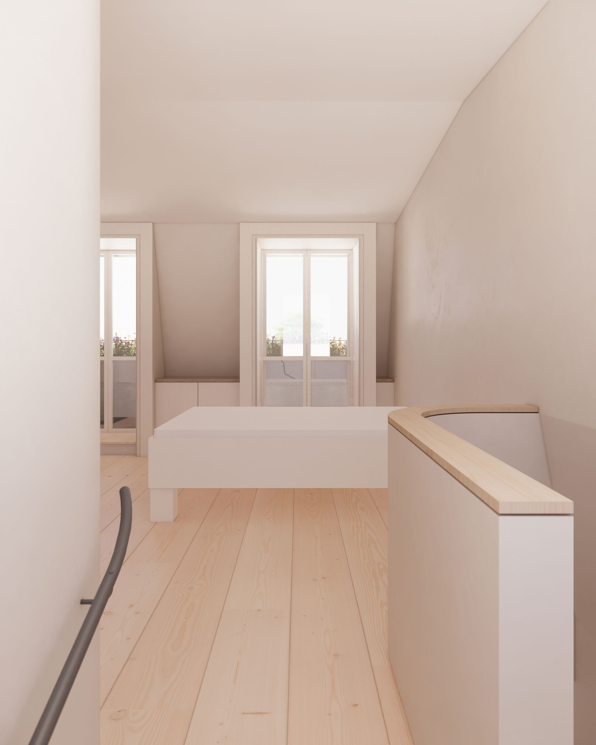 The new level is planned around a single, continuous volume. Positioning the bedroom door at the foot of the stair rather than the top allows the entire floor plate to be read as one space. Clay plaster follows the natural curves of the room; Dinesen Douglas fir flooring introduces warmth and grain. A sculpted bathroom wall defines the wet area without closing it off, and a circular skylight above the shower tracks the arc of the wall. Bespoke shutters, joinery, and a stone fireplace introduce material refinement throughout.