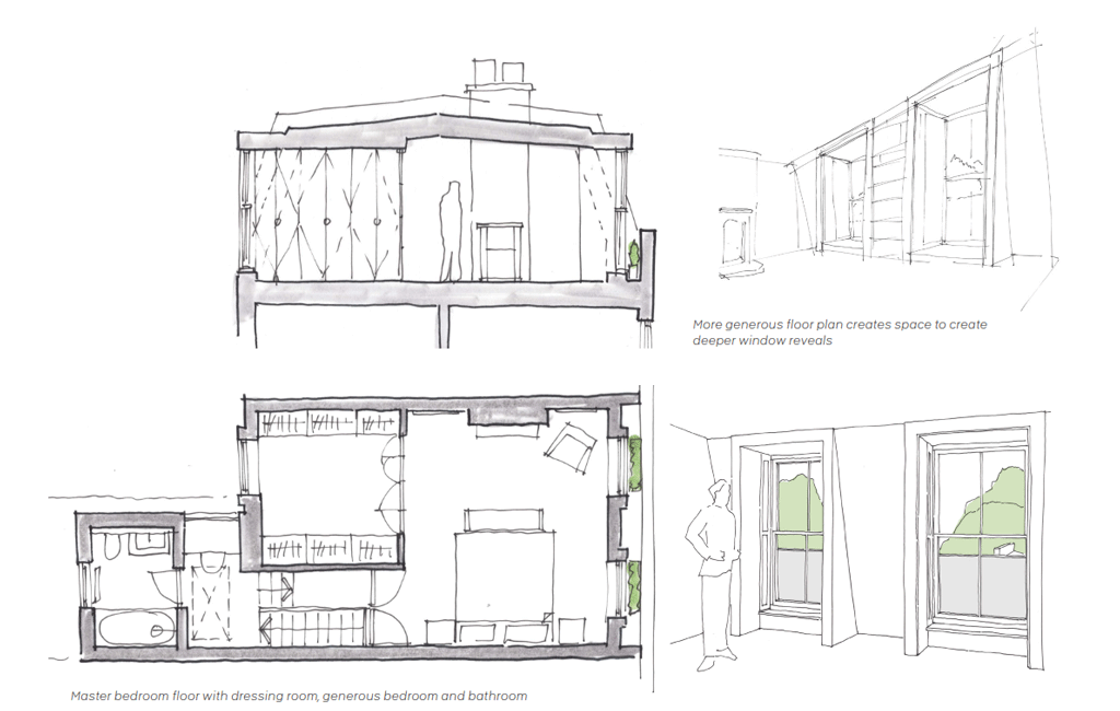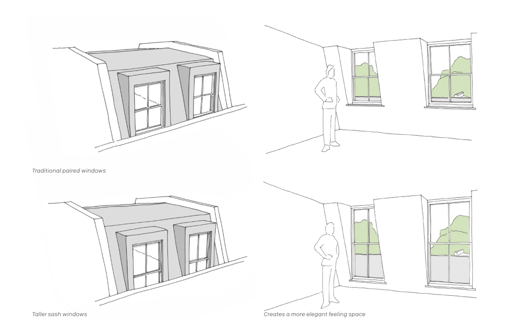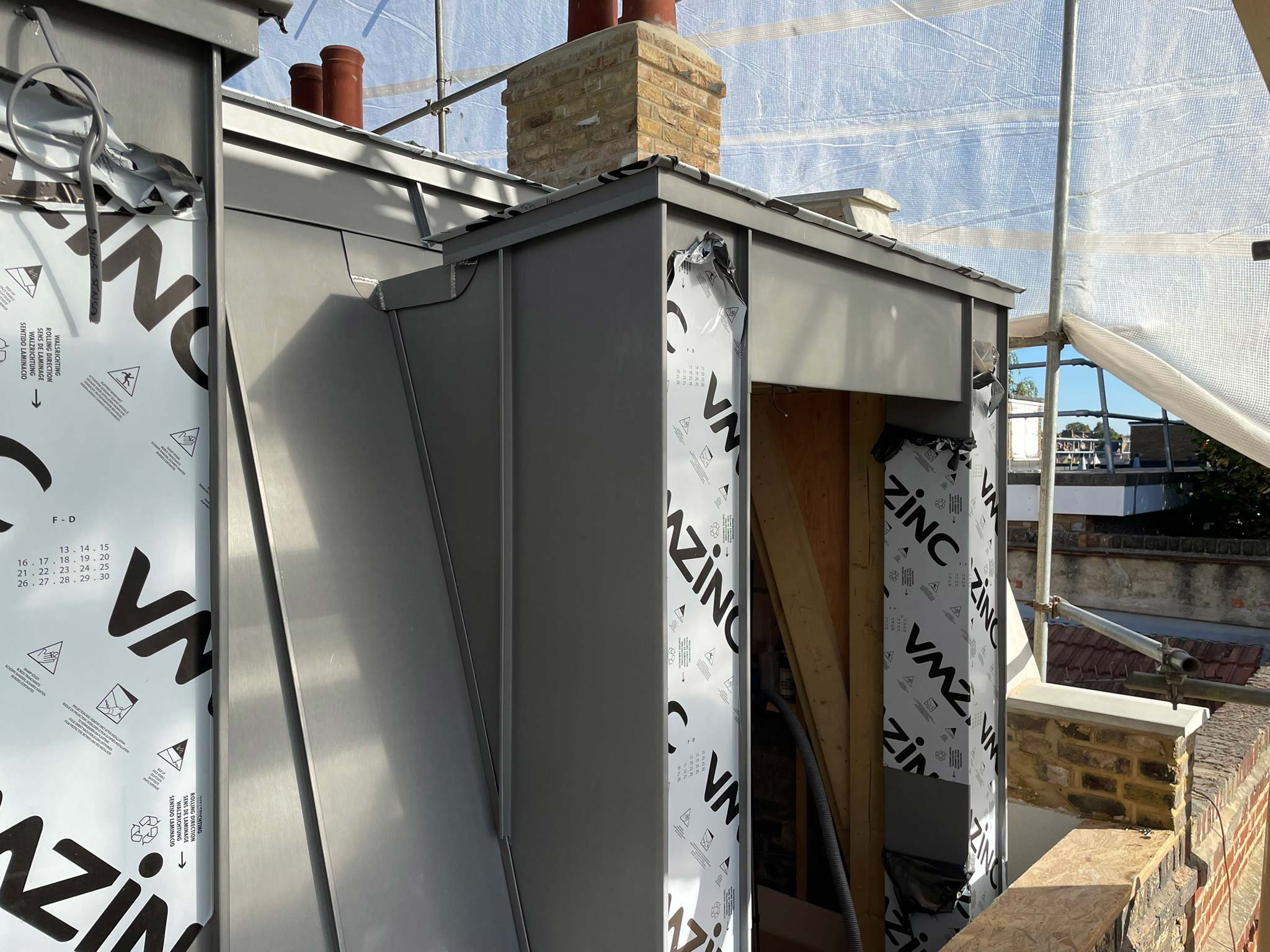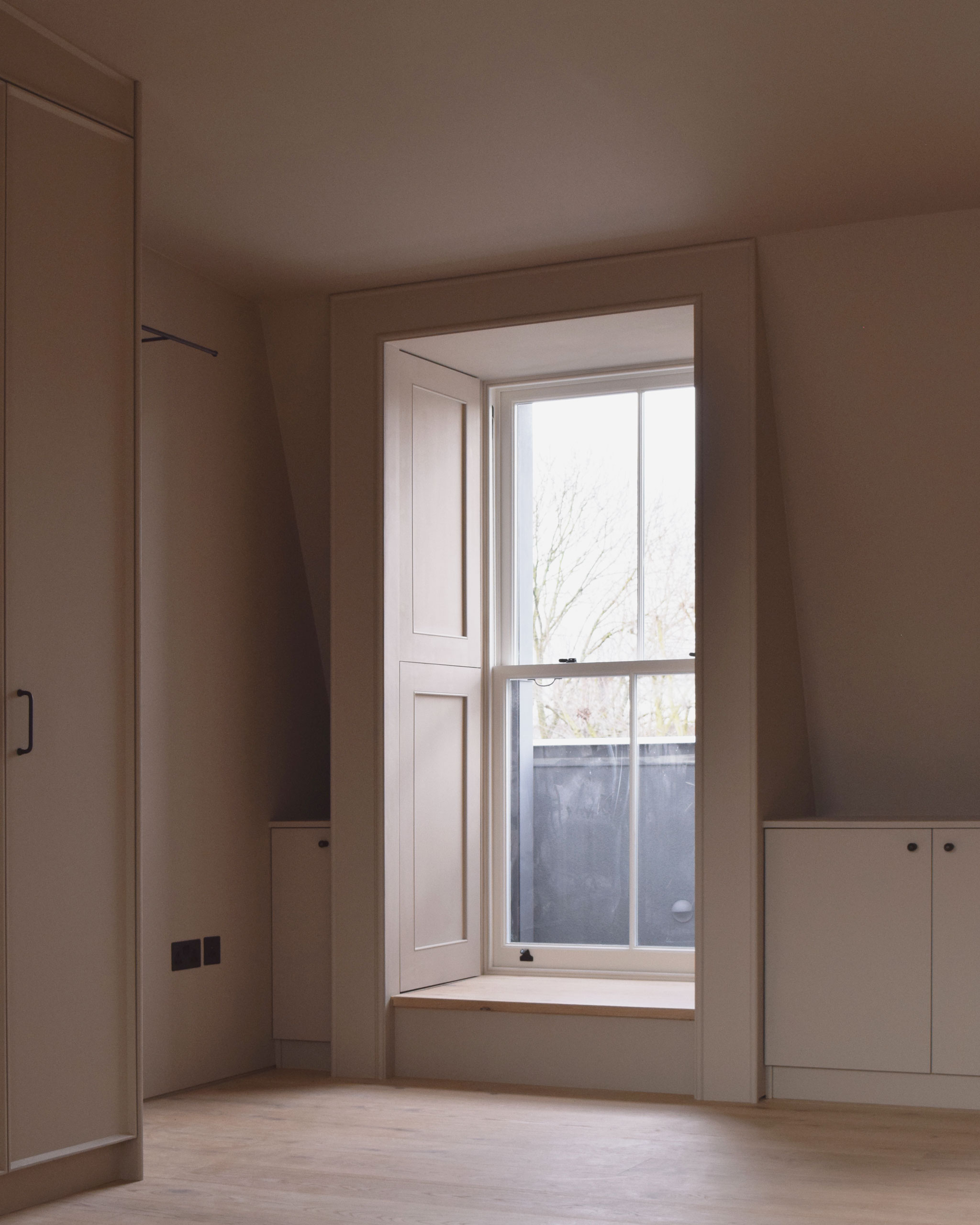 We designed the mansard in mid-grey zinc, tonally close to the natural slate of the street, with timber sash dormers at front and rear sized to match the first-floor windows. That sizing decision drives more than the composition: by matching window to dormer, we eliminate the need for rooflights — no solar gain, no maintenance access, no weak points in the roof. Raised brick party walls with soldier course detailing echo the existing construction, so the addition reads as something the building has always had rather than something placed on top.