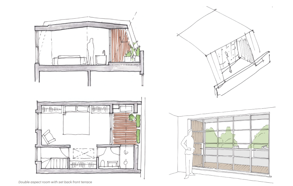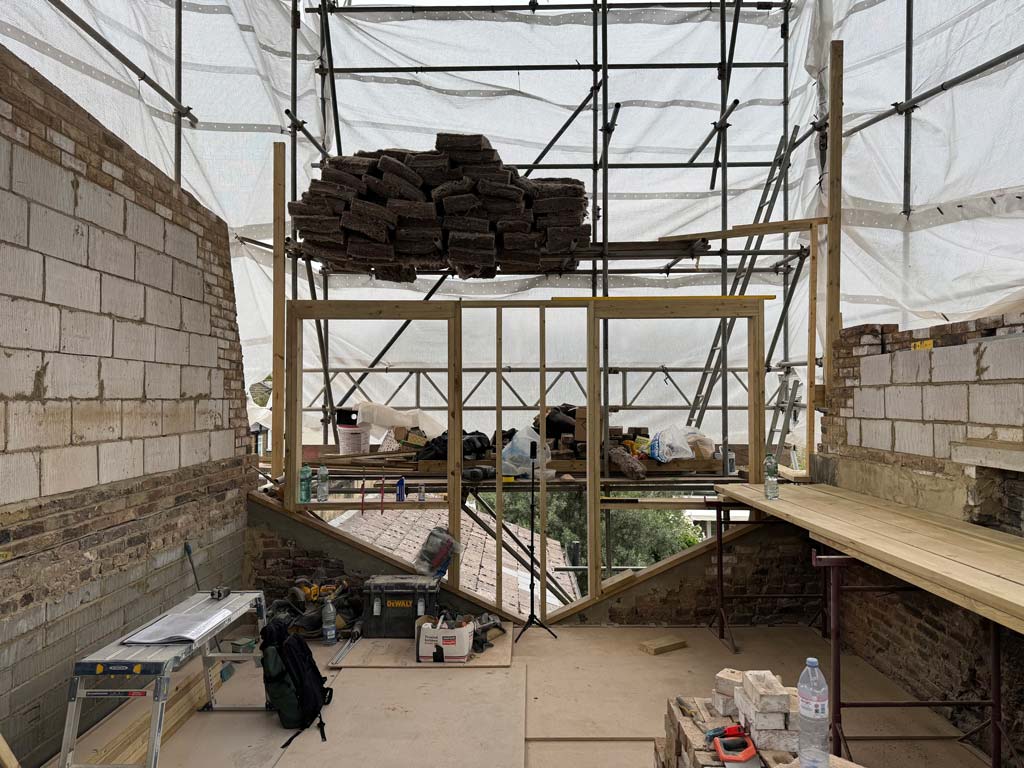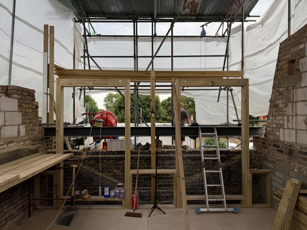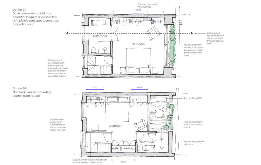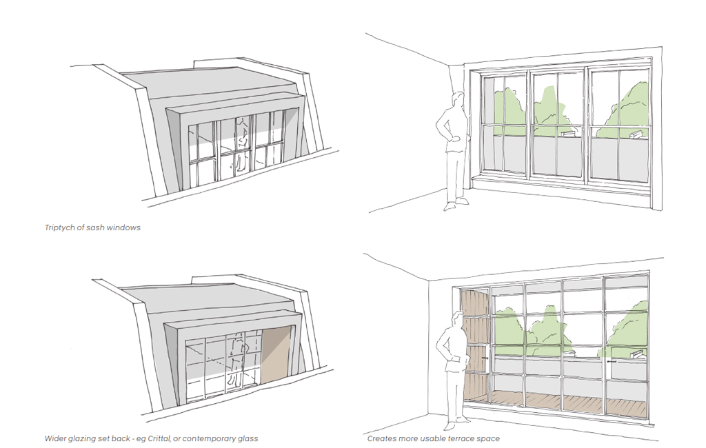 We designed the mansard in mid-grey zinc, tonally close to the natural slate of the street, with timber sash dormers at front and rear sized to match the first-floor windows. That sizing decision drives more than the composition: by matching window to dormer, we eliminate the need for rooflights — no solar gain, no maintenance access, no weak points in the roof. Raised brick party walls with soldier course detailing echo the existing construction, so the addition reads as something the building has always had rather than something placed on top.